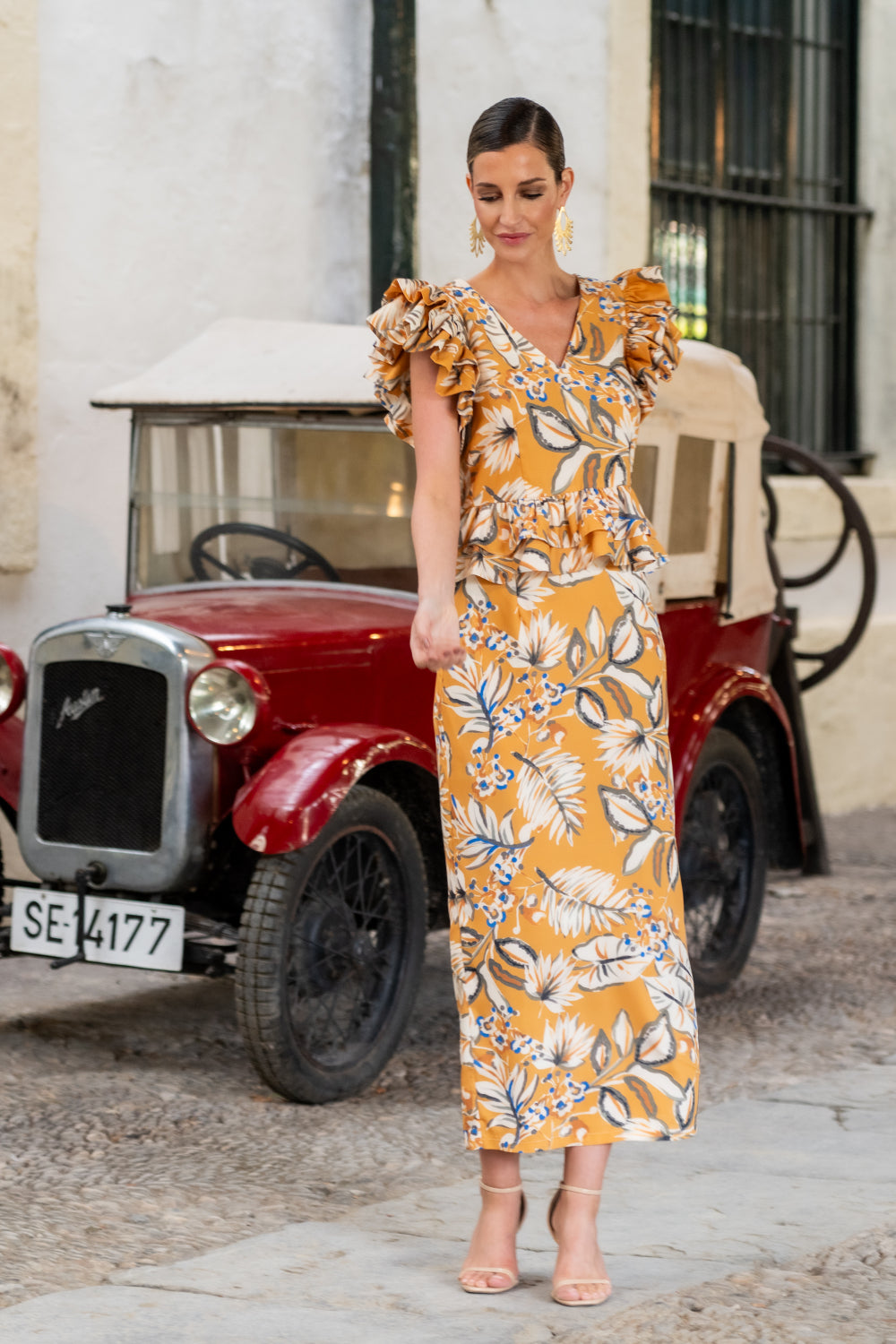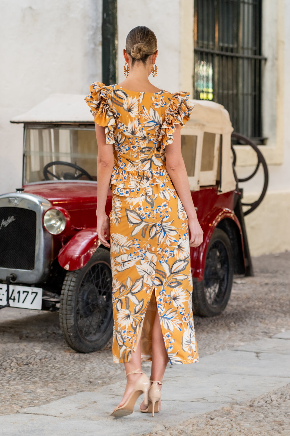 Falda mostaza estampada con flores blancas y azules, recta largo midi.