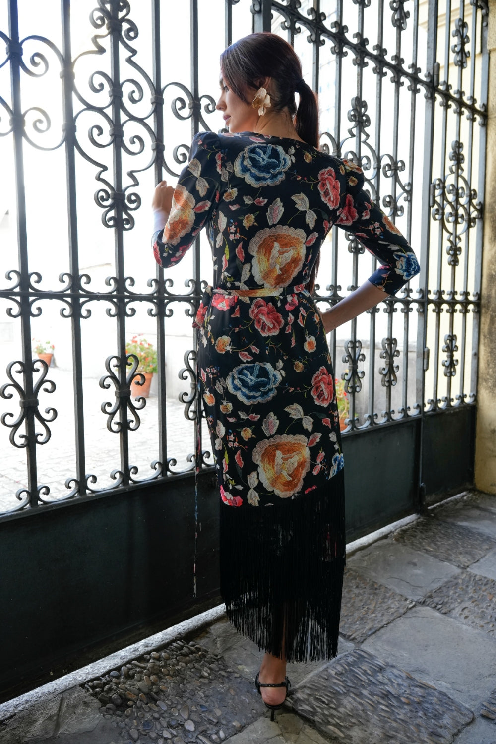 Vestido Macarena con estampación de Mantón negro bordado en colores, cruzado manga francesa y doble filo de flecos negros a tono Káhyra.