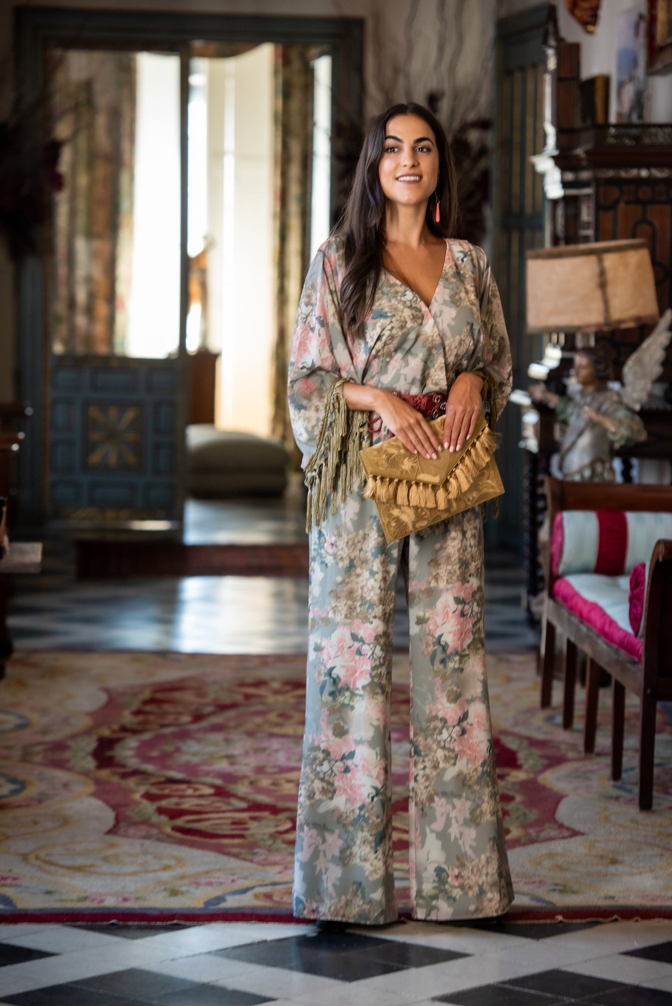 Bolso tablao beige tipo sobre bordado con flores al tono con borlones de fleco en la solapa.