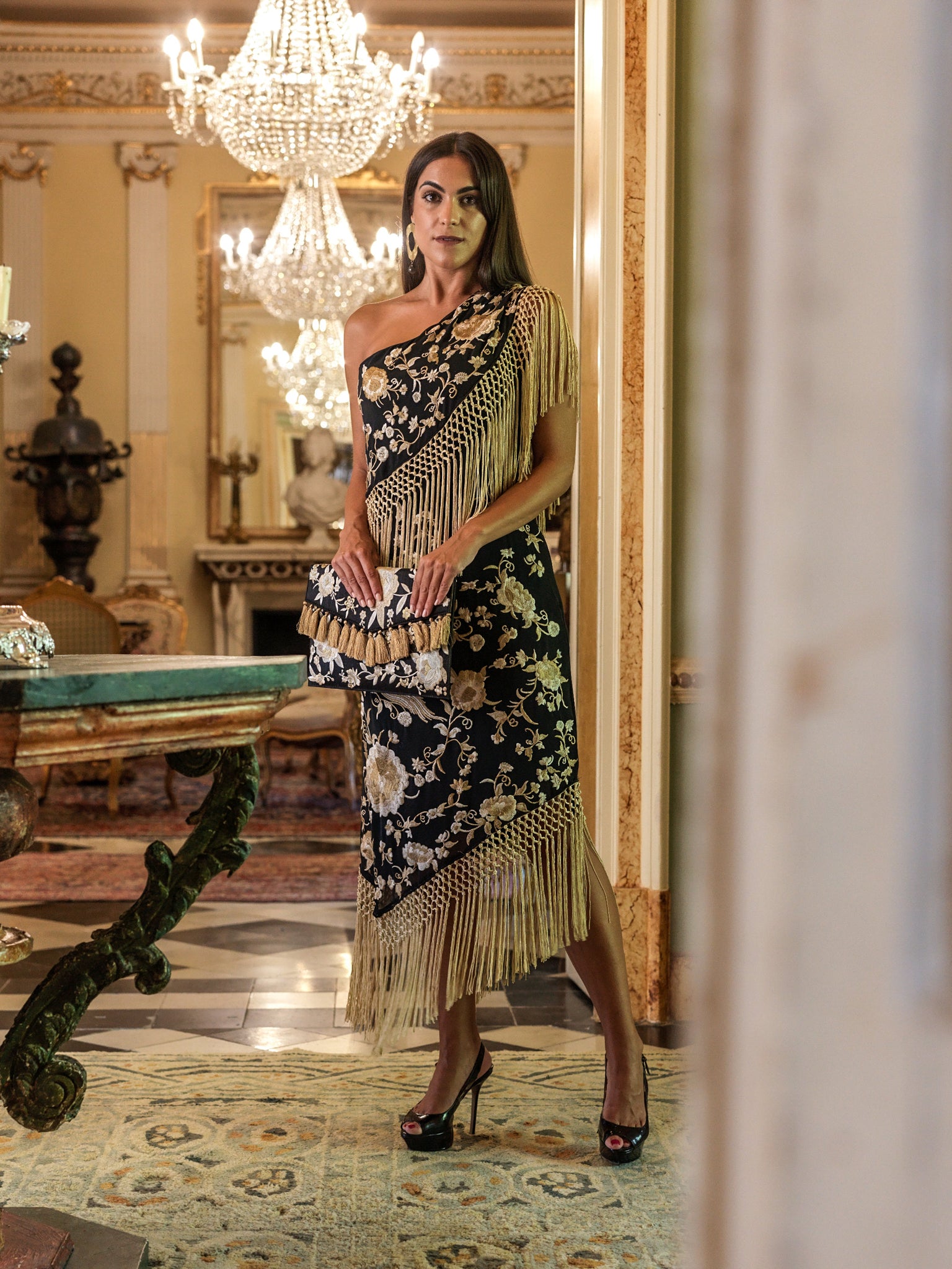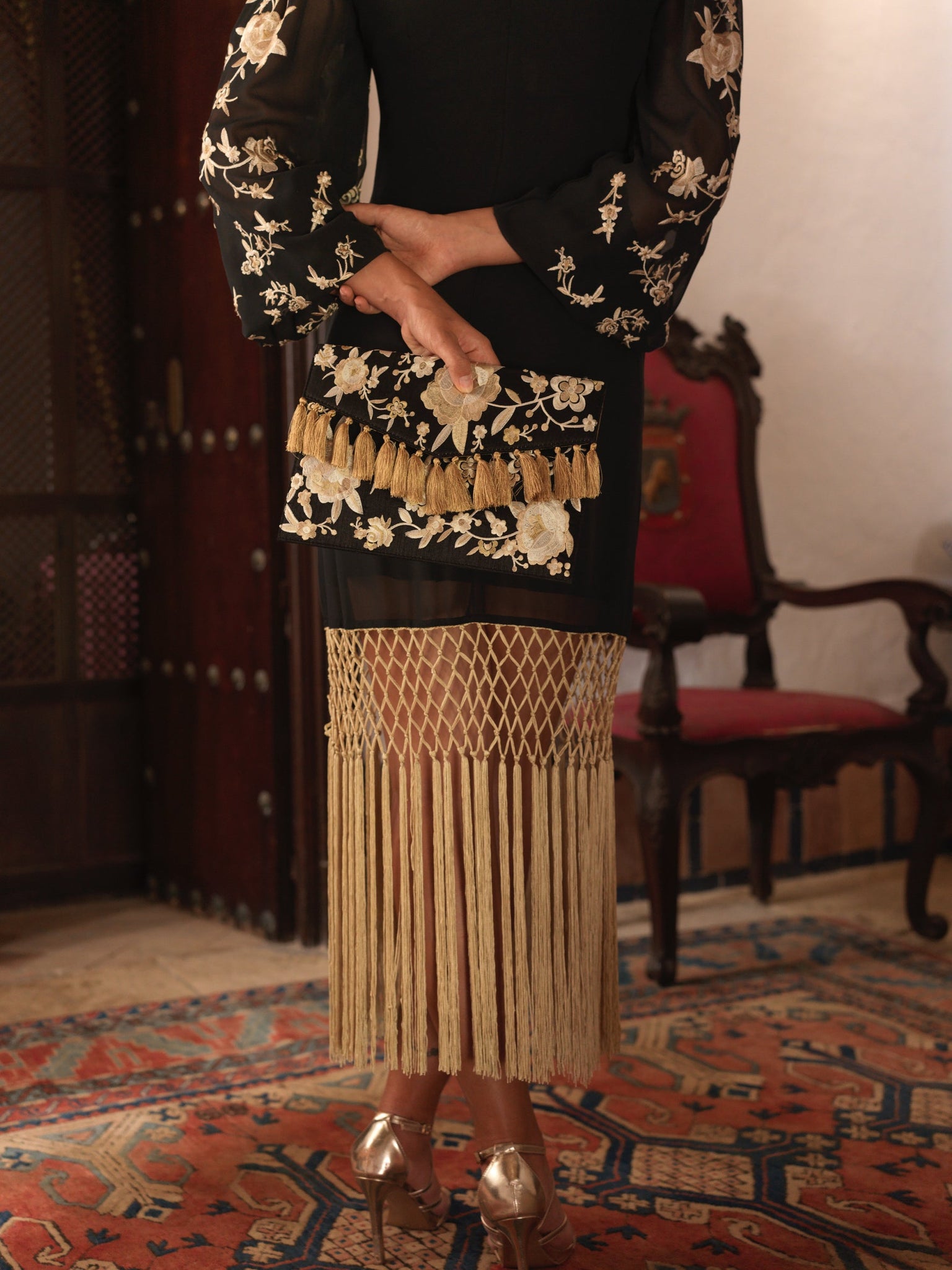 Bolso tango negro tipo sobre bordado en mantón beige con borlones de flecos beige en la solapa.