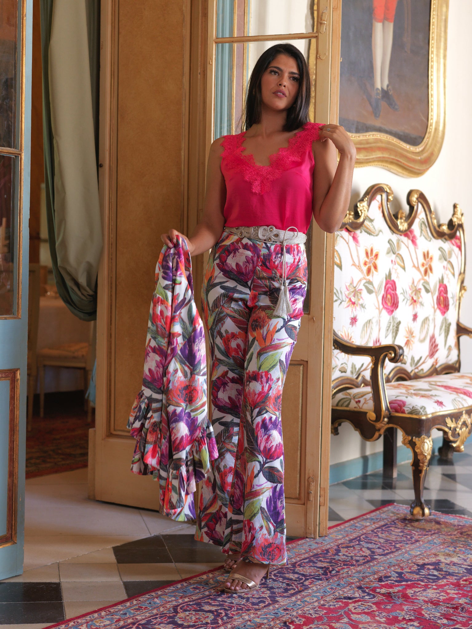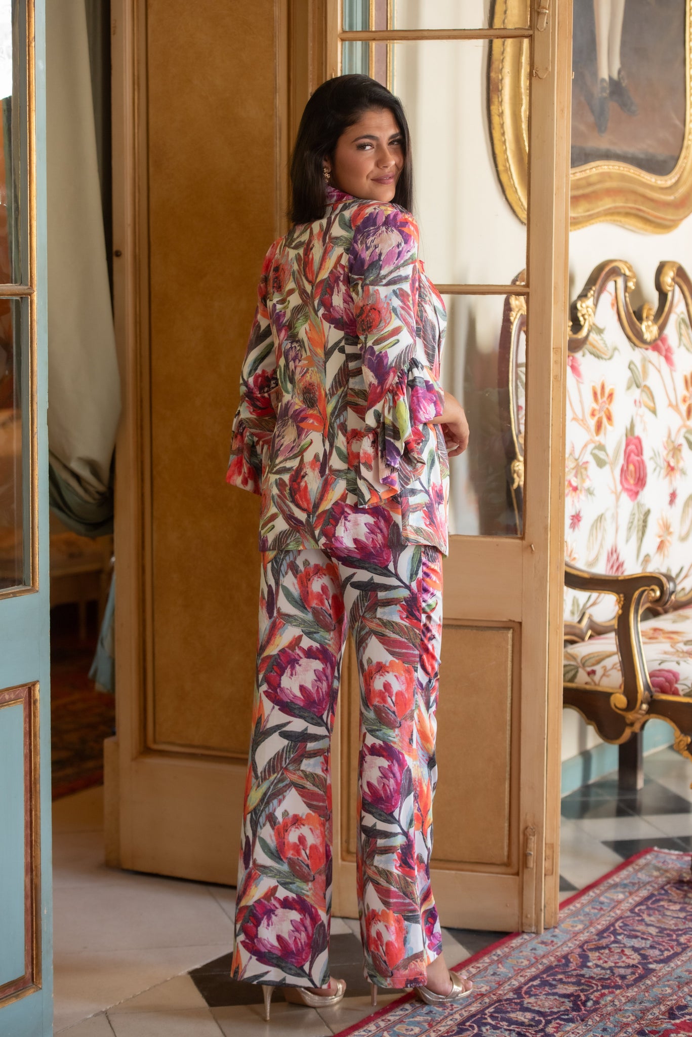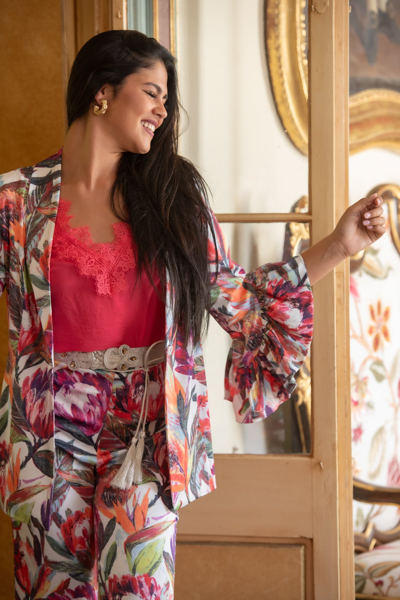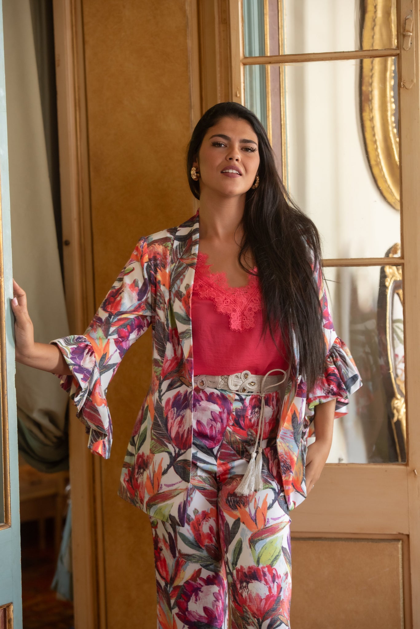 Chaqueta victoria botanic en satén de fondo blanco estampado con flores fucsia y coral cuello esmoquin abrochada con un botón y mangas con volante asimétrico fruncido.
