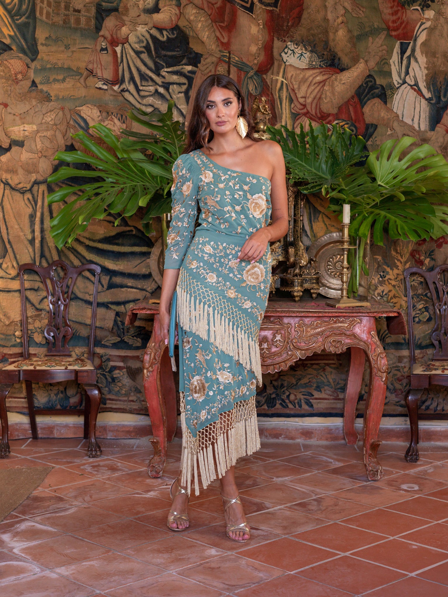 Falda alboreá mantón verde agua de gasa con motivos florales beige. Terminada en forma asimétrica con doble falda terminada en flecos enrejados beige.