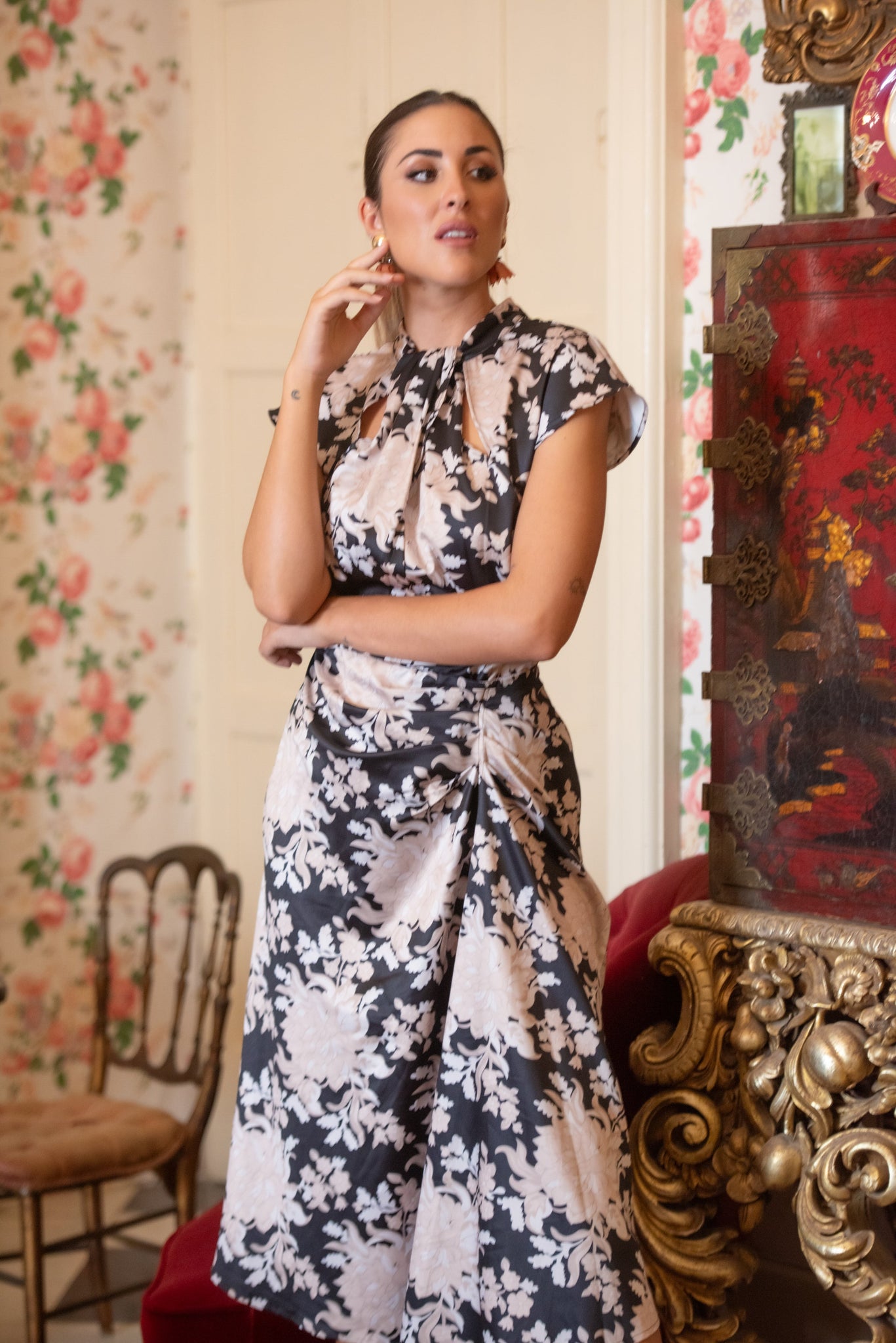 Falda marian flor en satén con fondo negro y grandes flores en tonos beige y tostado. Recogida como un falso pareo con tablas.