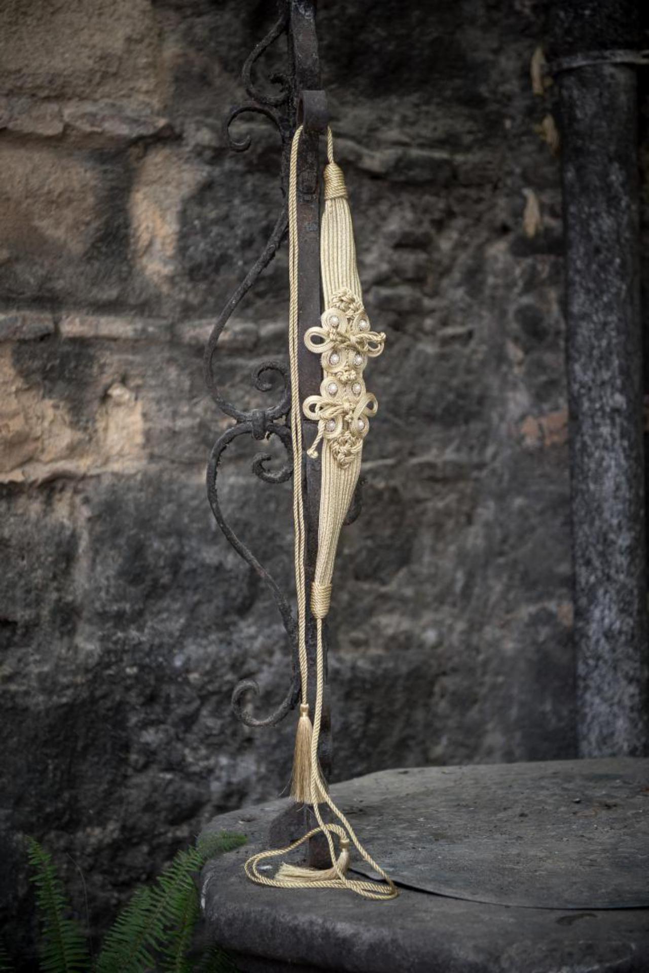 Cinturon de hilo metalizado dorado con adorno de cintas formando una flor y apliques de perlas