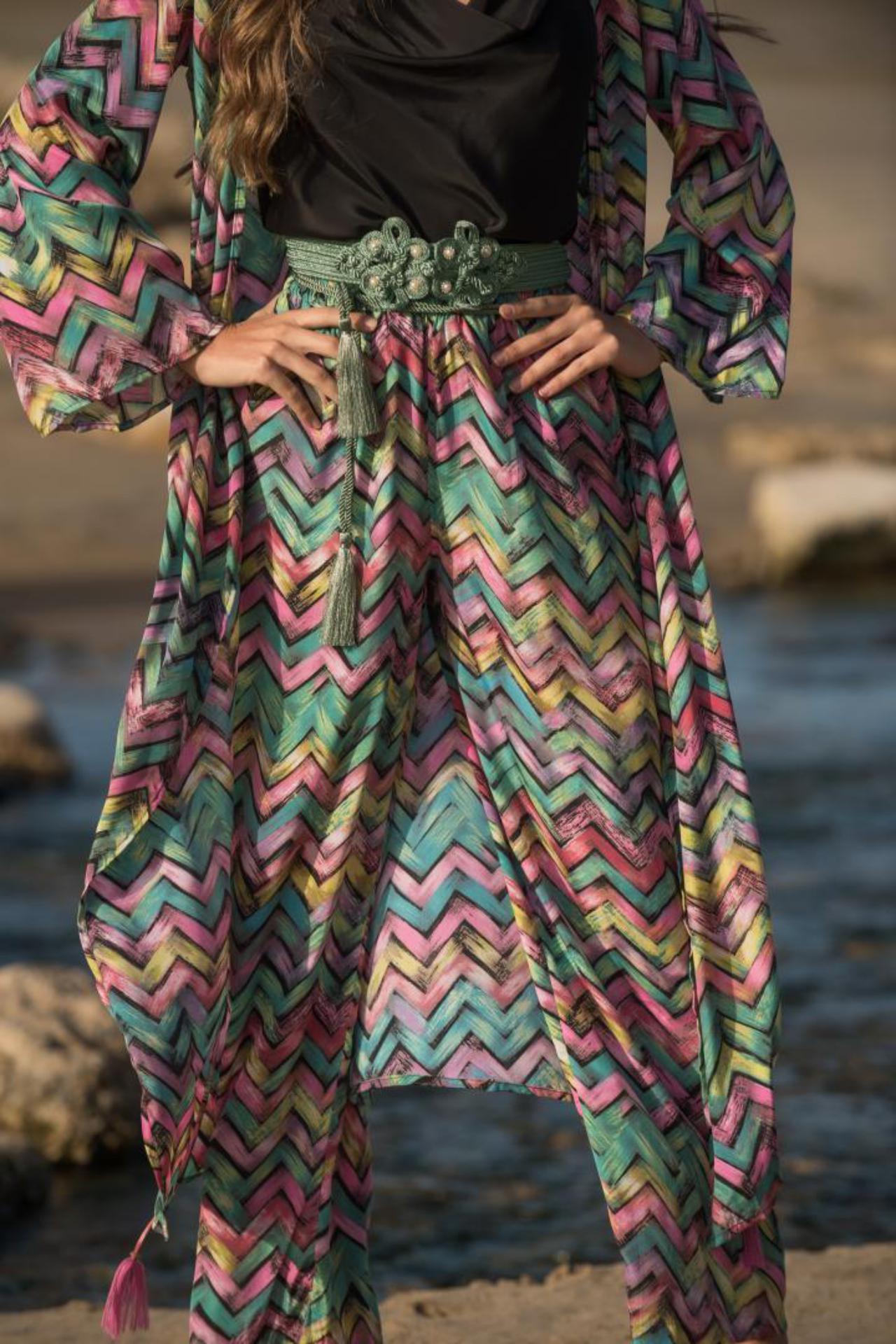 Cinturon de hilo metalizado verde con adorno de cintas formando una flor y apliques de perlas