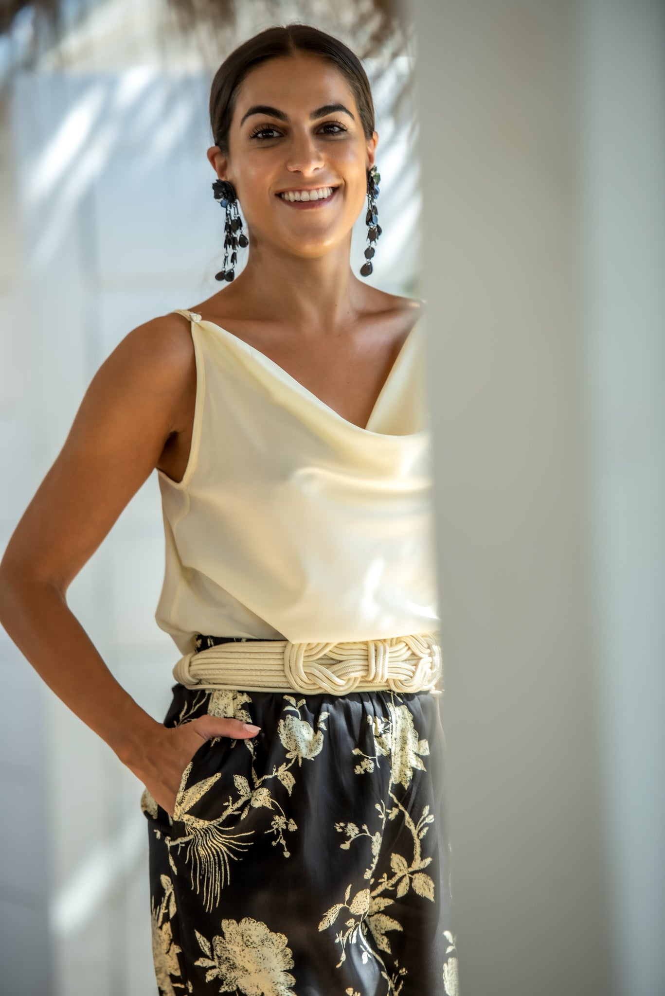 Cinturón hilo metalizado doble nudo rizo crudo.