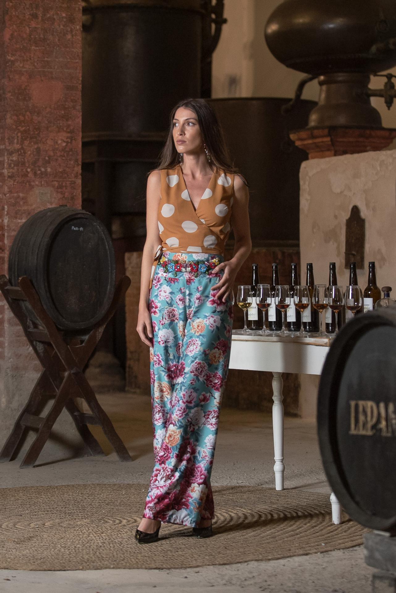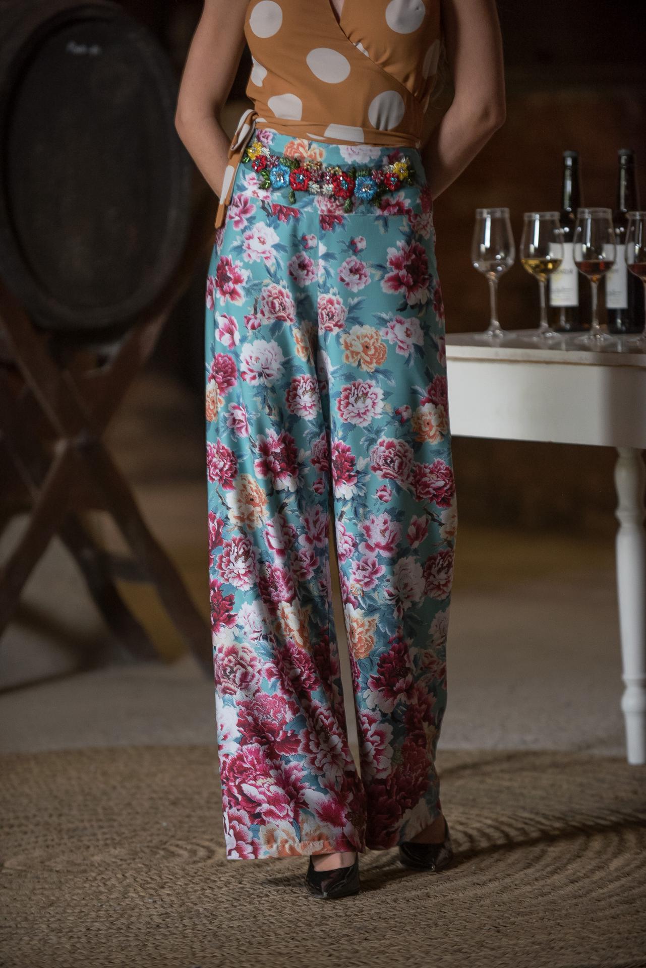 Pantalón en satén pata ancha con bordada a juego con el estampado turquesa con peonias rosas