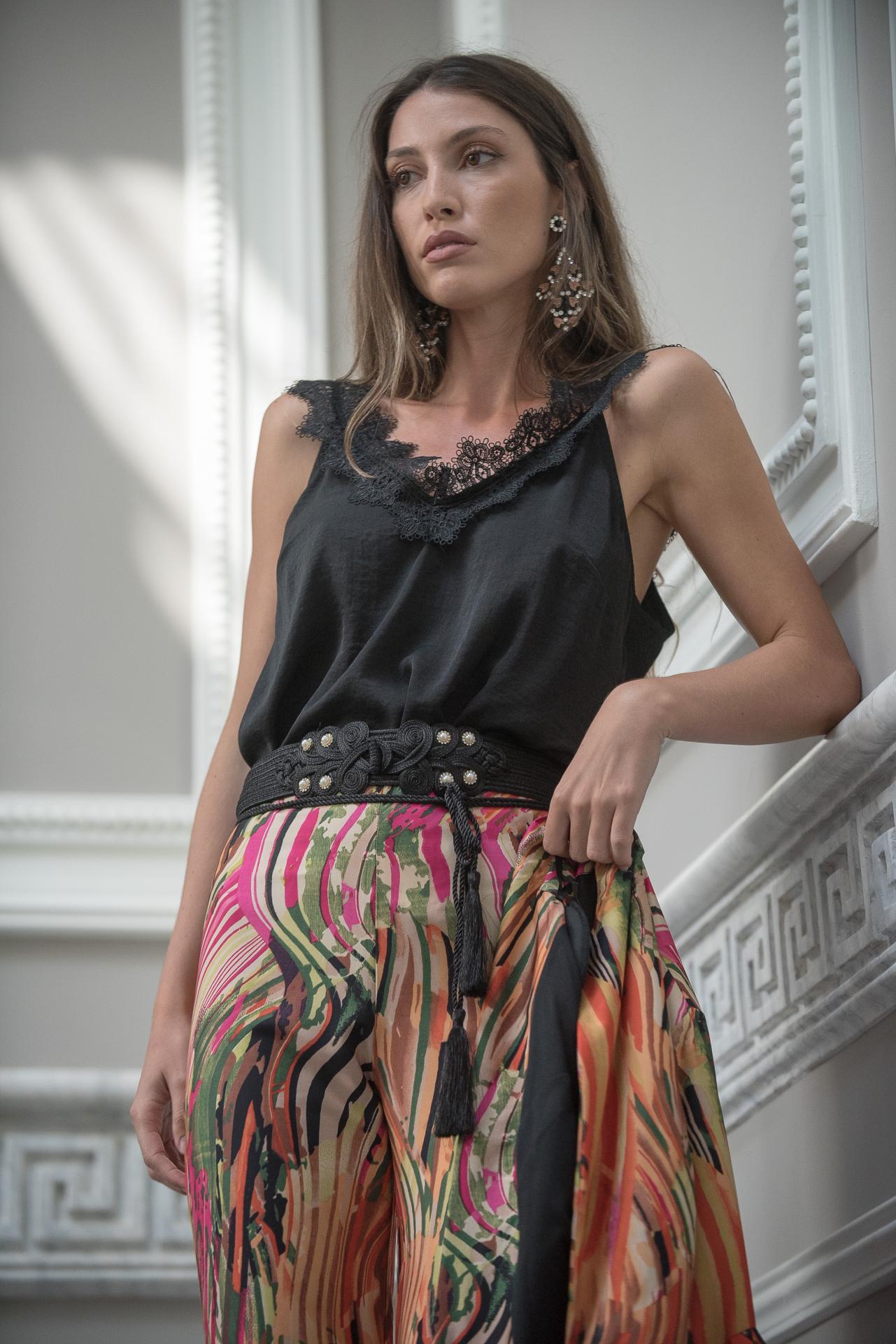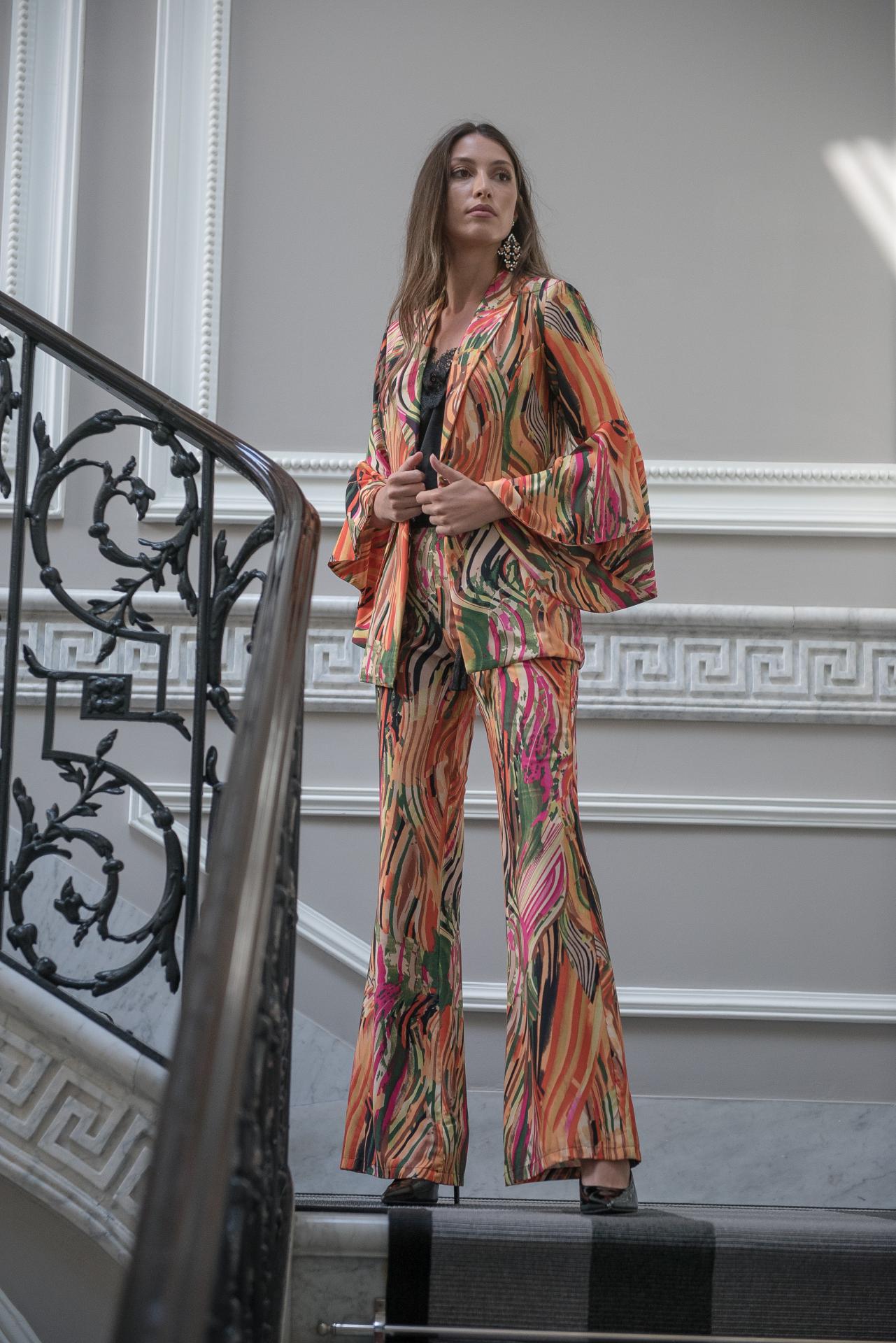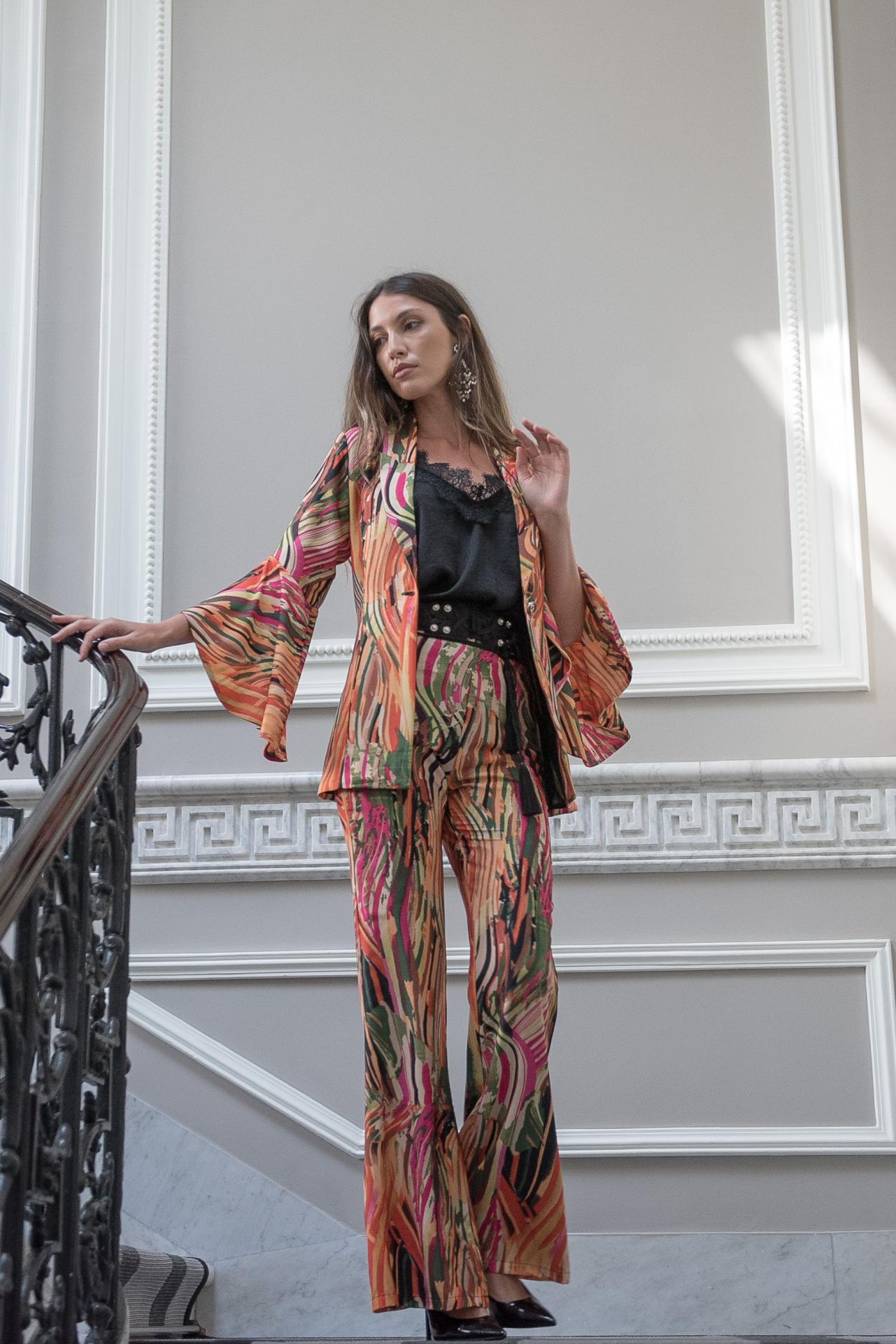 Pantalón en satén de campana con estampado haciendo trazos pintados en colores amarillos verdes naranjas negros