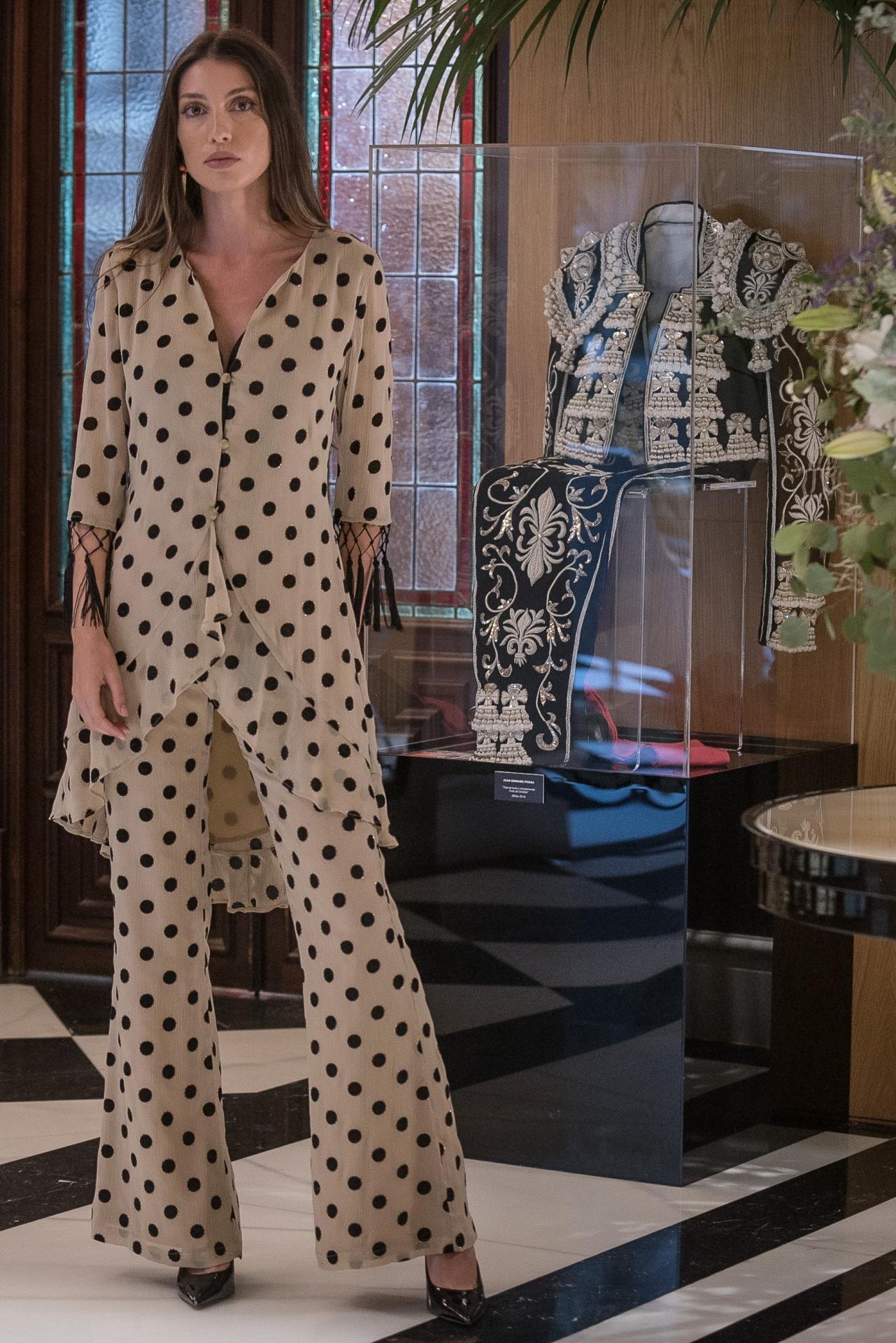 Pantalón de campana en gasa beige con lunares flocado en tono negro
