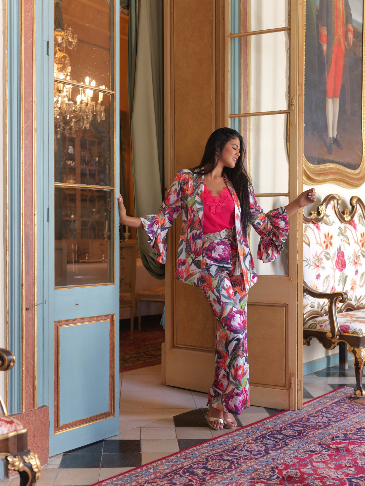 Pantalón victoria botanic en satén de campana con fondo blanco estampado con flores fucsia y coral.