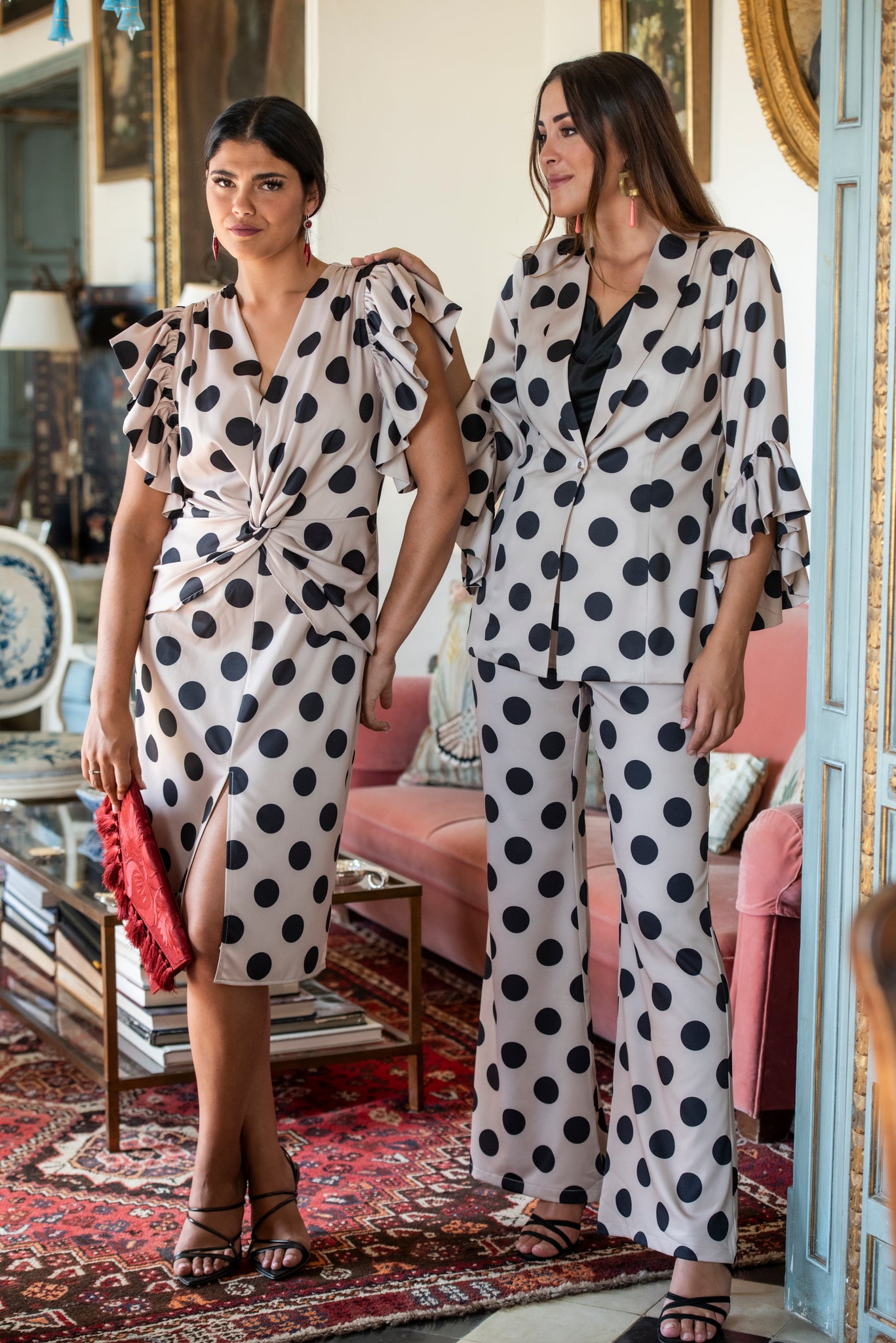 Pantalón victoria lunares en satén de campana con fondo crudo estampado con lunares negros.