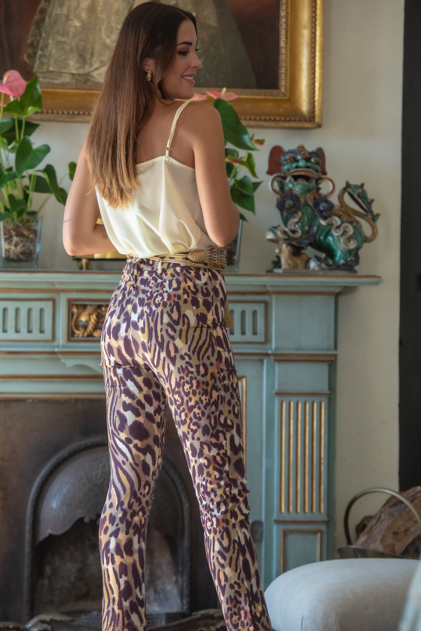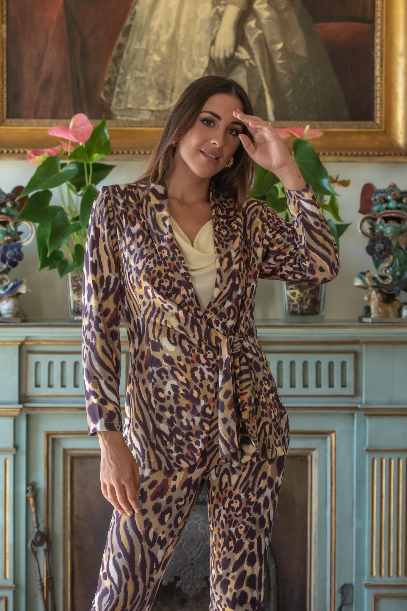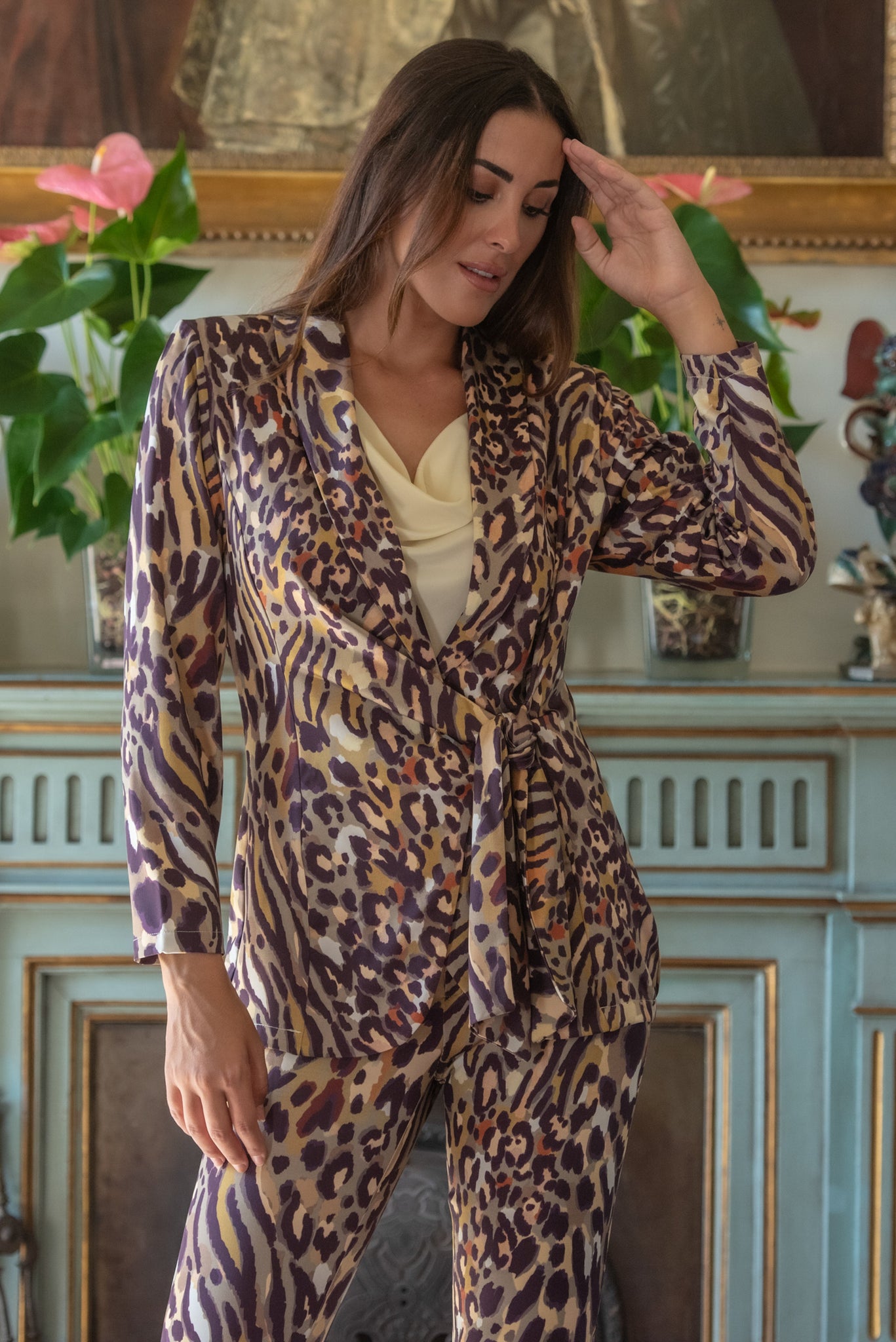 Pantalón aurora salvaje en satén animal print de leopardo en tonos verdes - beige y marrones recto con largo midi y abertura en el lateral.