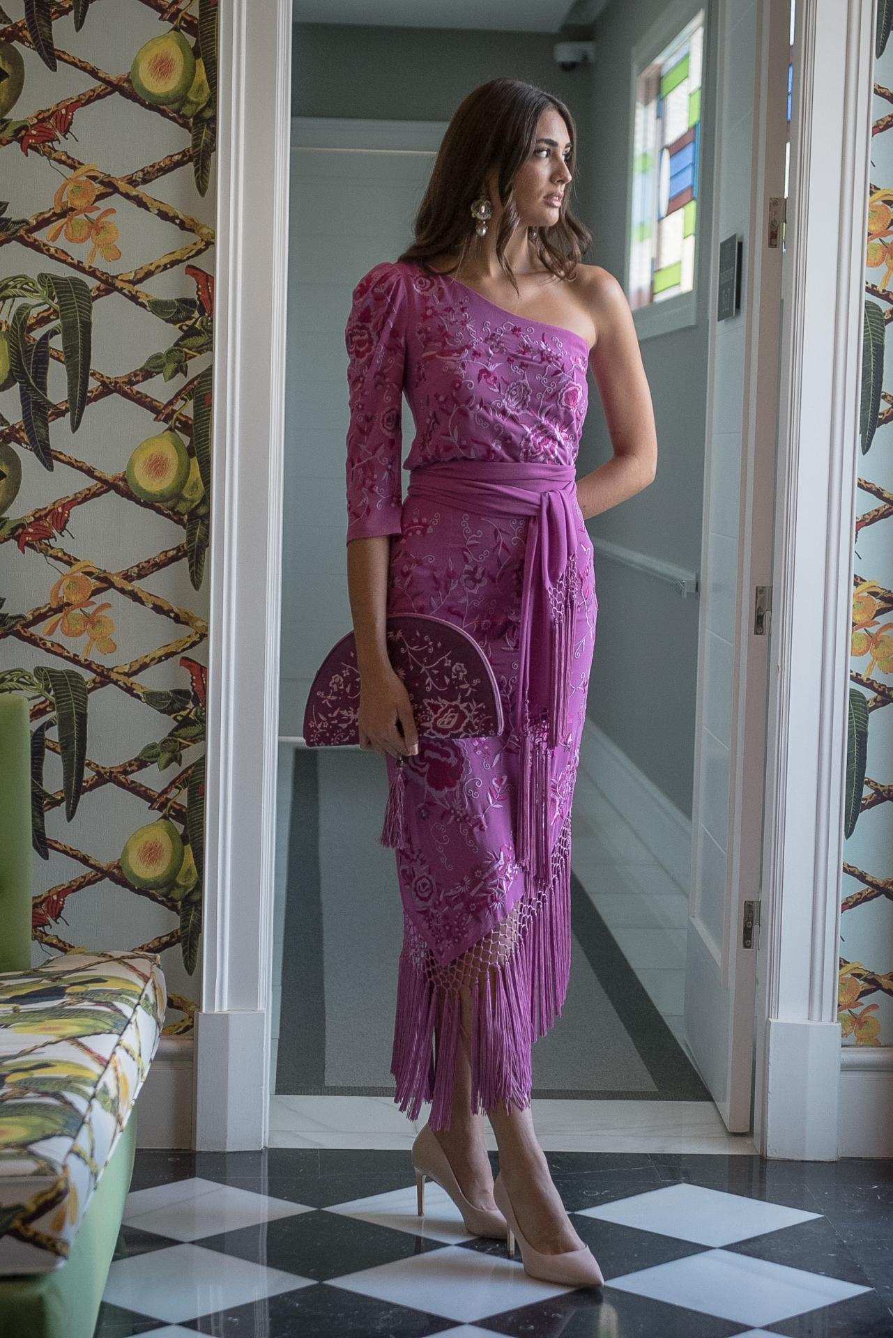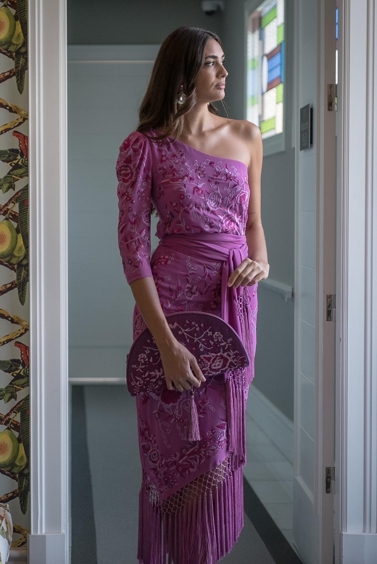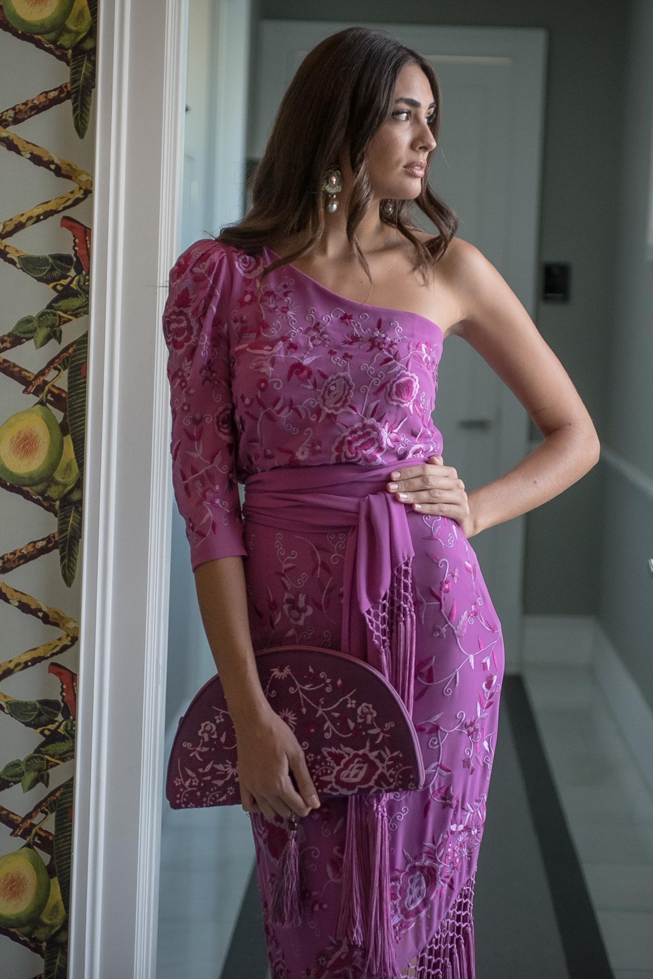 Top asimétrico con una manga en gasa lila bordada al tono como un mantón de manila