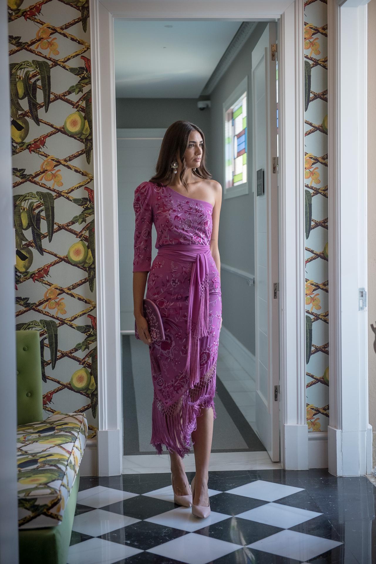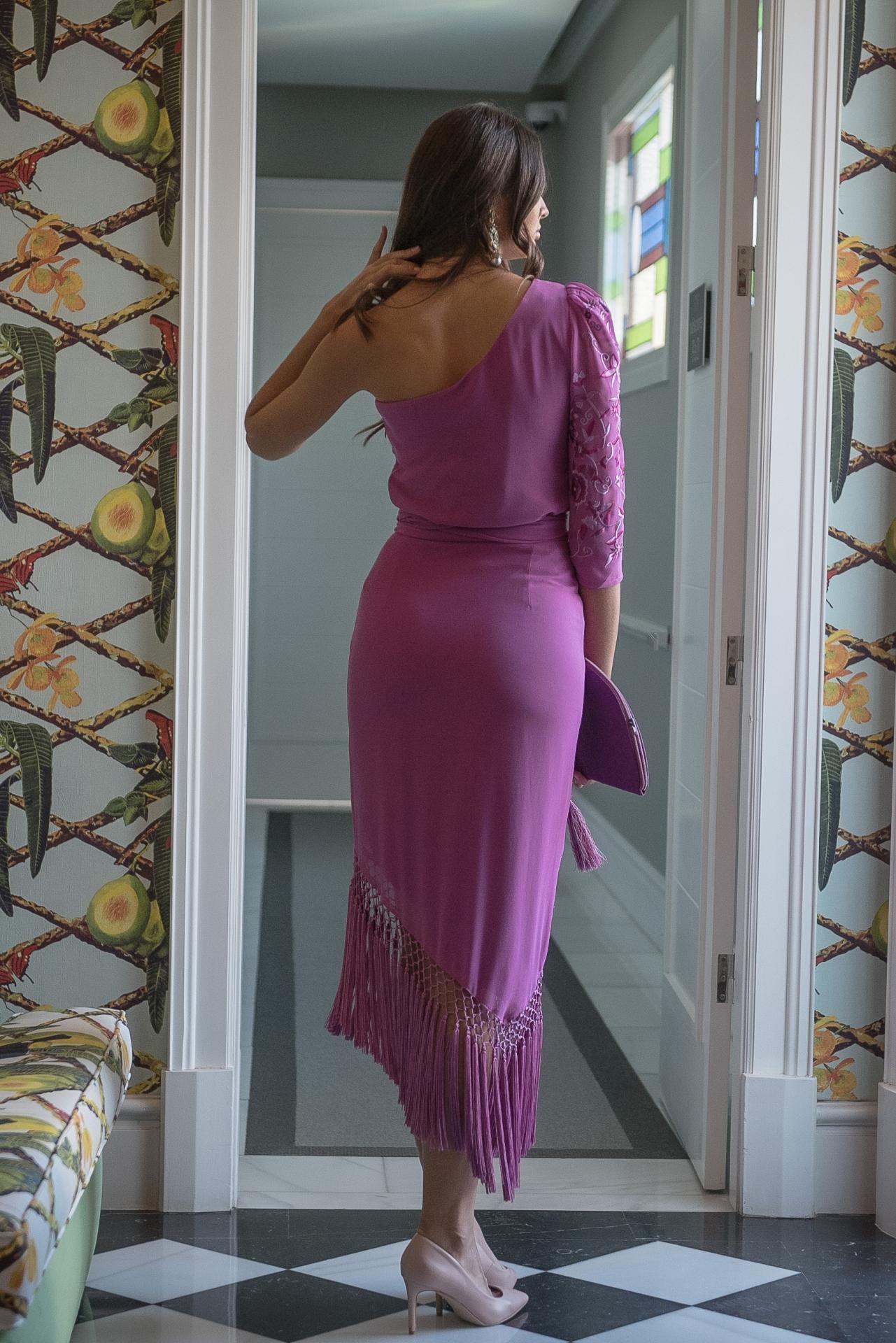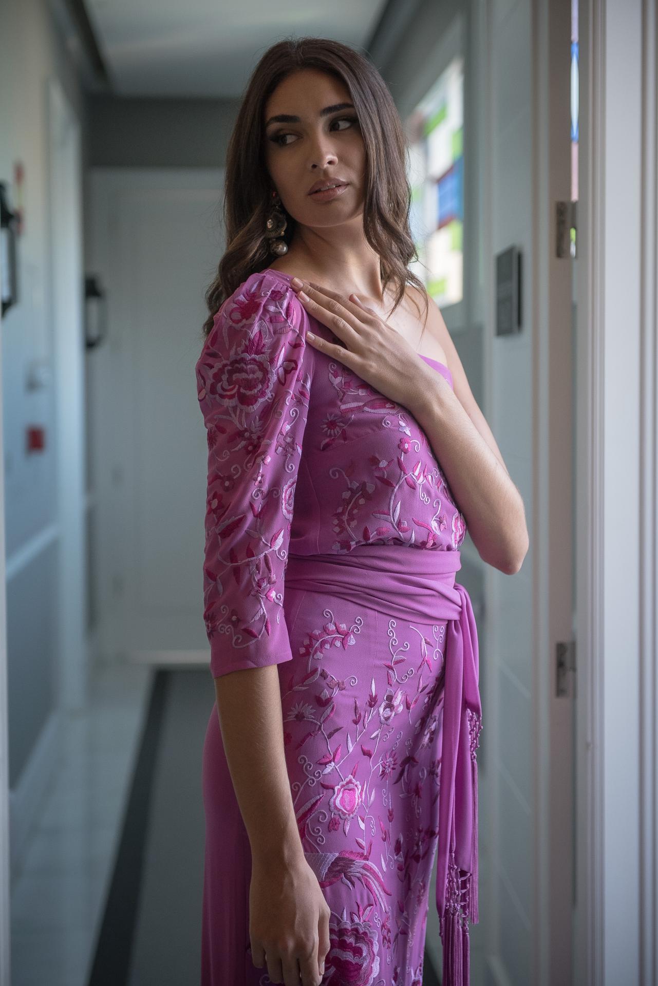 Top asimétrico con una manga en gasa lila bordada al tono como un mantón de manila