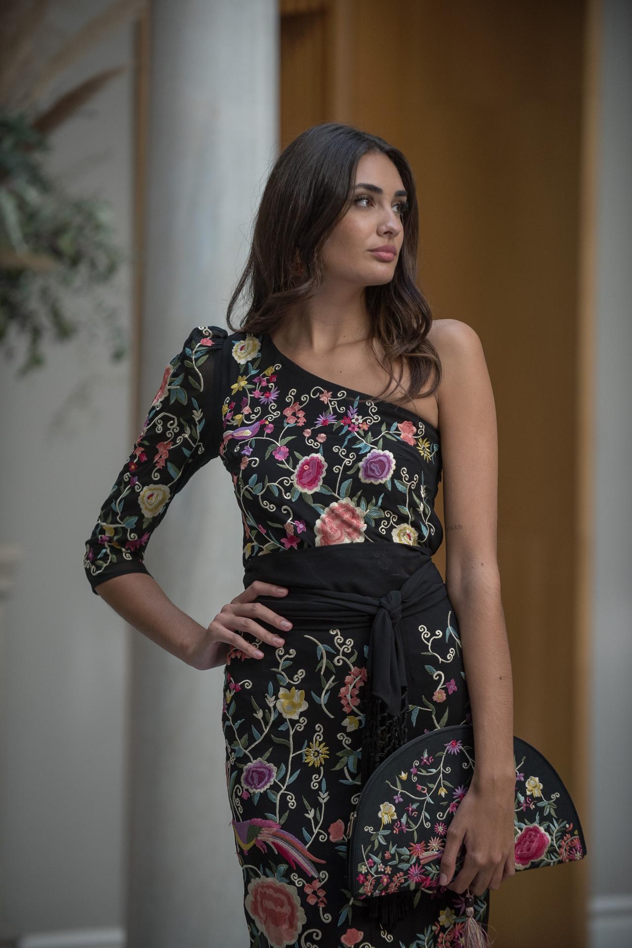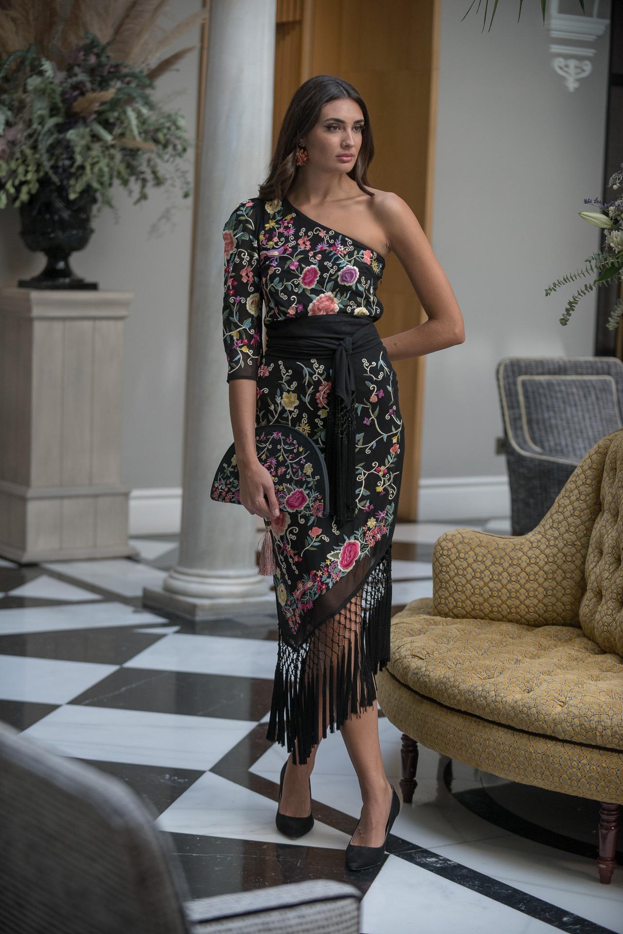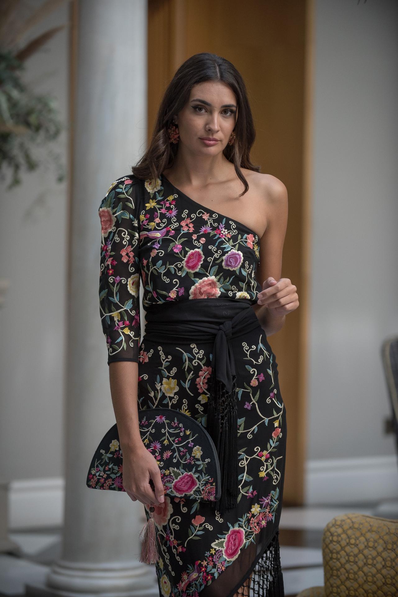 Top asimétrico con una manga en gasa negra bordada al tono como un mantón de manila