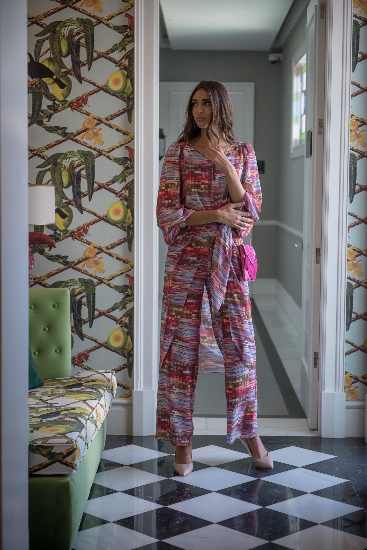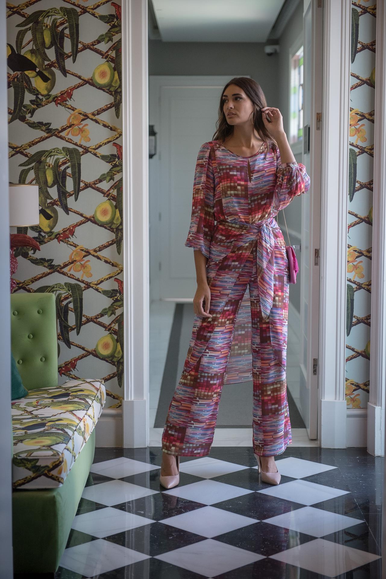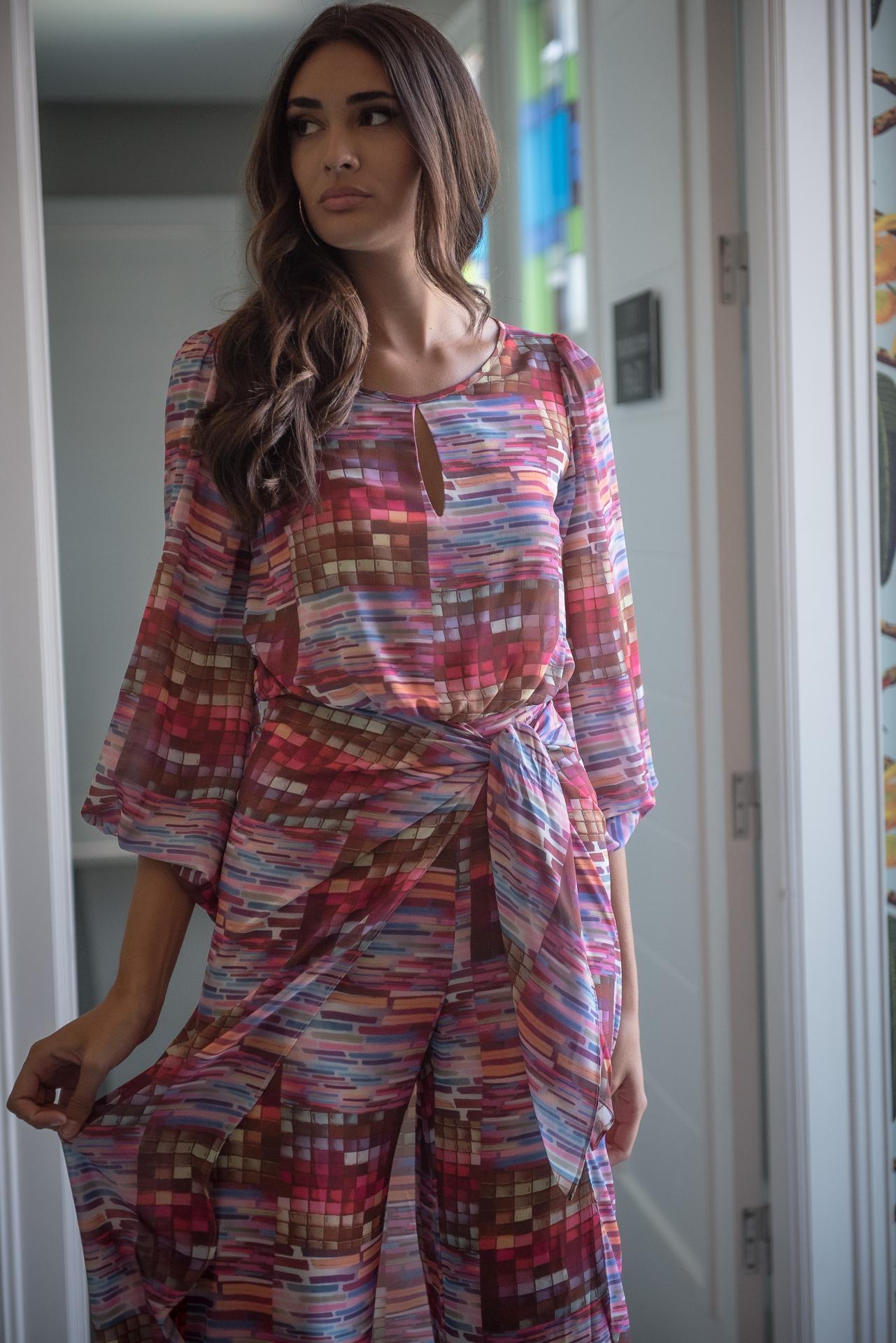 Mono de gasa con manga abullonada escote lagrima y falsa falda pareo anudada en la cintura con estampado tipo mosaico en tonos rosas y malvas y azules