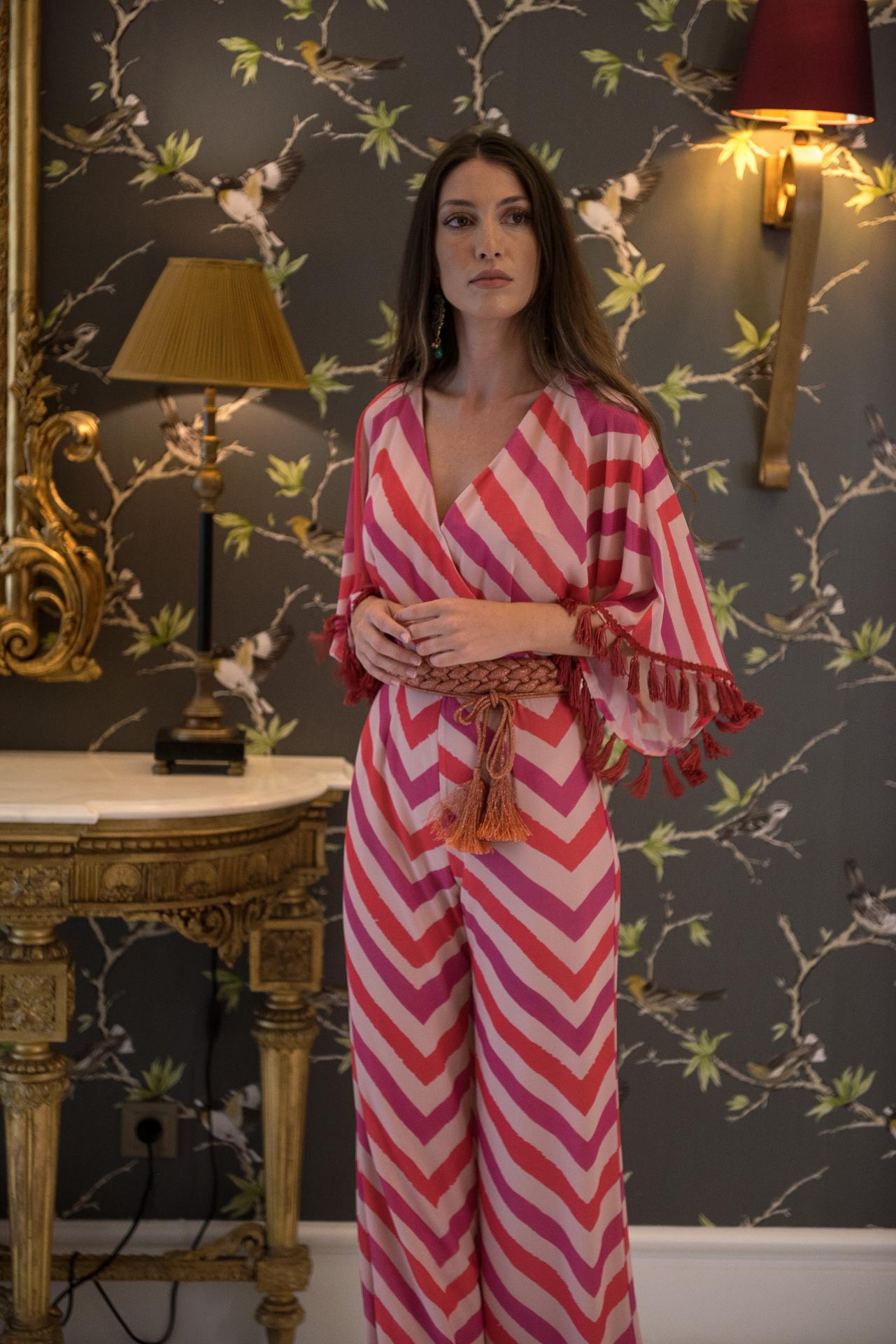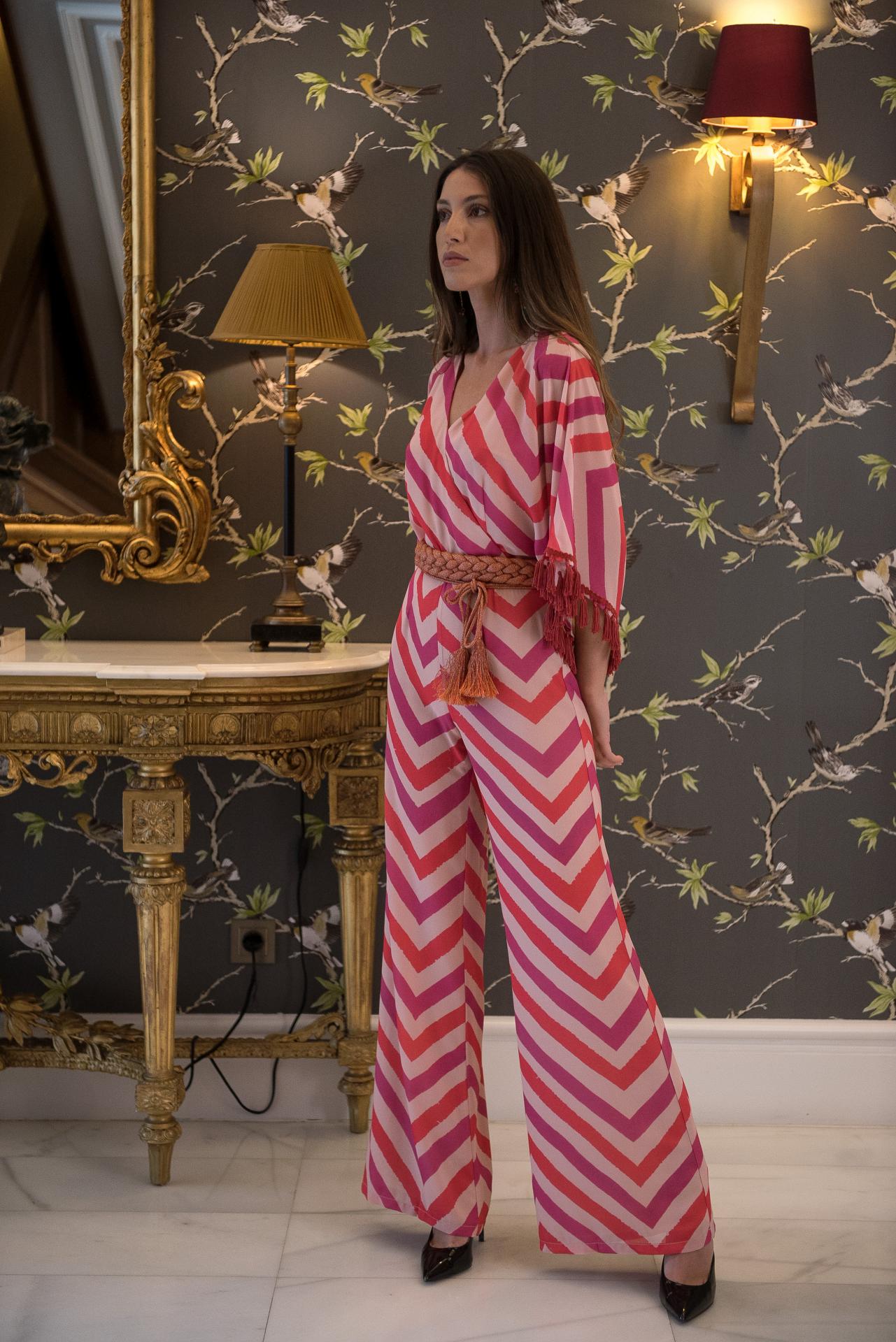 Mono en gasa con manga murciélago con flecos en la manga en fucsia en estampado de fondo crudo y rayas en forma Zigzag en tonos fucsia y coral