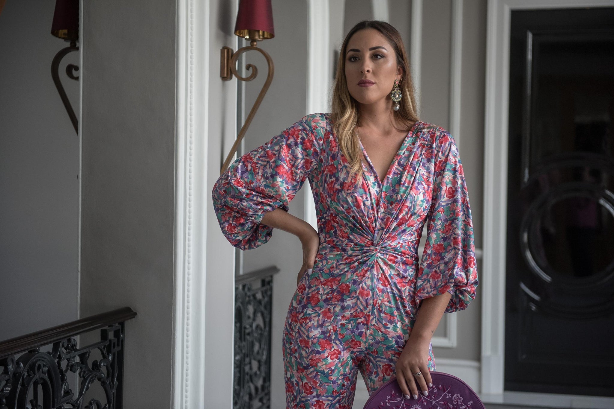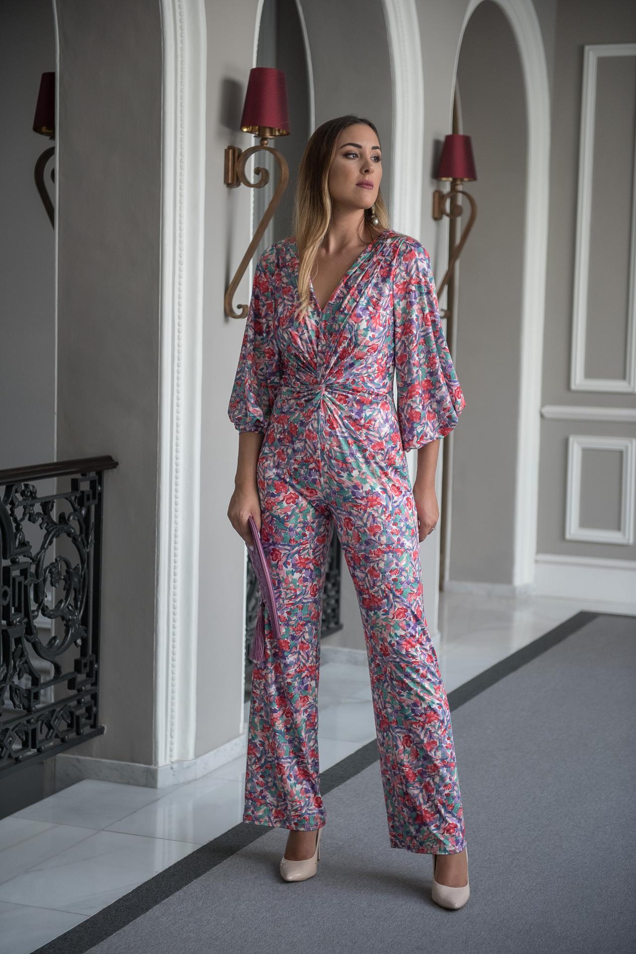 Mono de punto con manga globo drapeado en el escote efecto nudo y pata ancha con estampado de pinceladas de acuarela en tonos malvas, corales y verde agua