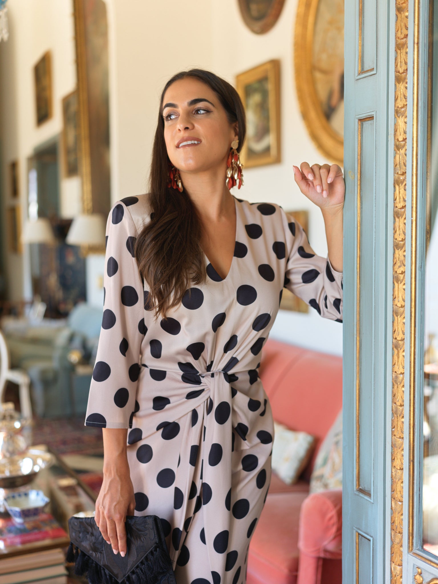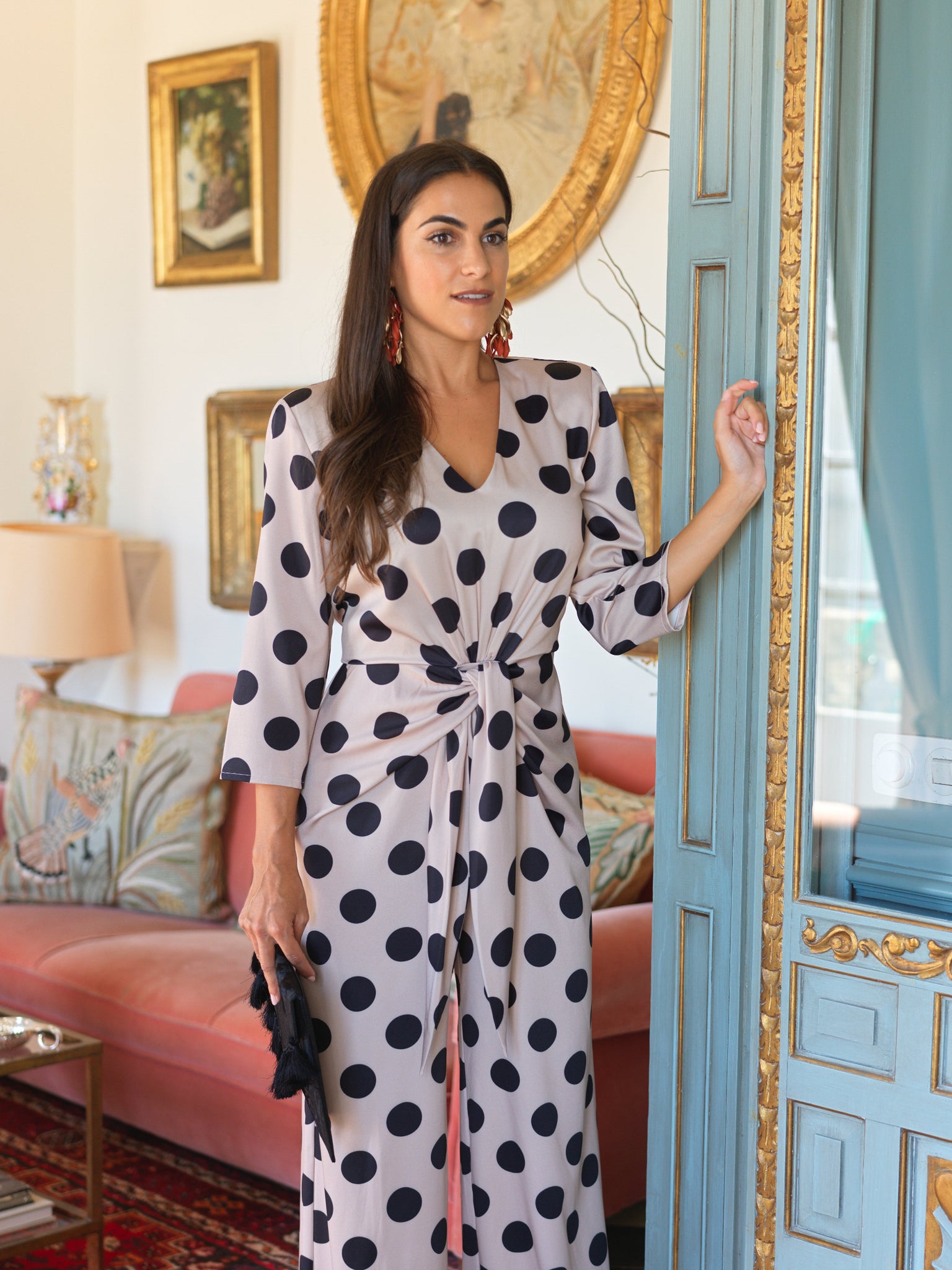 Mono lara lunares de satén con fondo crudo estampado con lunares negros con escote de pico anudado a la cintura y manga francesa.