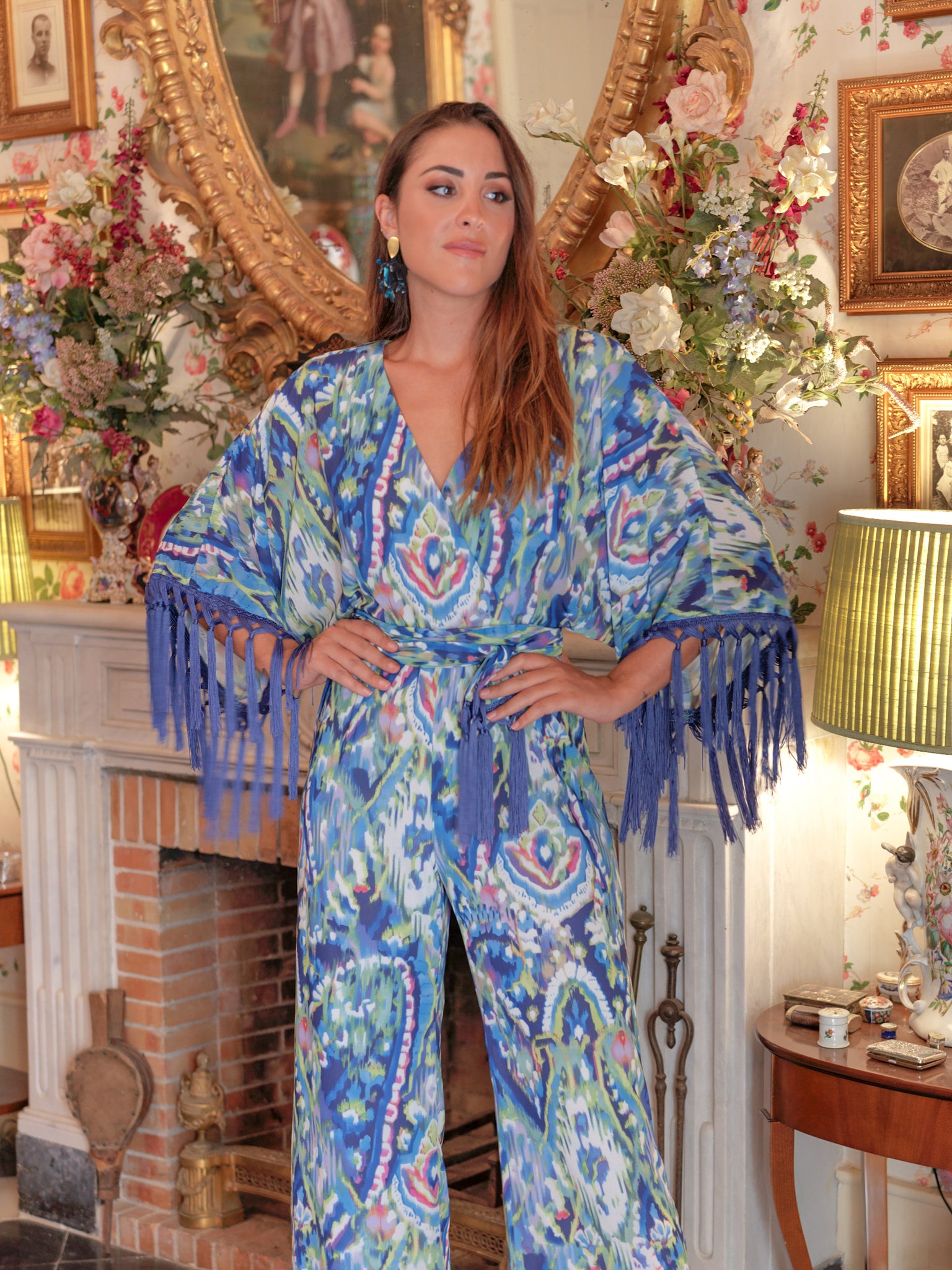 Mono vega blue de gasa estampado abstracto en tonos azules - verde agua y nude con manga murciélago y flecos en el filo de la manga en el mismo tono azul.