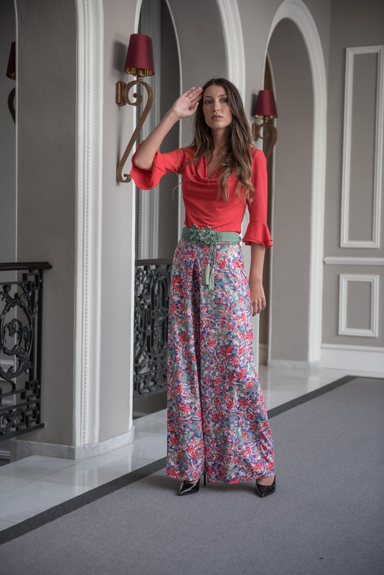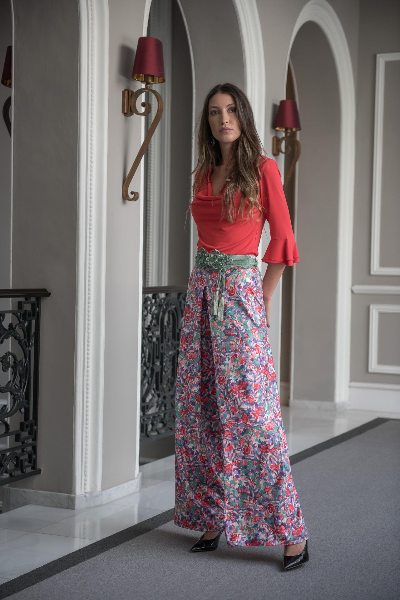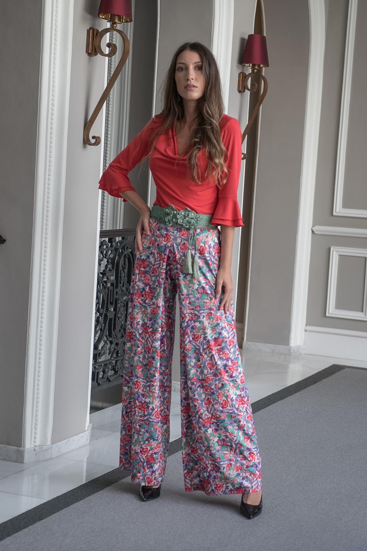 Pantalón de punto pata ancha con tablón fuelle en el centro que le da amplitud a la pata con estampado de pinceladas de acuarela en tonos malvas, corales y verde agua