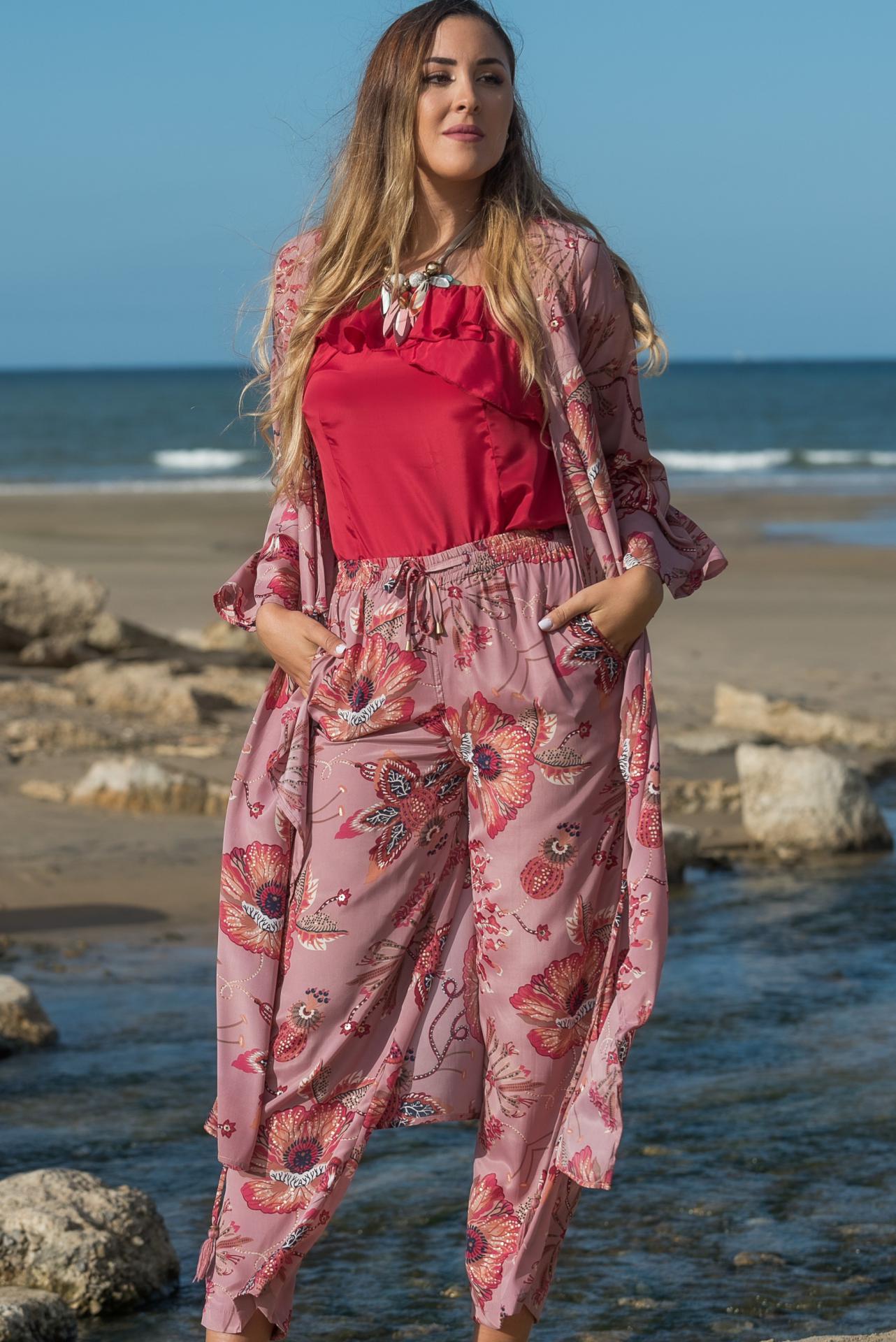 Chaqueta Flamenco gama rosas con mangas largas, abierta con nudo y largo midi