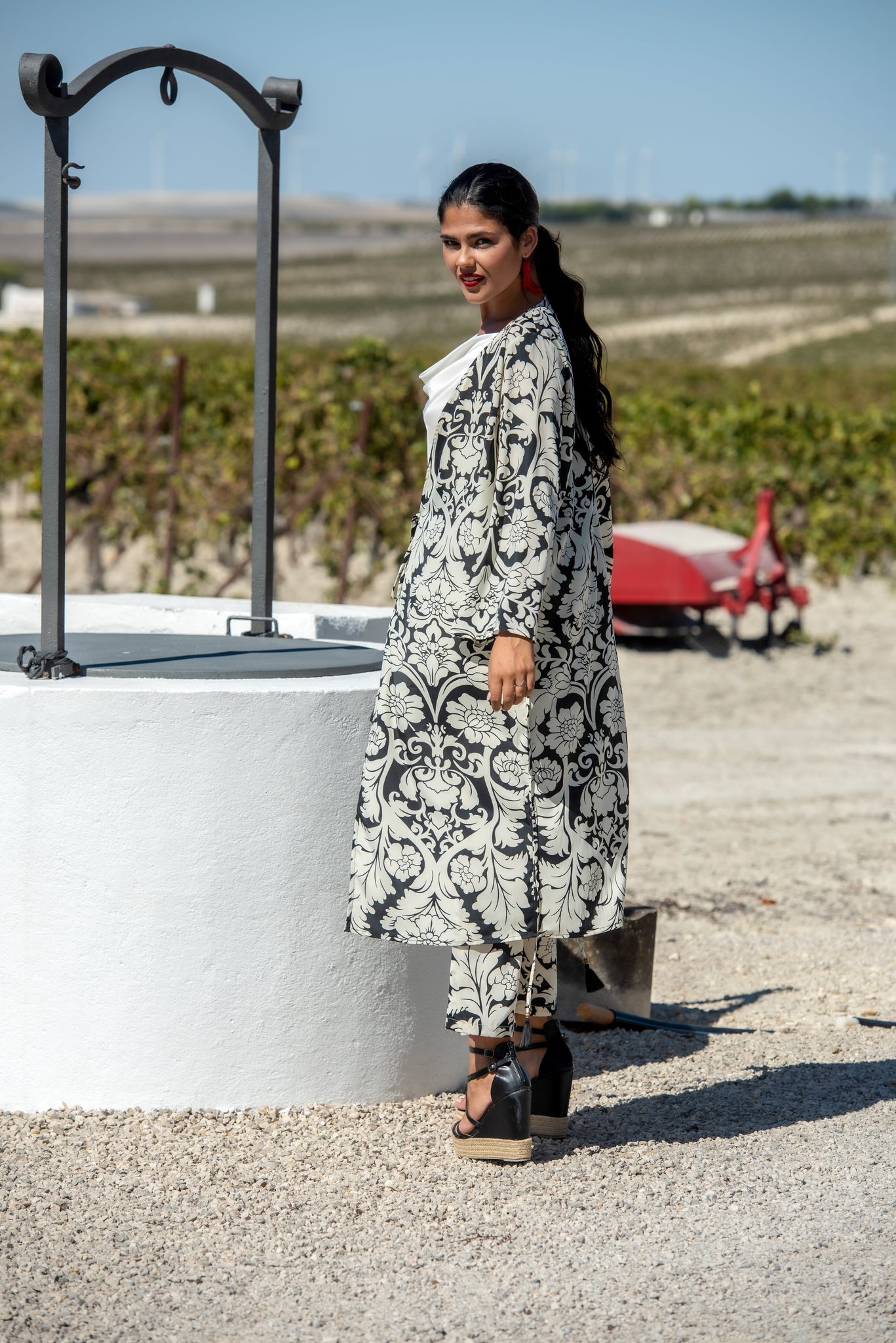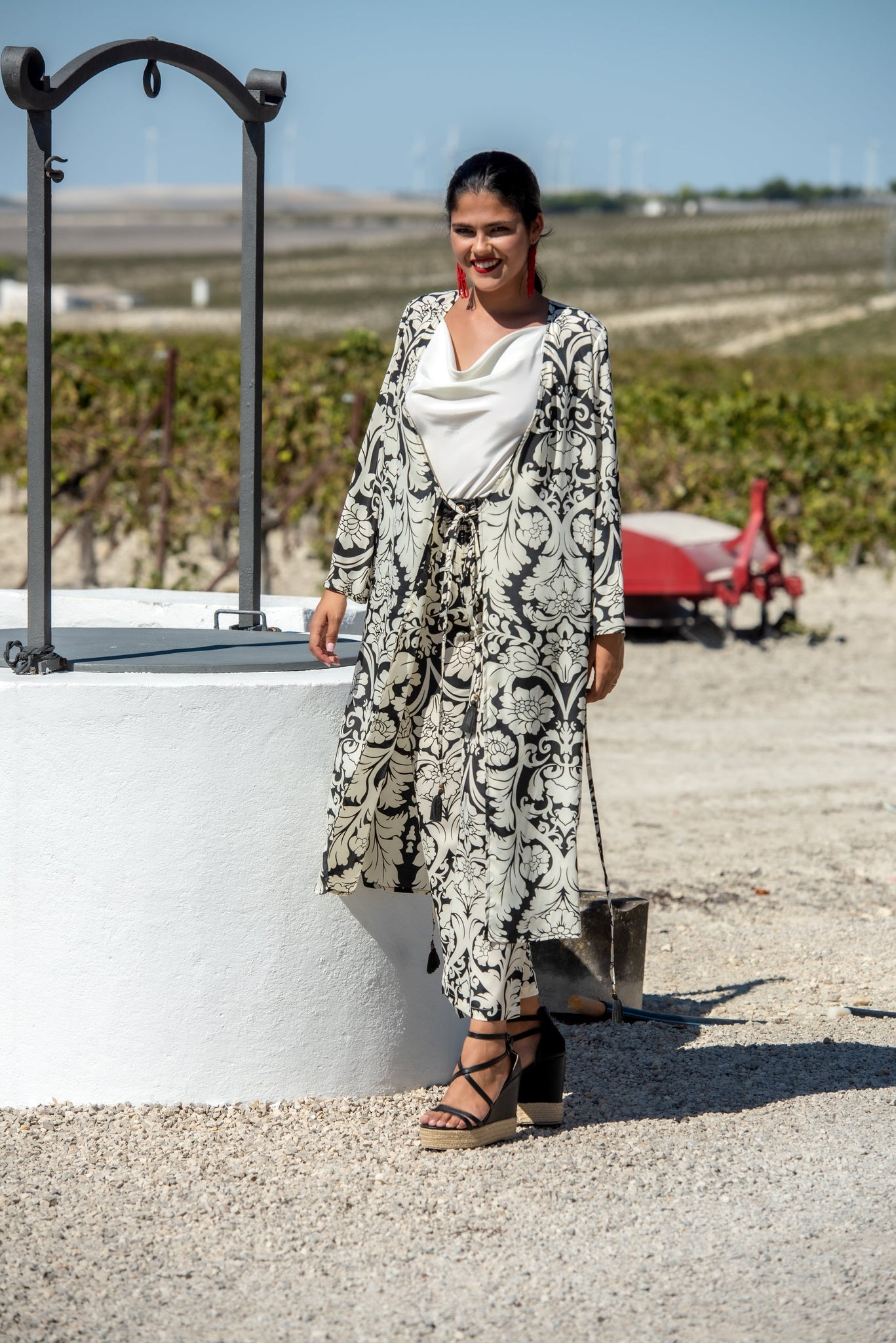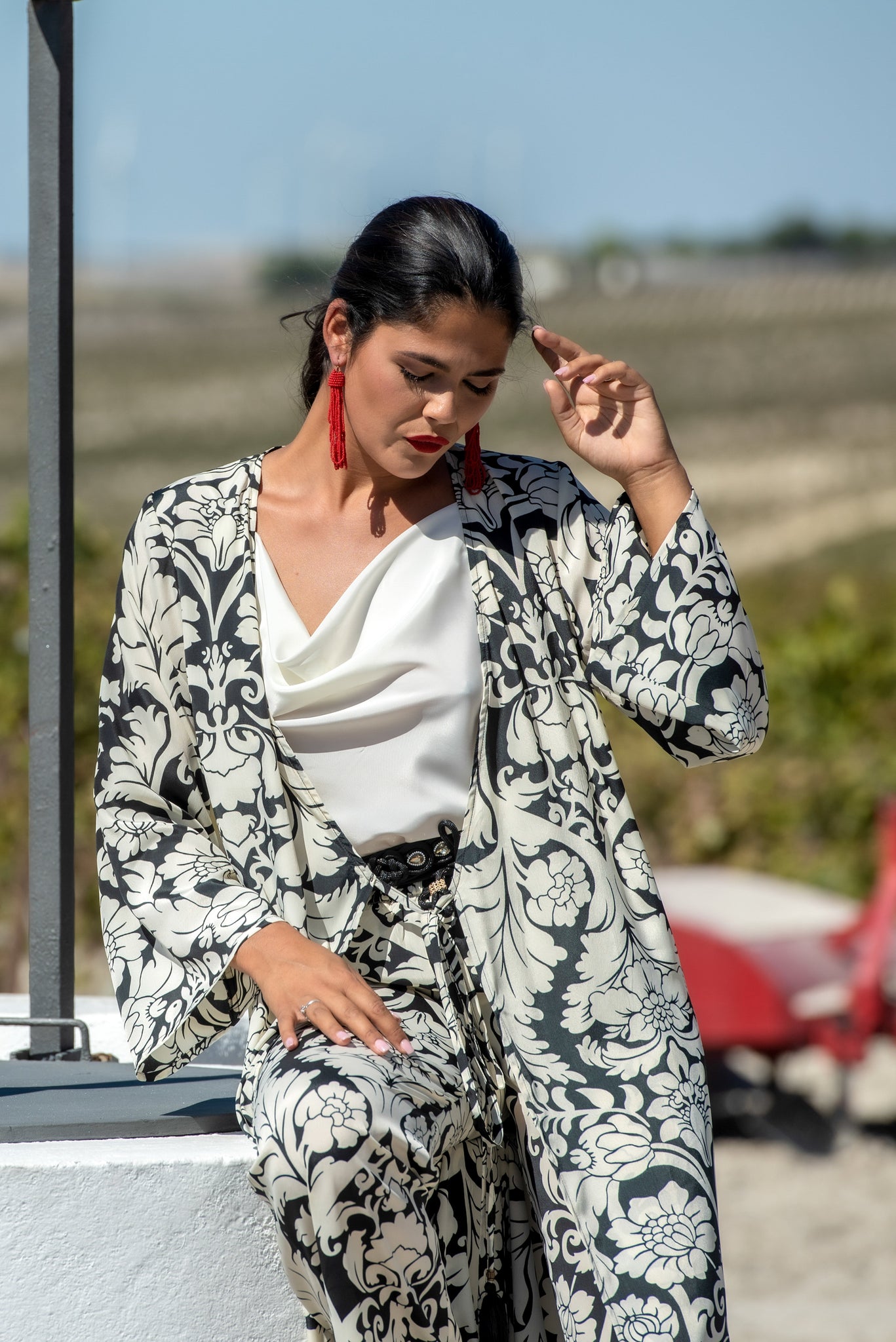 Chaqueta kimono almijar de polysilk con motivos ornamentales bicolor en beige y negro.