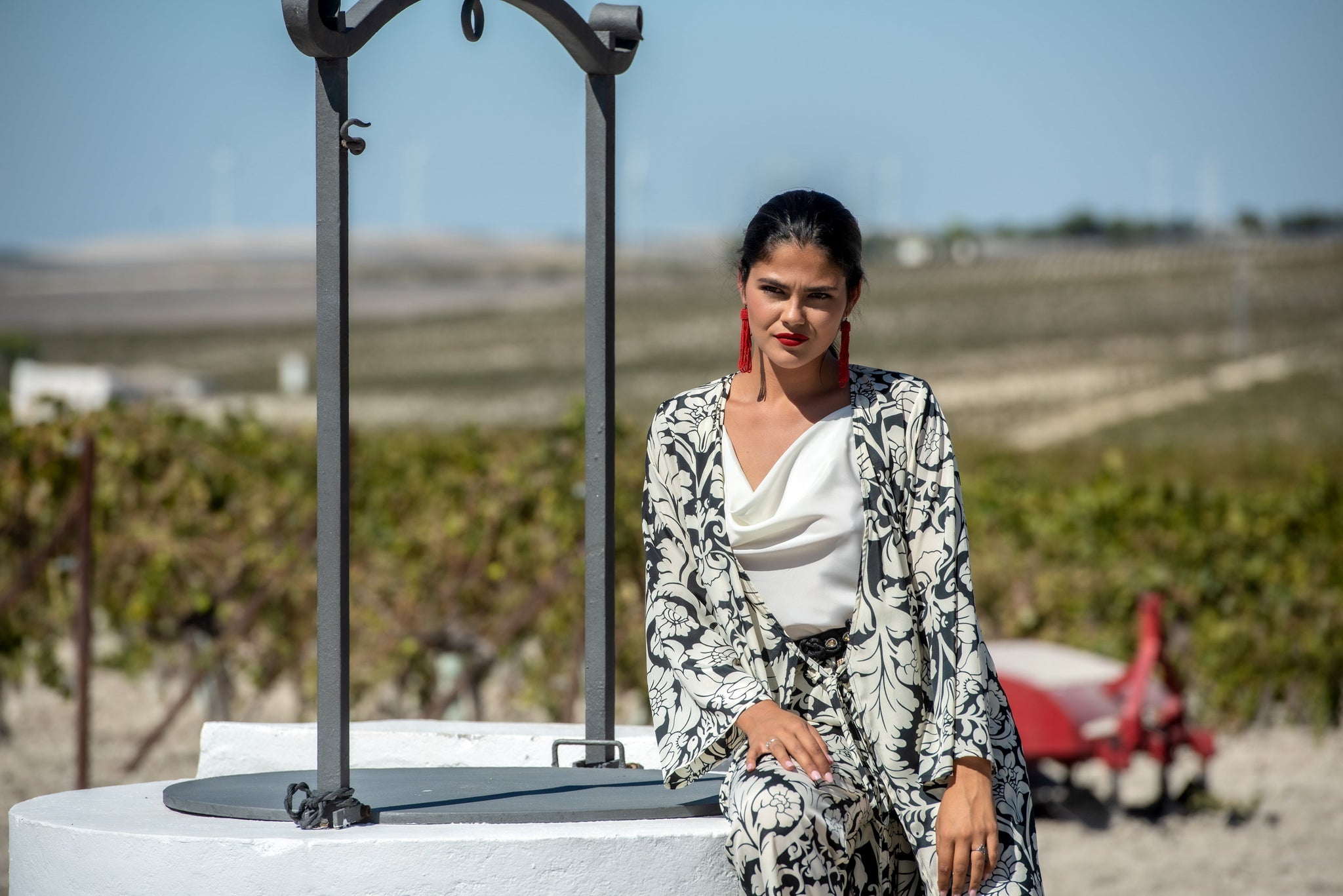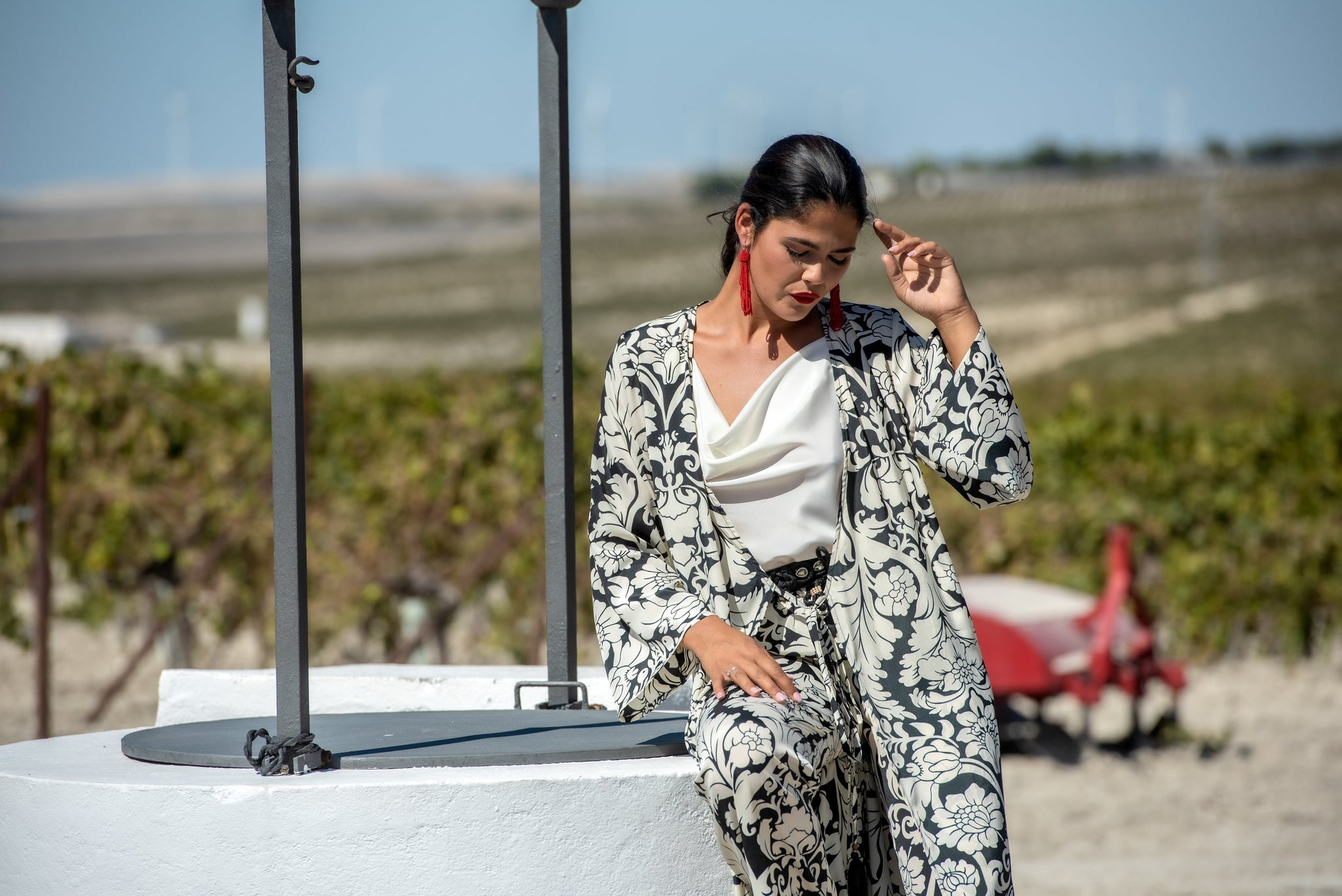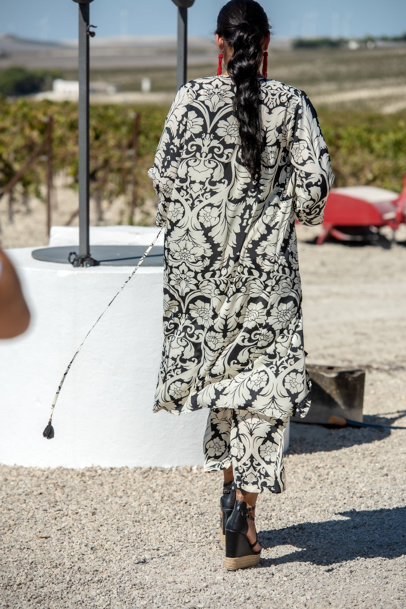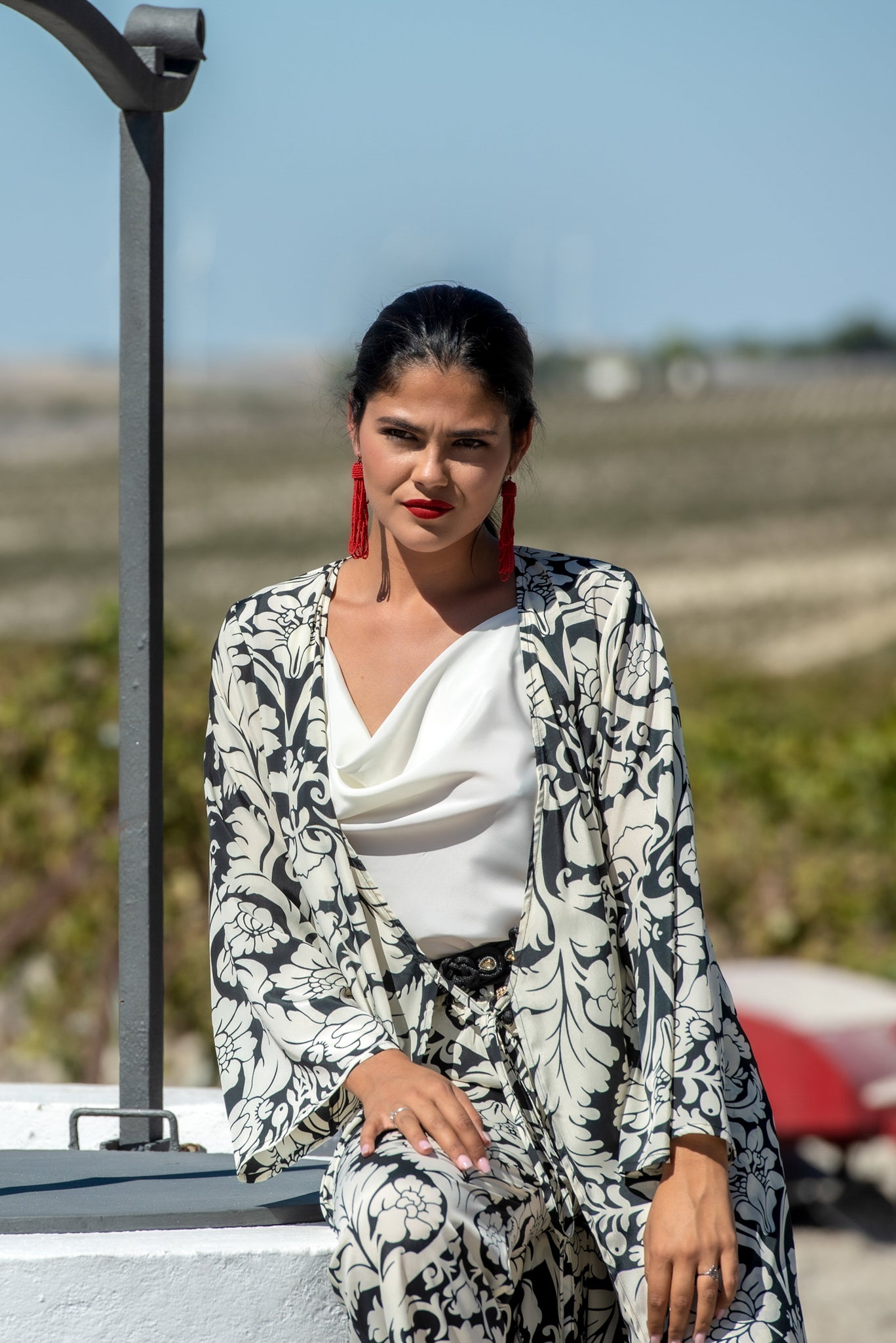 Chaqueta kimono almijar de polysilk con motivos ornamentales bicolor en beige y negro.