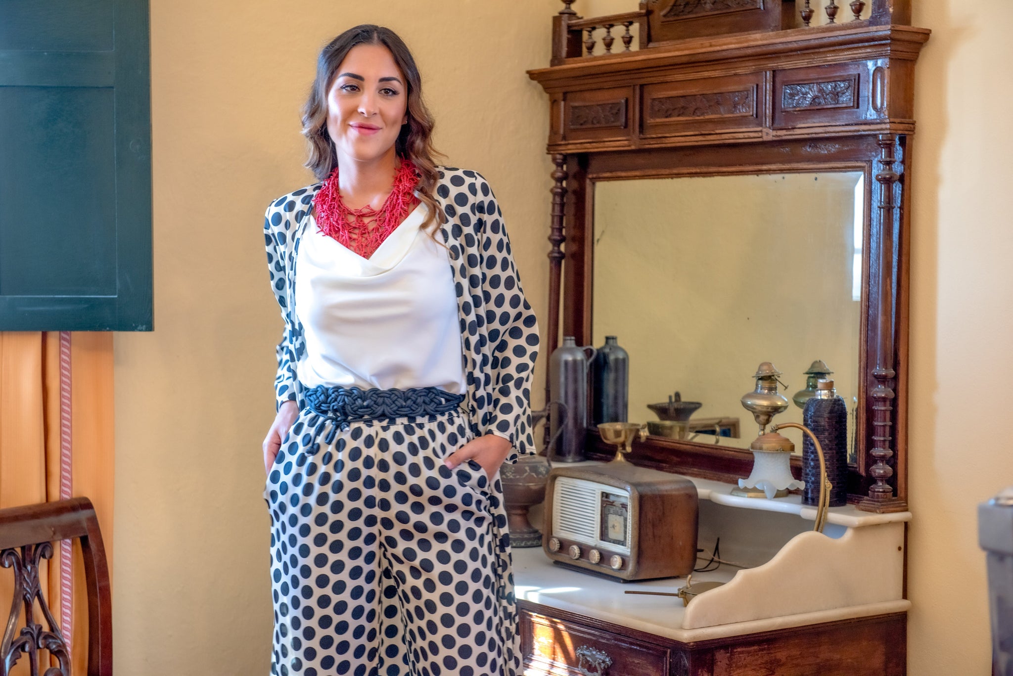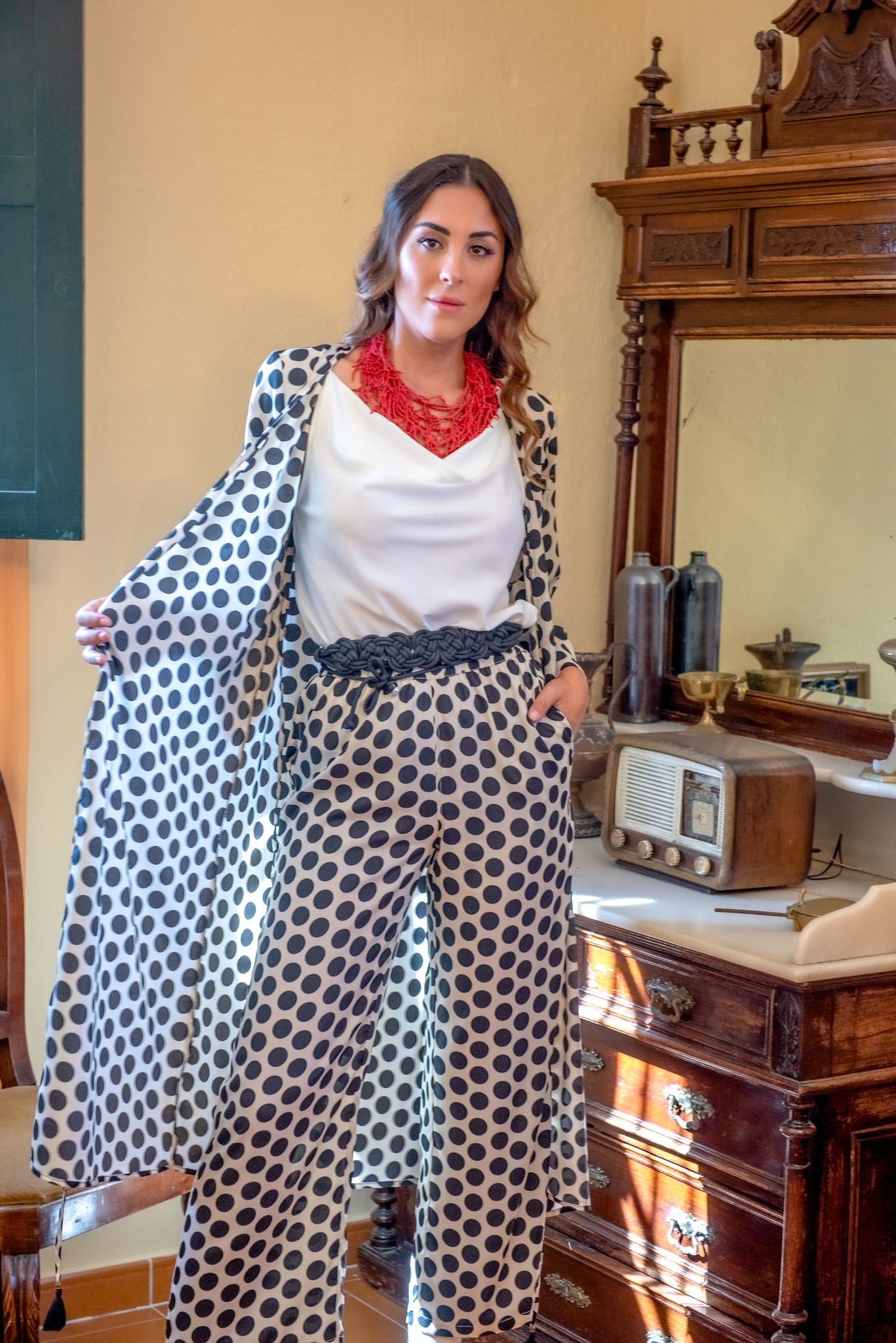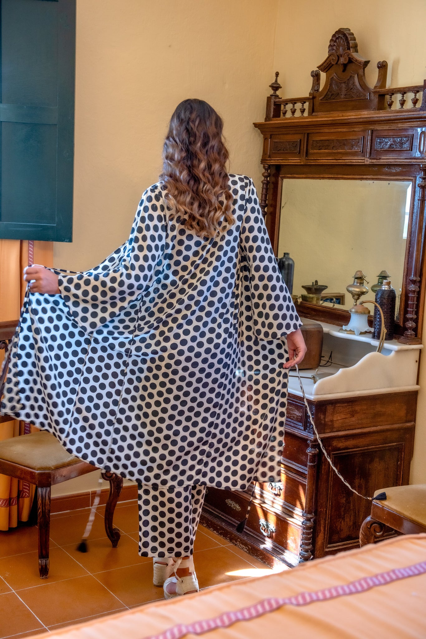 Chaqueta kimono solera de polysilk fondo crudo y lunares negros.