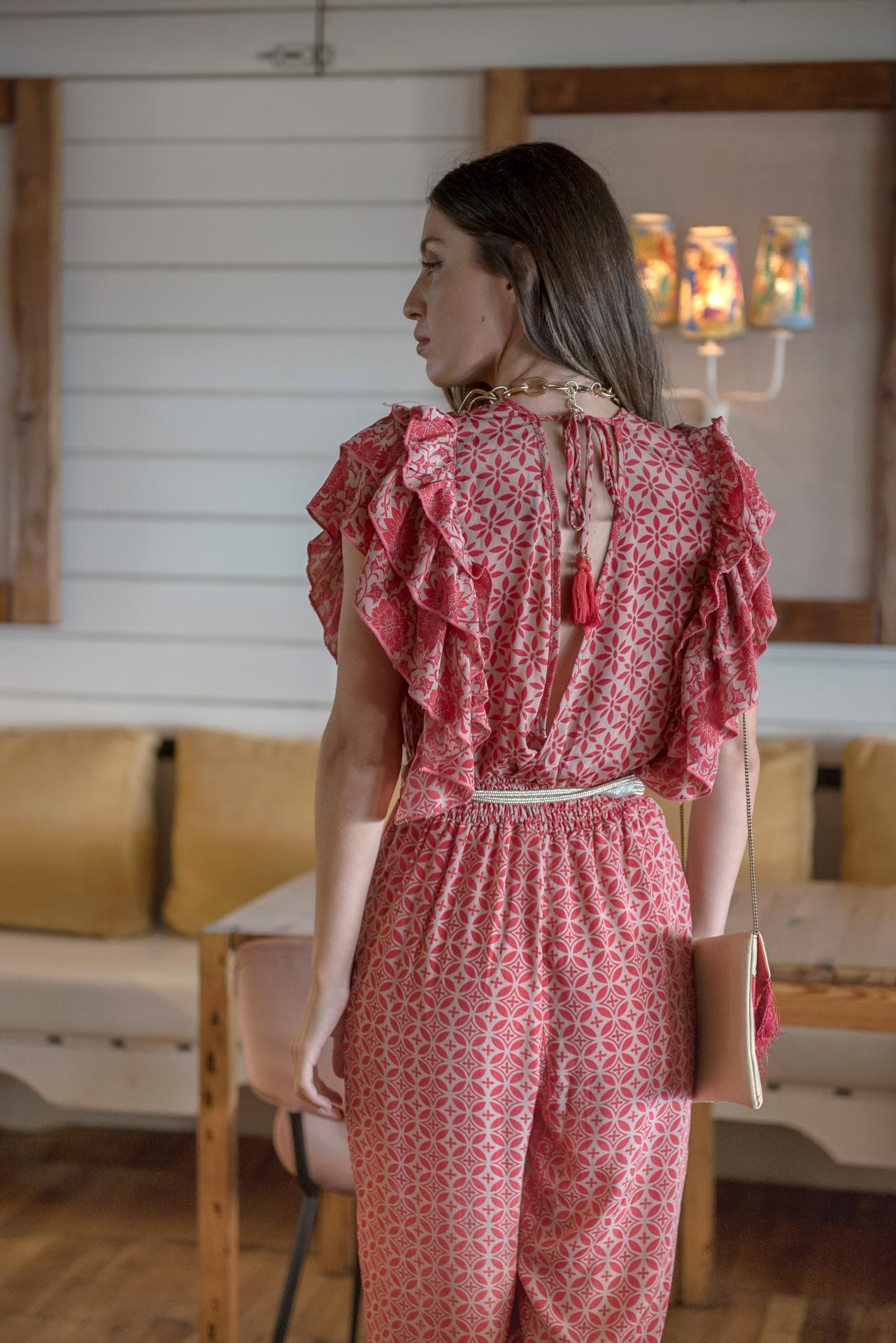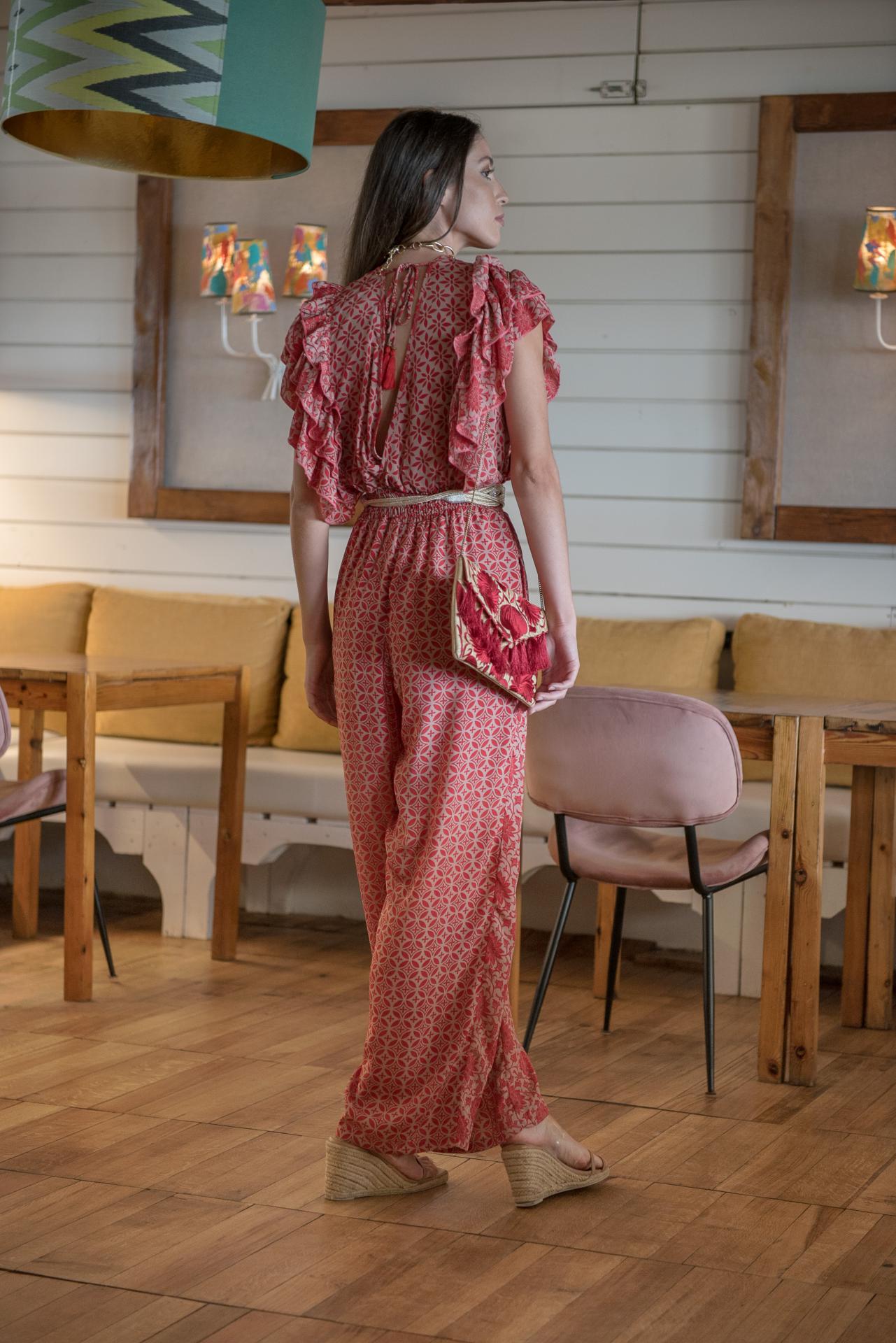 Mono estampado Torre del Oro coral y taupe , sin mangas con doble volante en hombro, cintura fruncida , escote cruzado en pico y espalda pico .