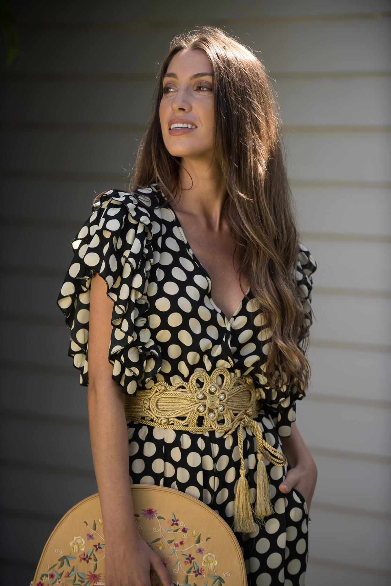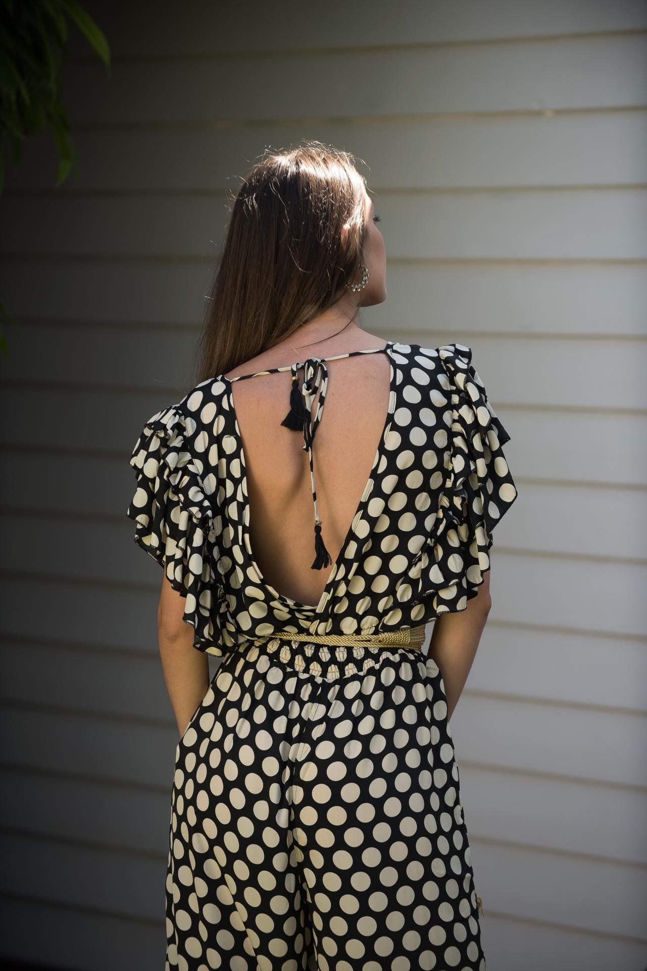Mono estampado negro con lunares beige , sin mangas con doble volante en hombro, cintura fruncida , escote cruzado en pico y espalda pico .