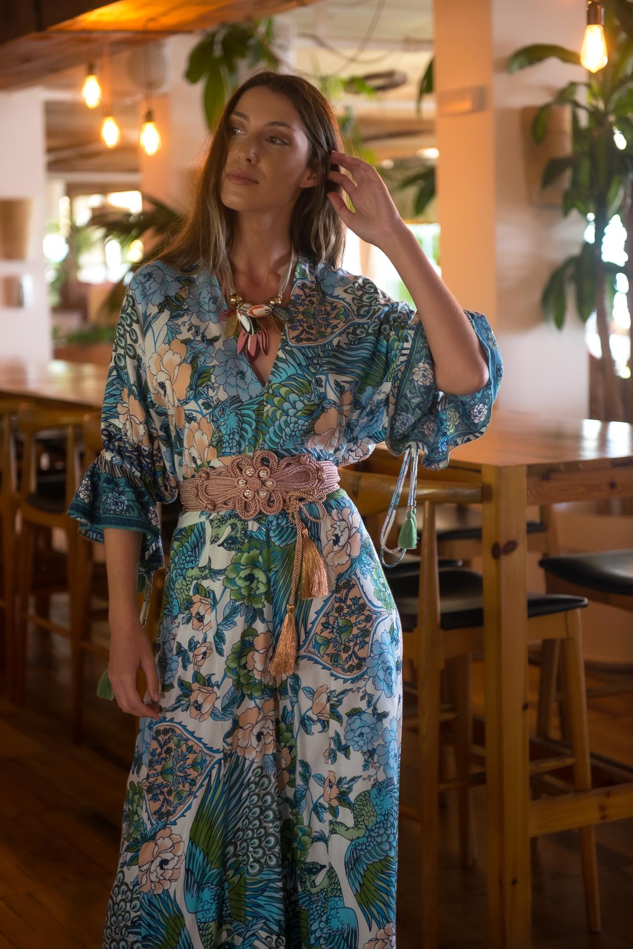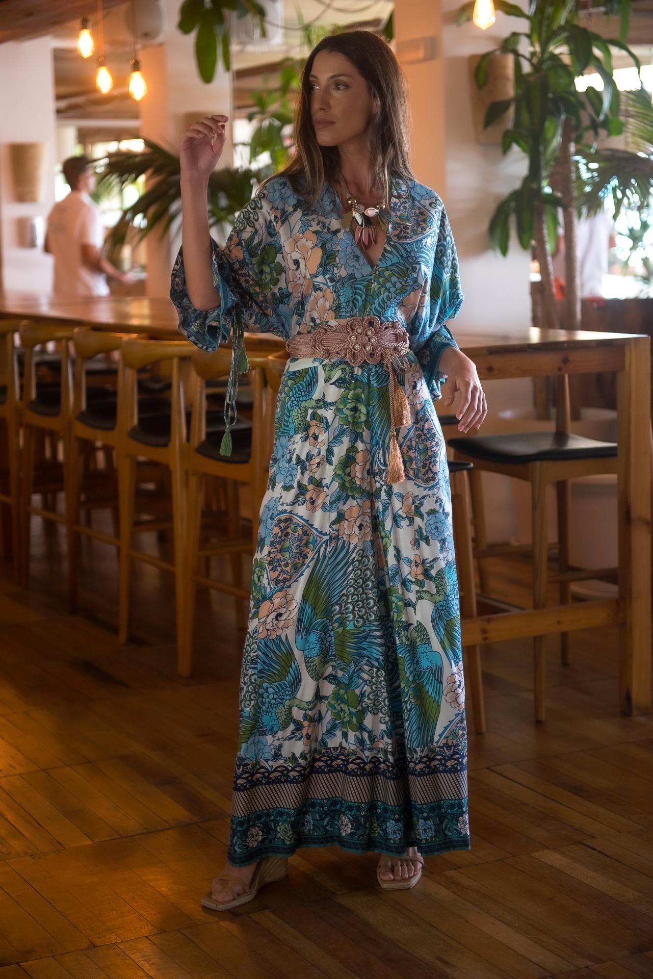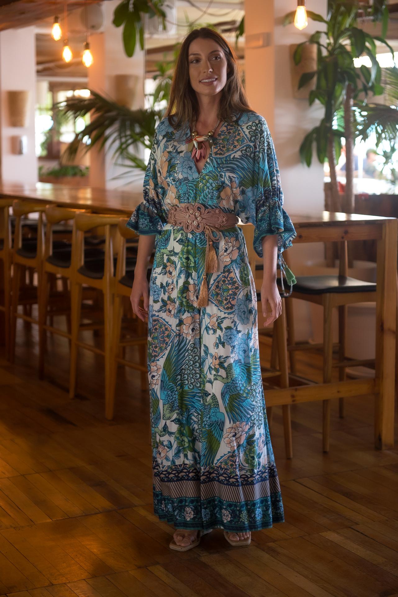 Mono estampado Jardín Japo colores azules, con pájaros y flores , con volantes en mangas al codo y escote y espalda en pico