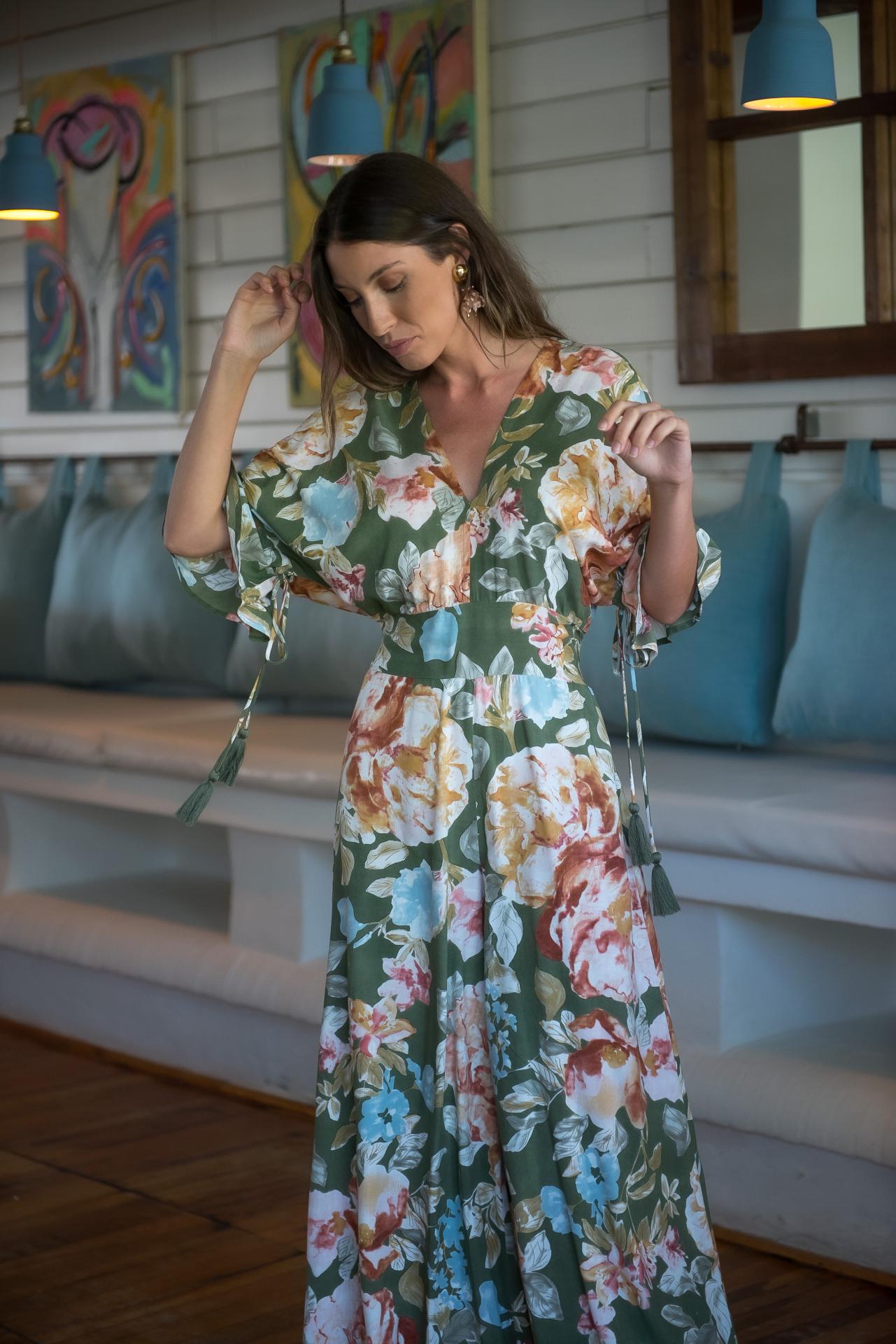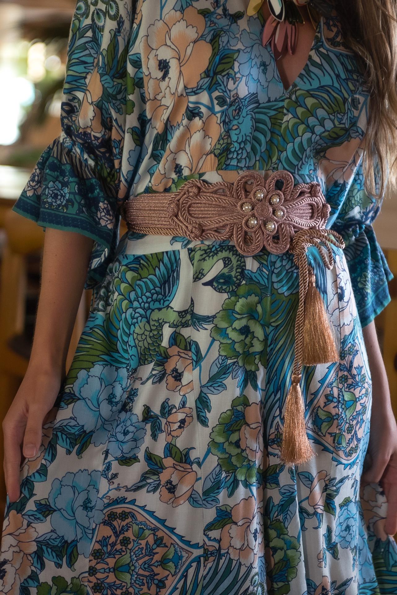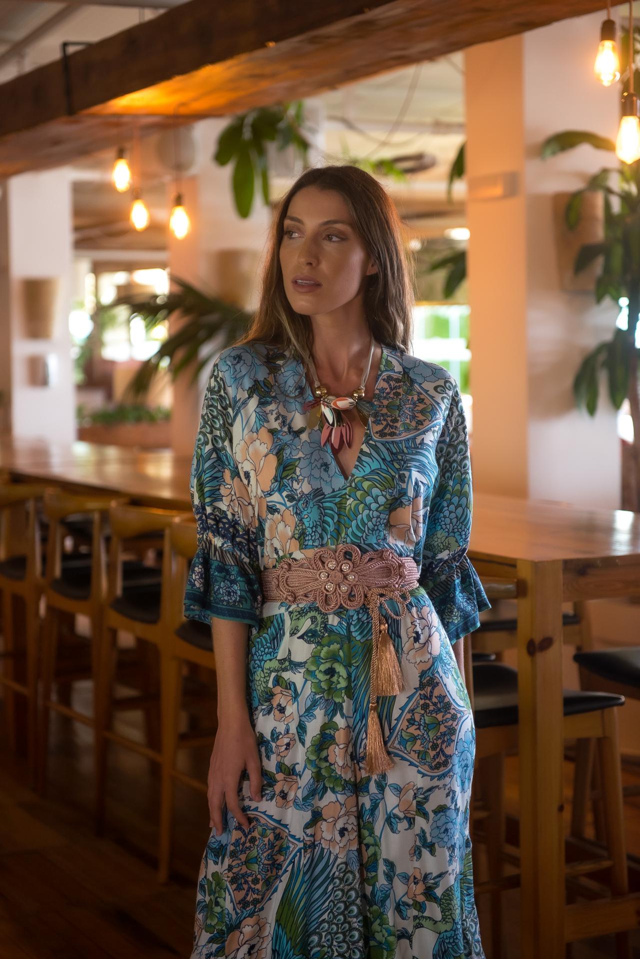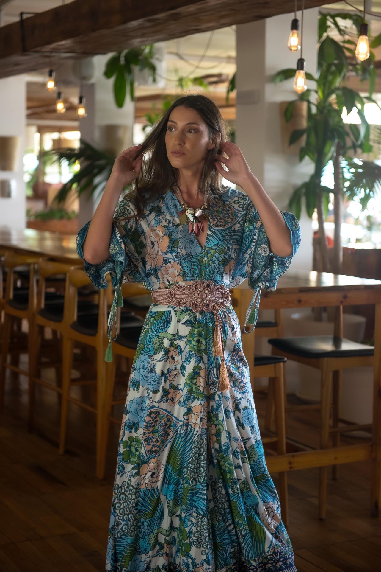 Mono estampado Jardín Japo colores azules, con pájaros y flores , con volantes en mangas al codo y escote y espalda en pico