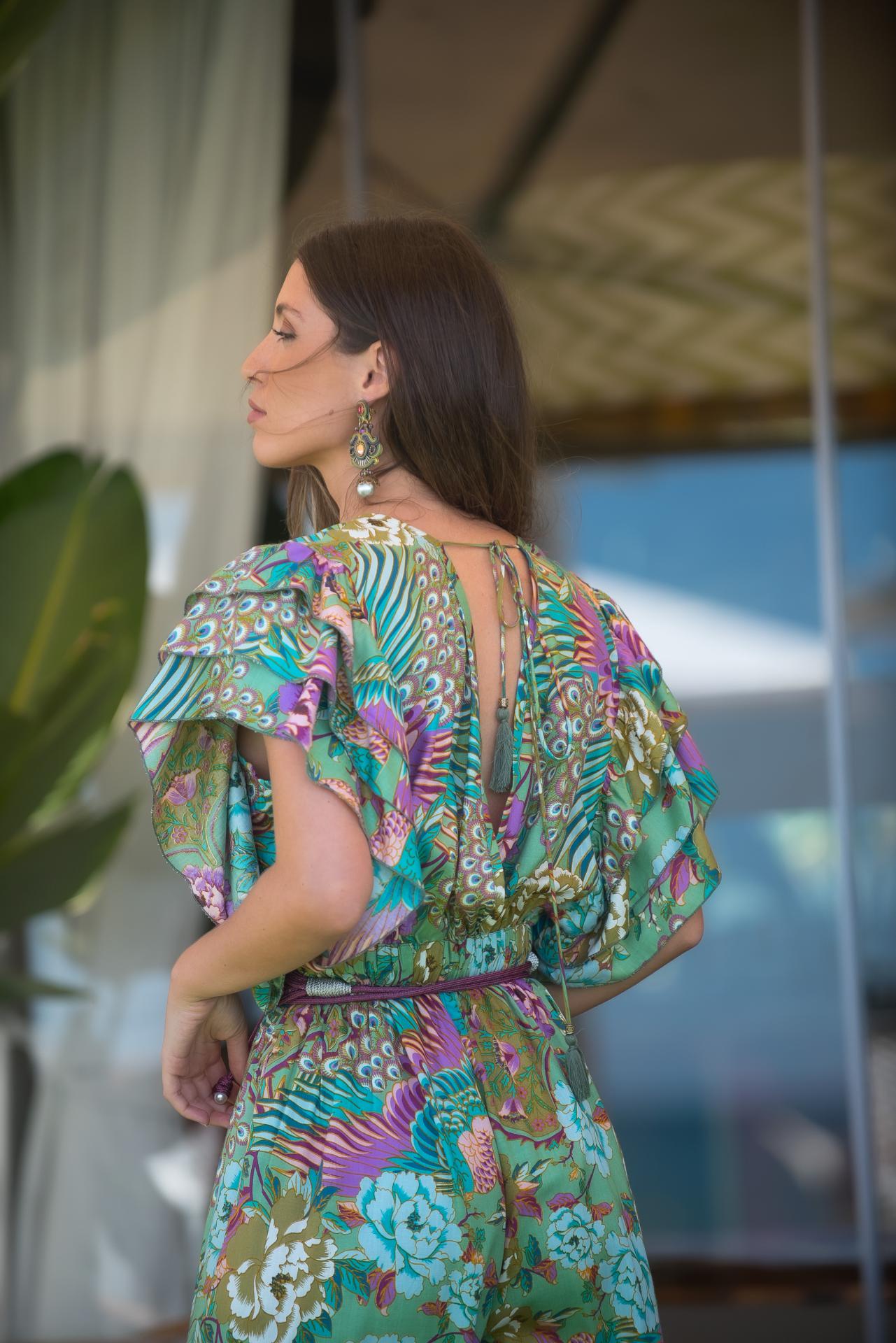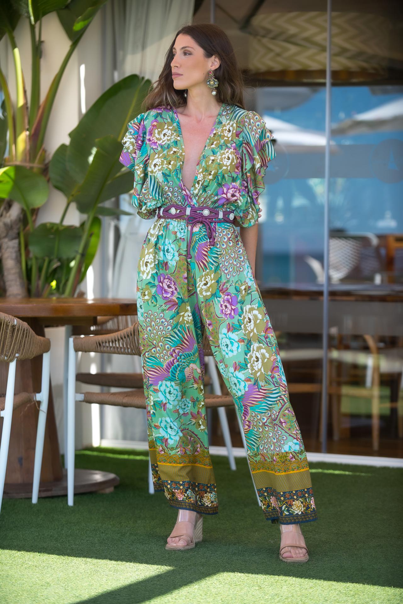 Mono estampado Jardín Japo verde, con cenefa al filo del pantalón, sin mangas con doble volante en hombro, cintura fruncida , escote cruzado en pico y espalda pico .