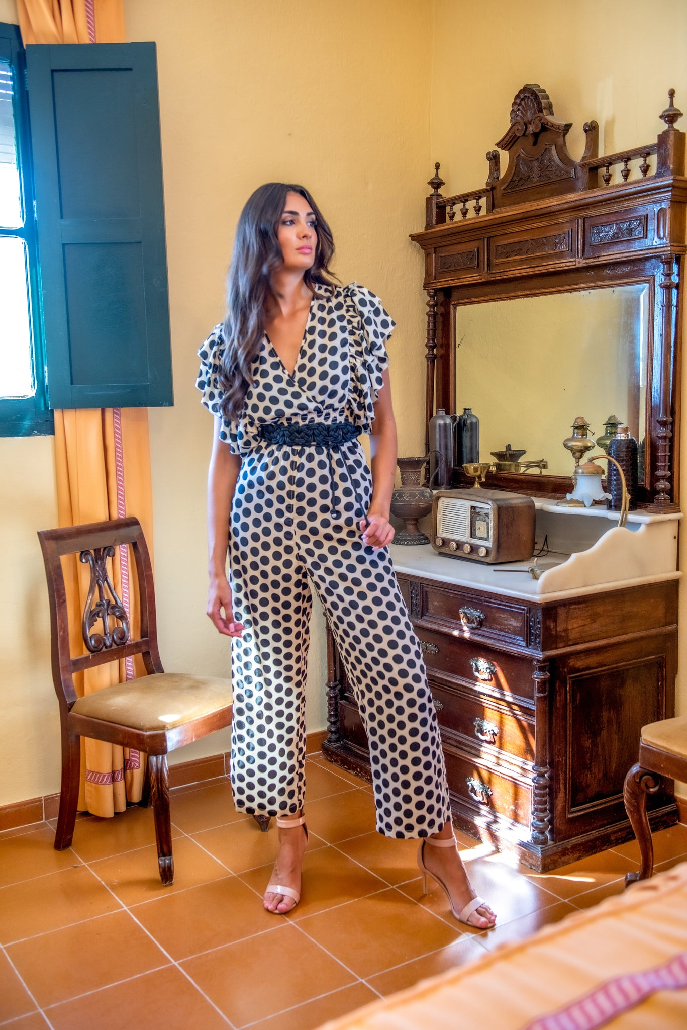 Mono solera en polysilk estampado de fondo crudo y lunares negros. Sin mangas con doble volante en el hombro y cintura fruncida escote cruzado delante y en la espalda.