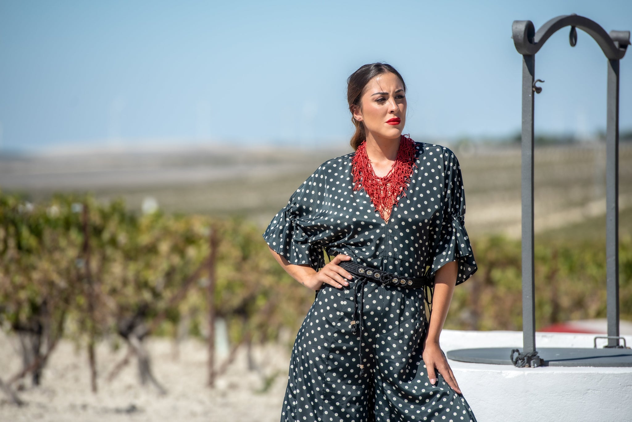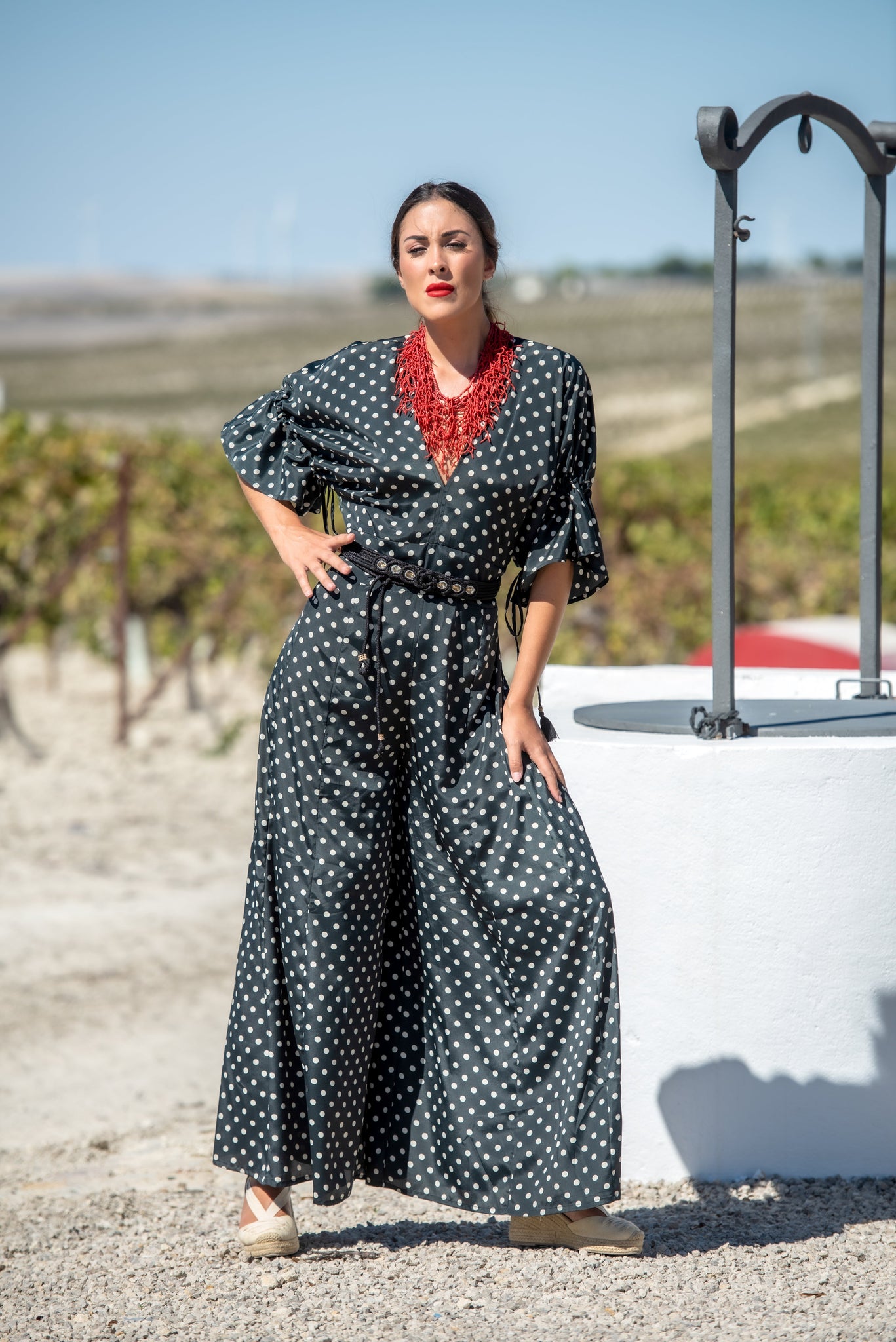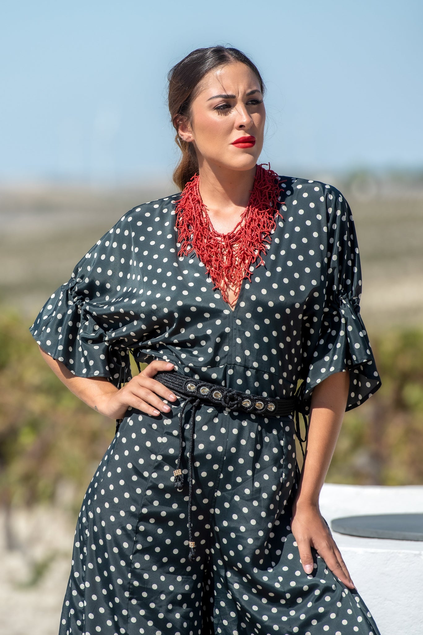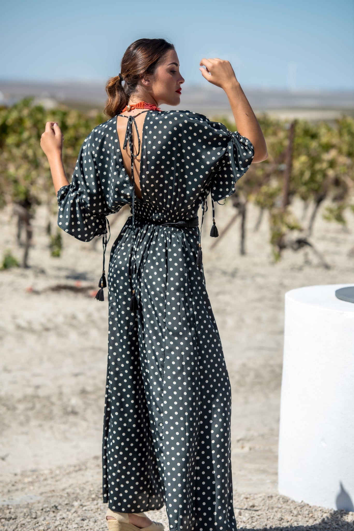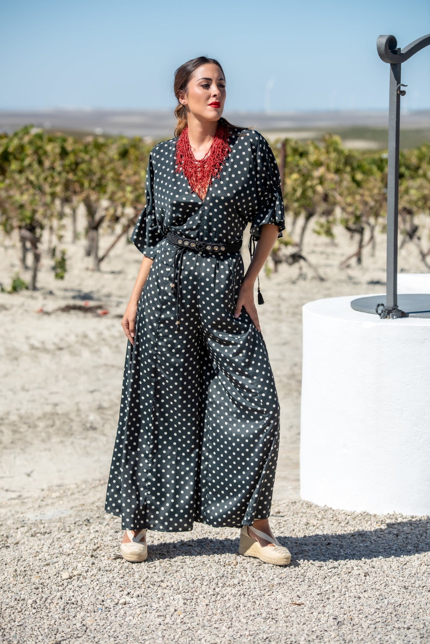 Mono canastera polysilk negro con lunares blancos y pata ancha con volante en la manga ajustable y escote en v delantero y en la espalda.
