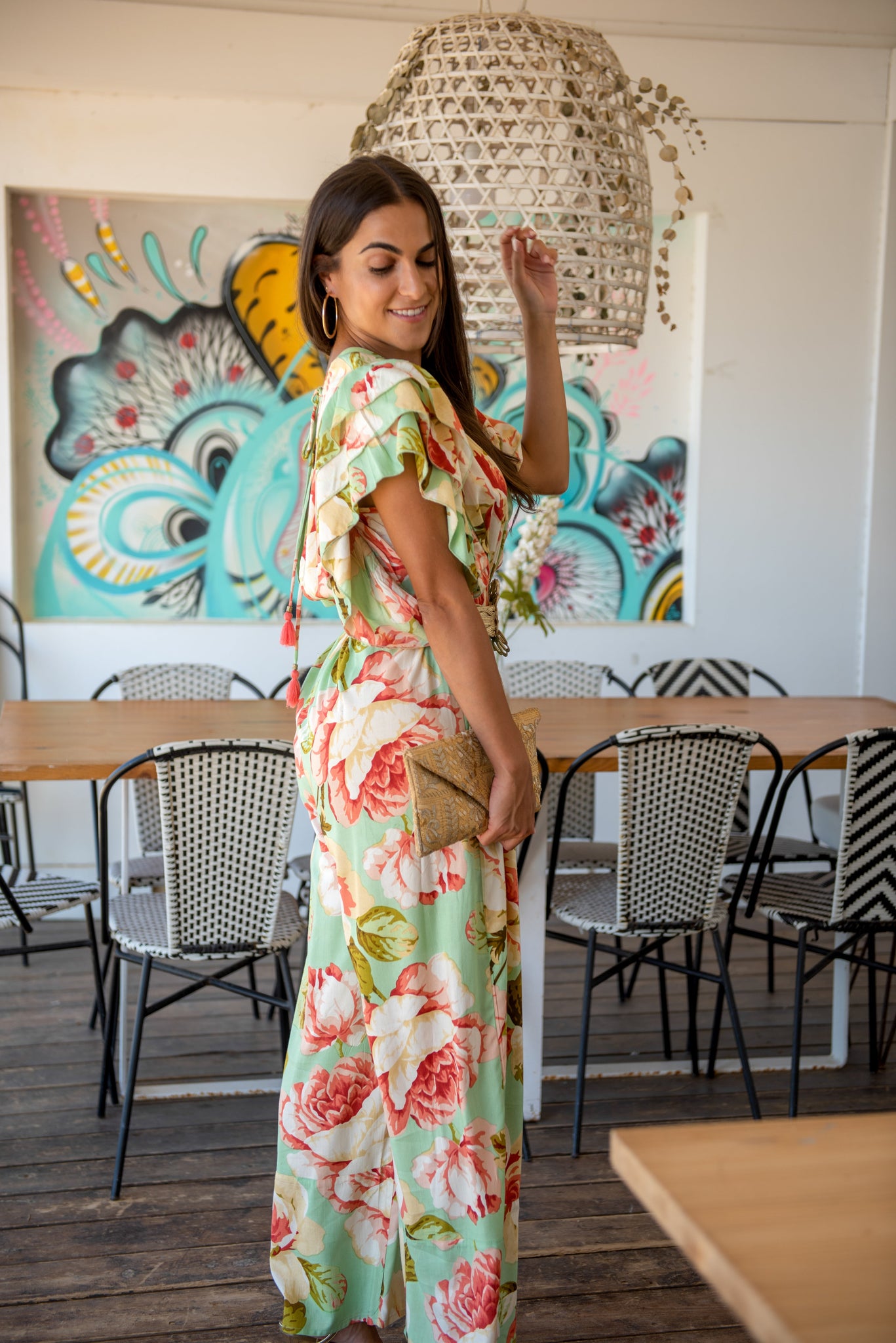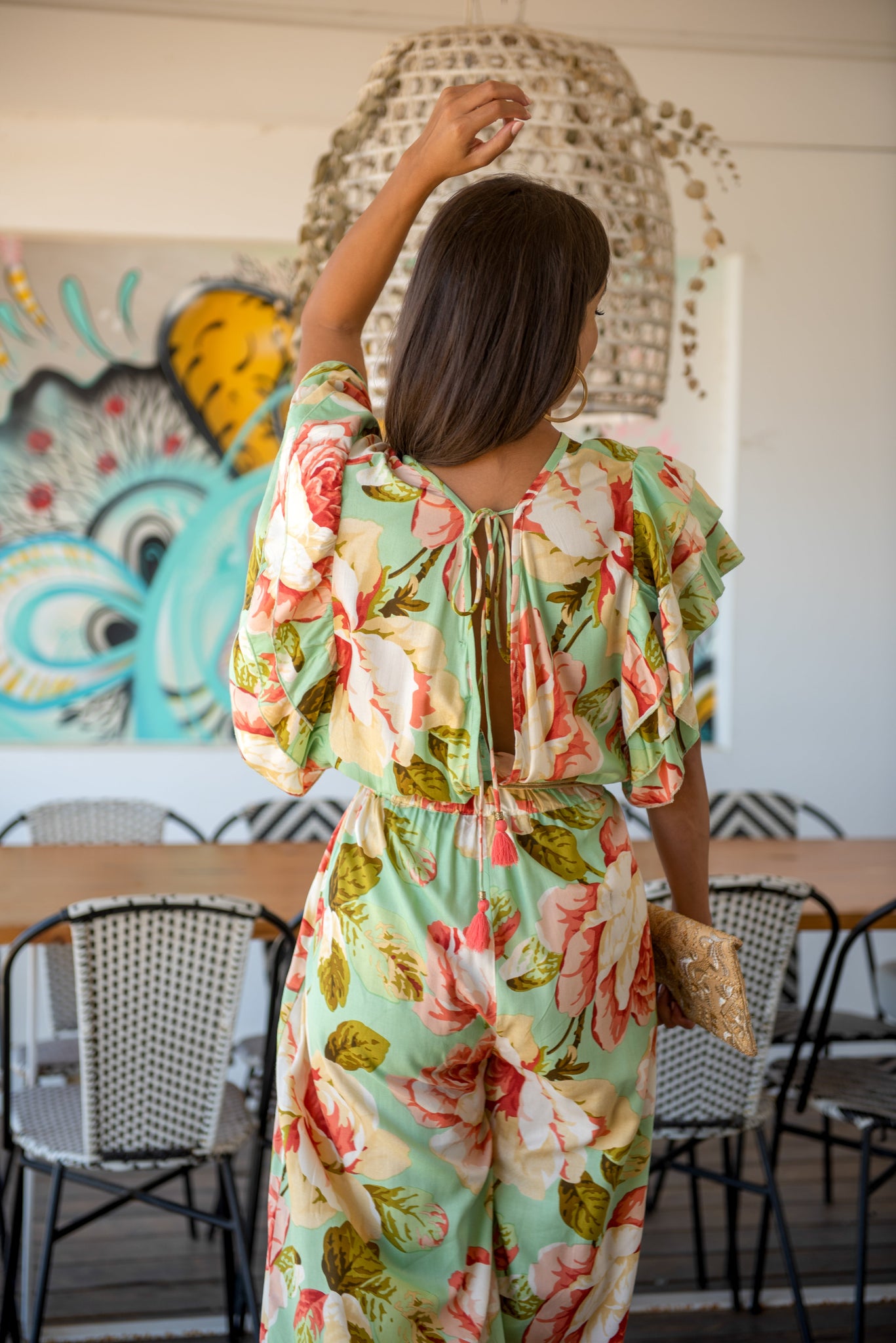 Mono formentera de viscosa estampado verde agua con grandes rosas color maquillaje y coral sin mangas con doble volante en el hombro y cintura fruncida escote cruzado delante y en la espalda.