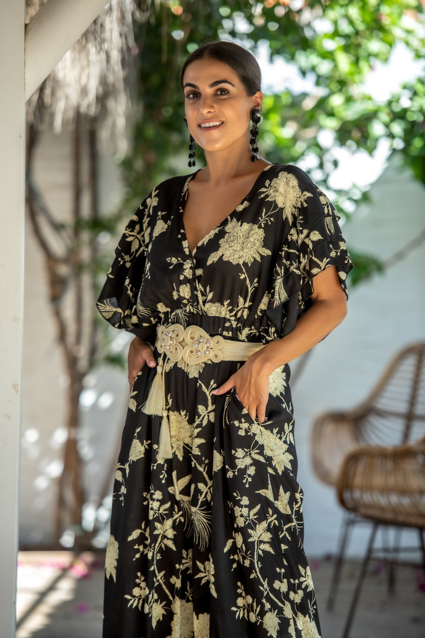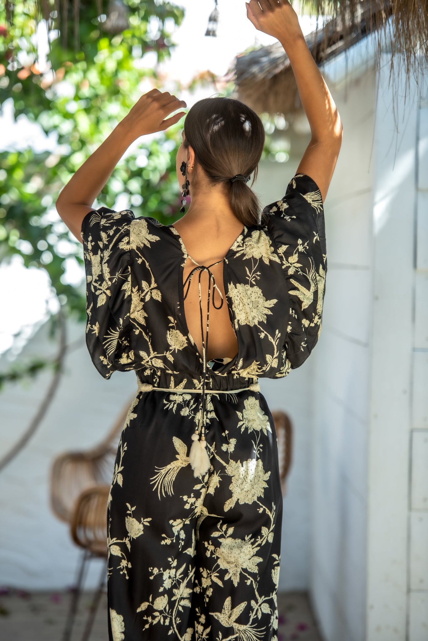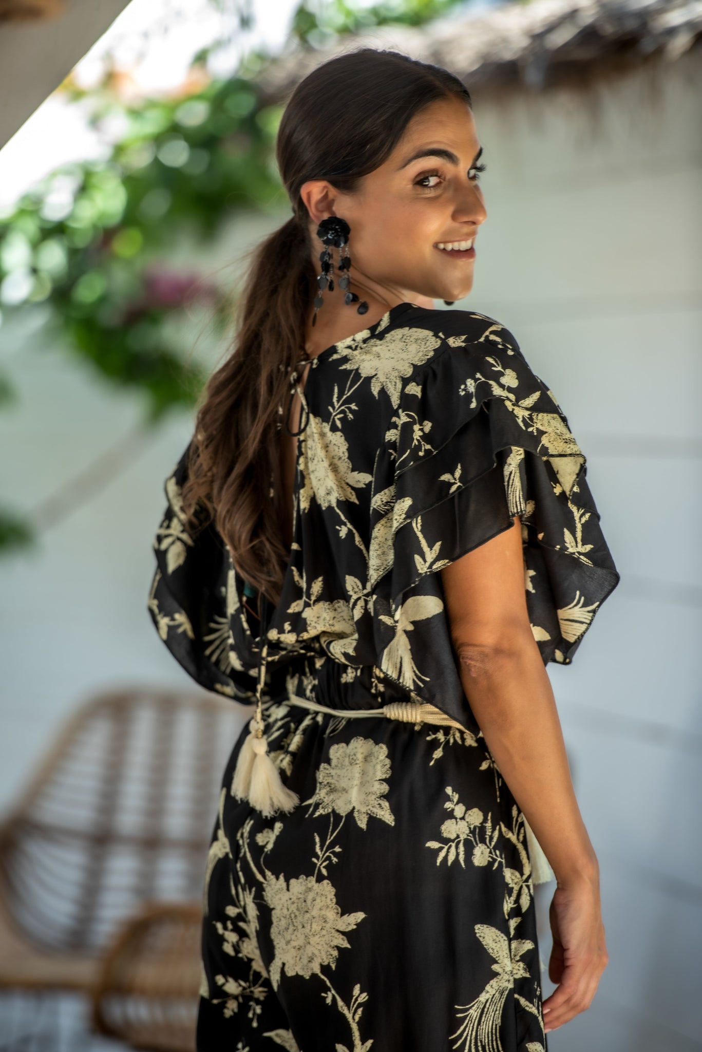Mono kavala de viscosa negro con flores de mantón beige sin mangas con doble volante en el hombro y cintura fruncida escote cruzado delante y en la espalda.