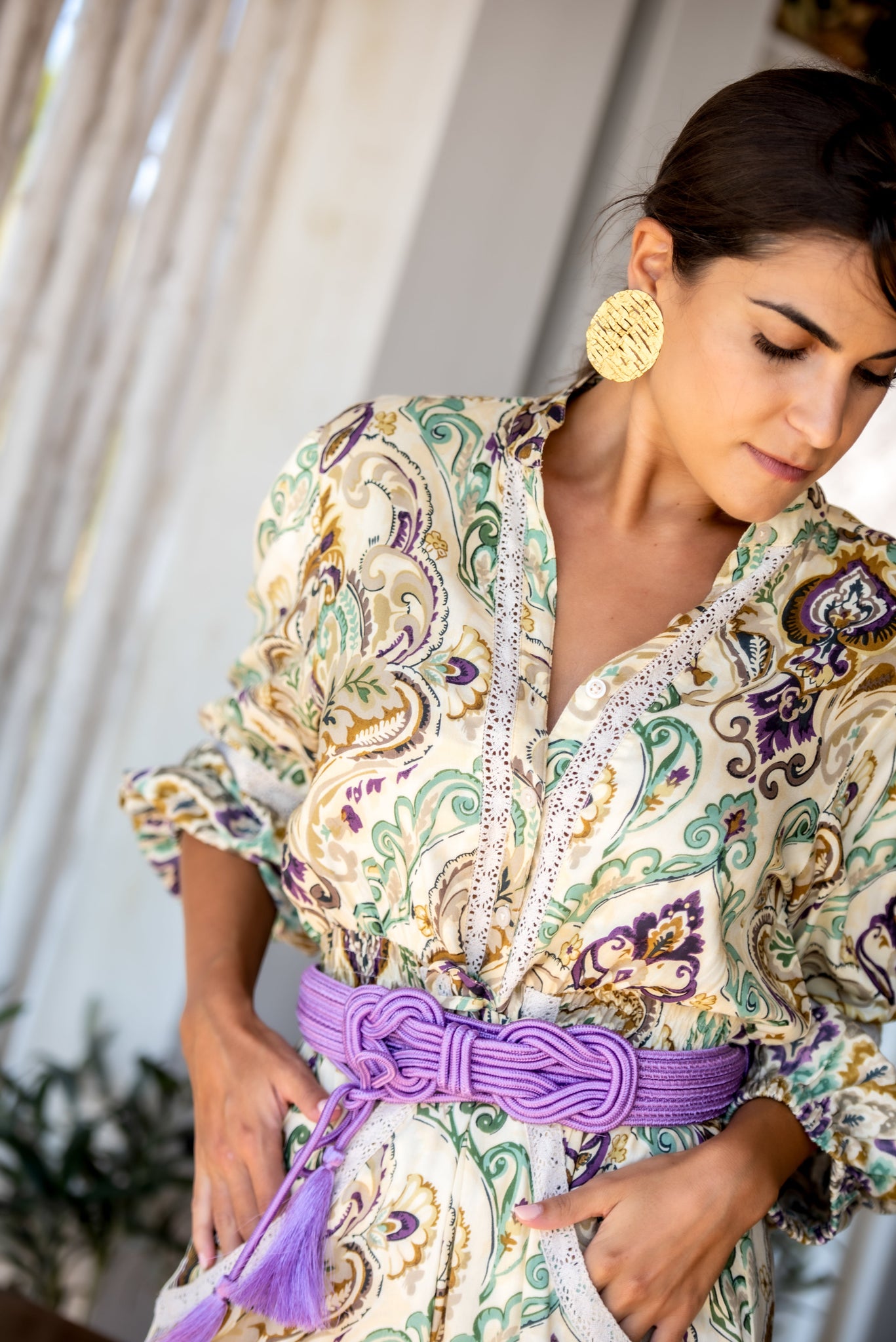 Mono murano de viscosa con bolsillos estampado de fondo beige con gran cachemira en tonos verdes y malvas combinado con estampado ornamental en los mismos tonos. Lleva adornos de pasamanería beige.