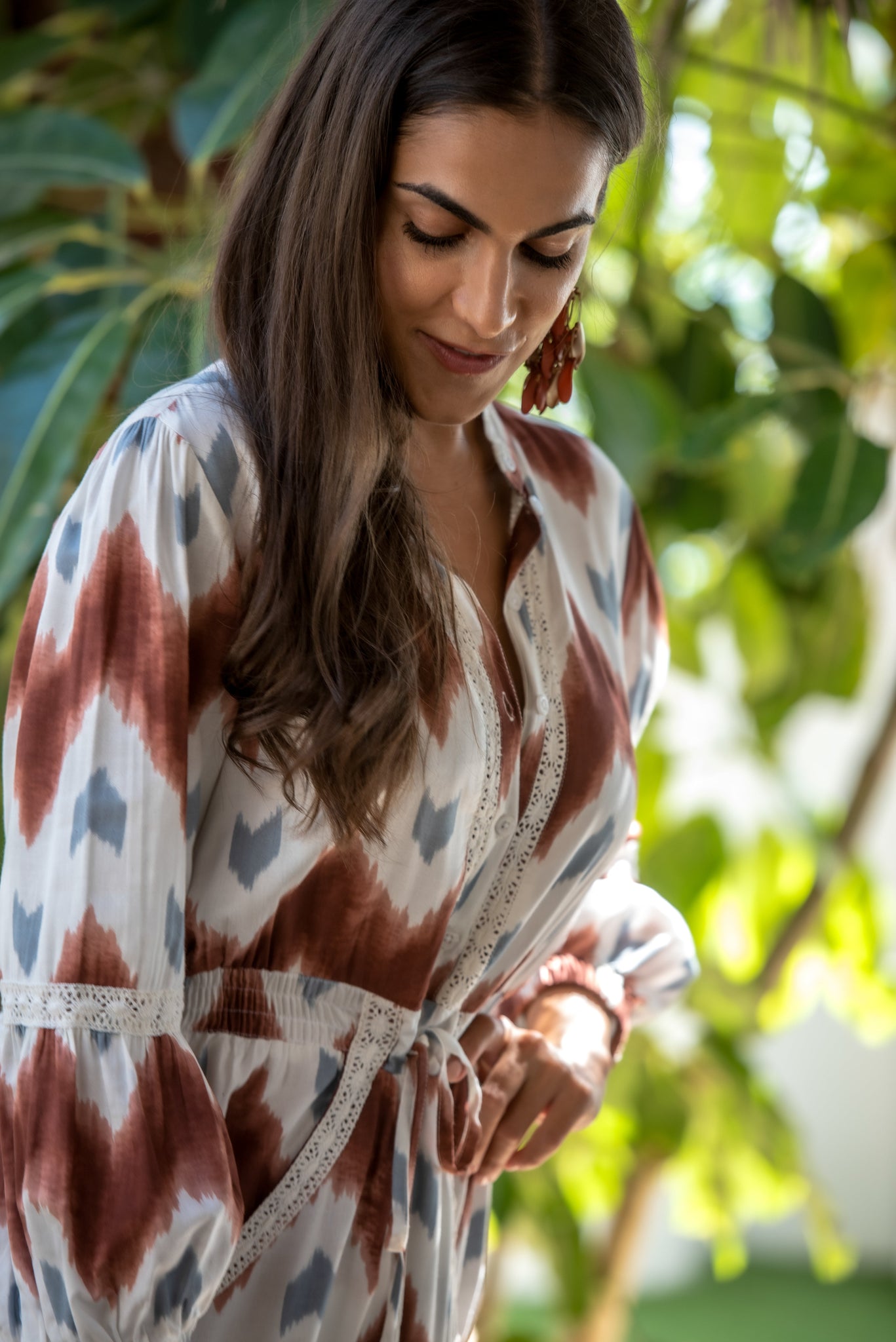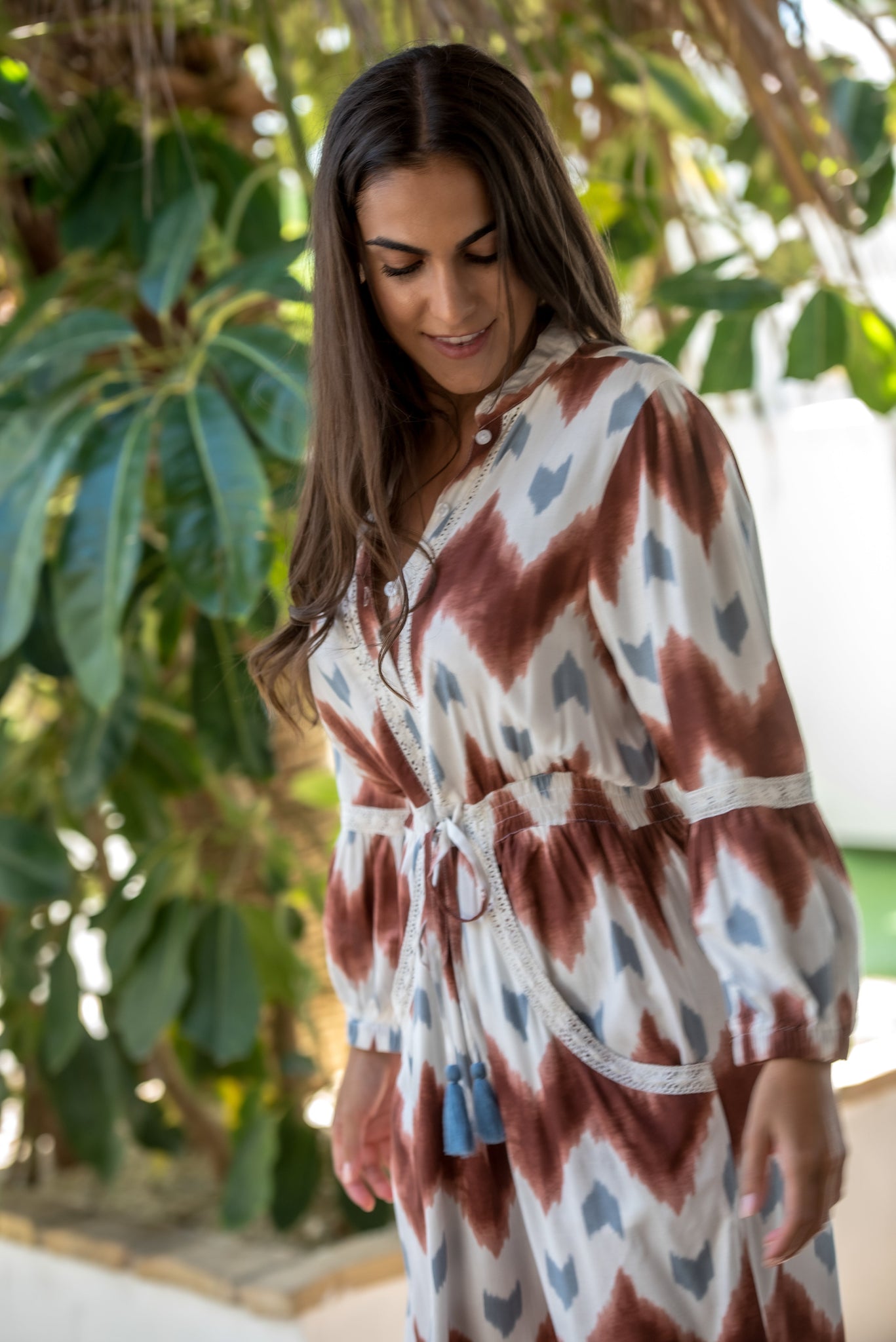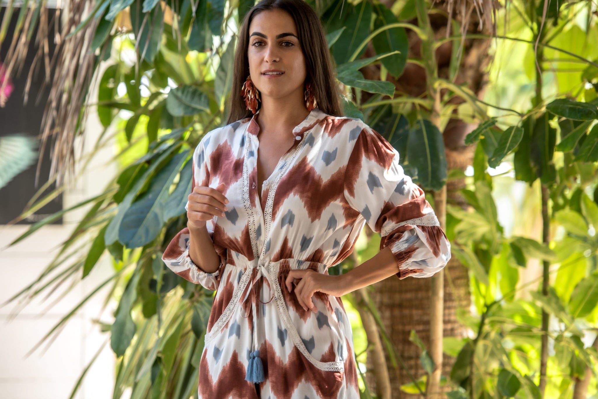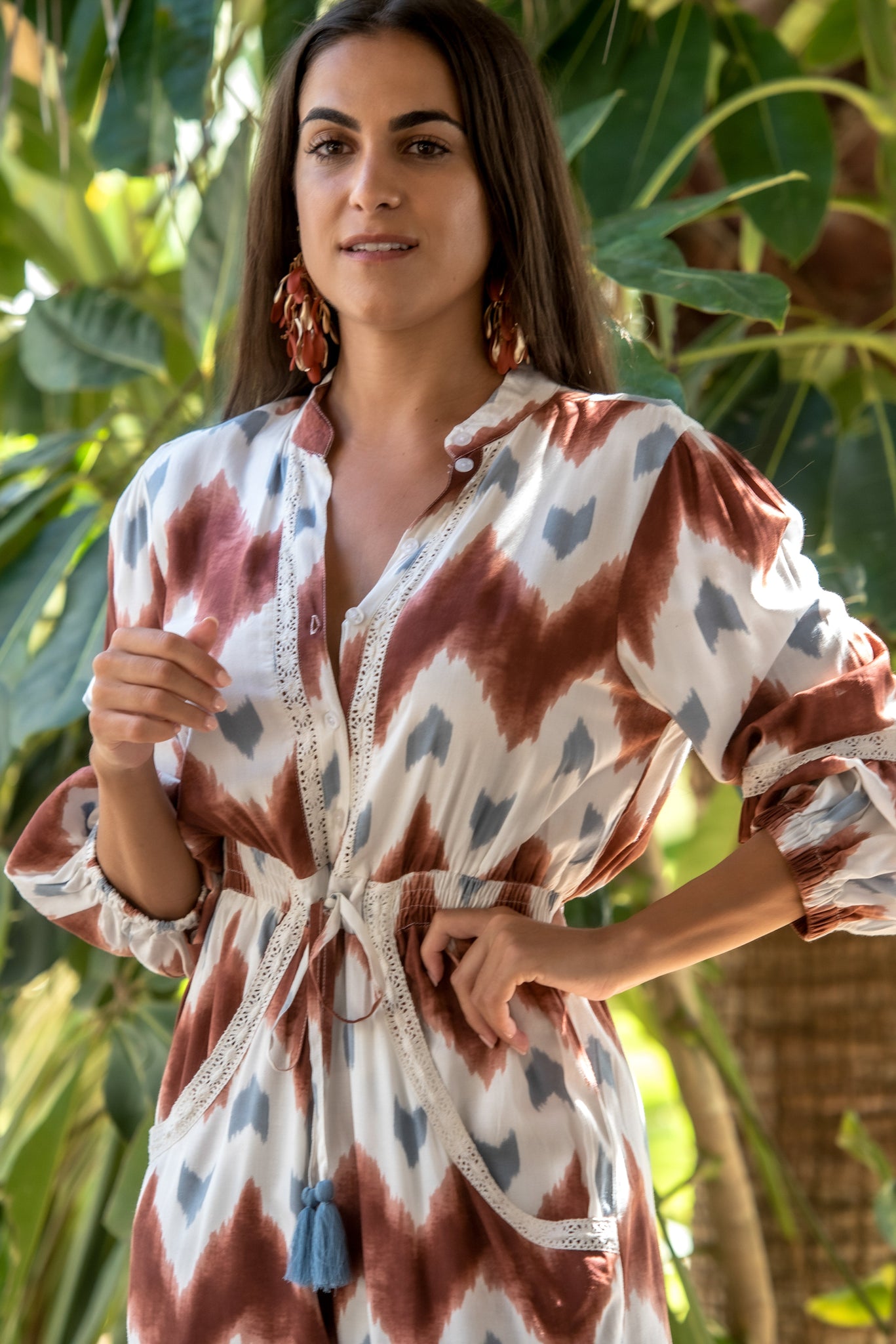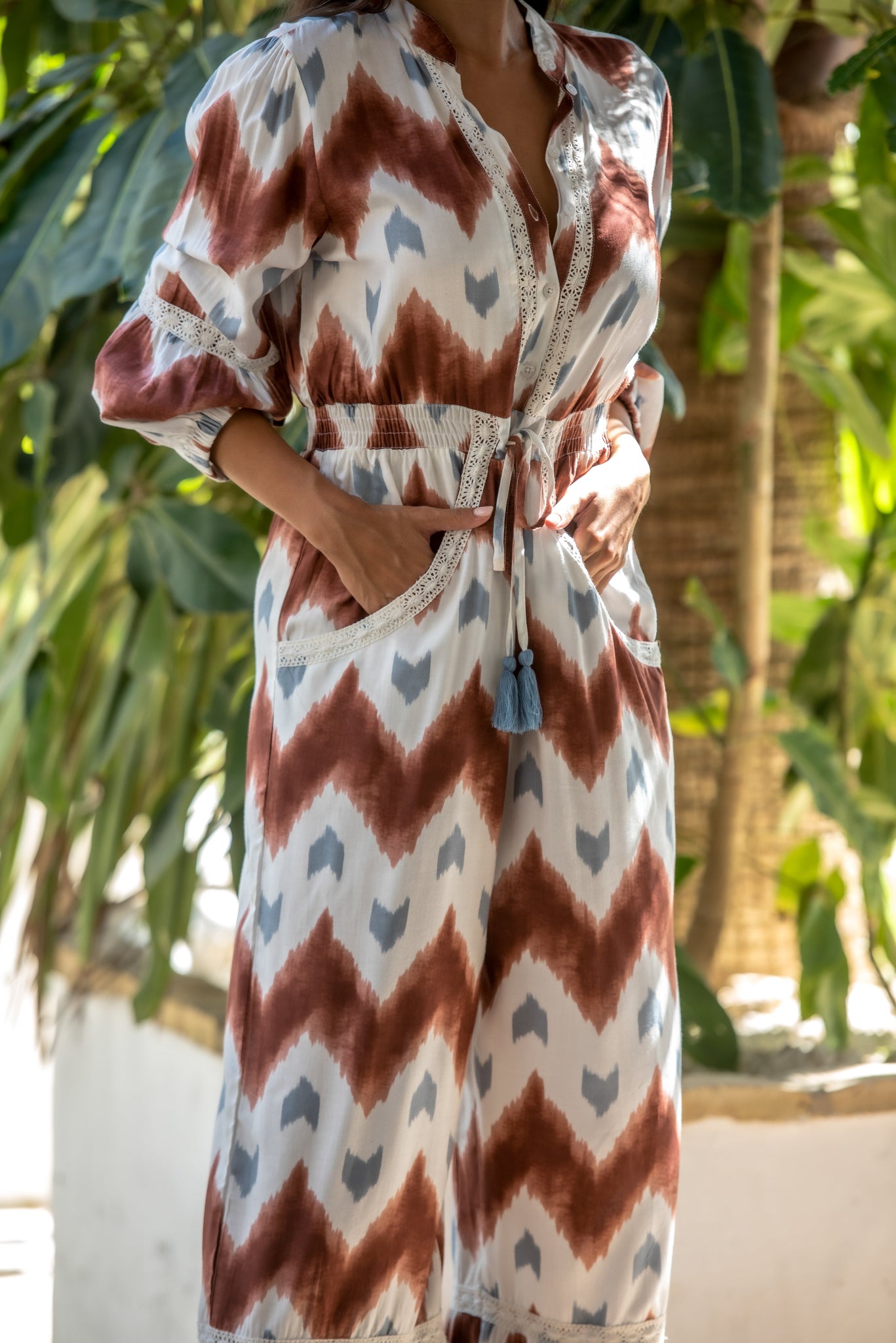 Mono malta de viscosa con bolsillos estampado crudo con guacamayos en tonos pastel y combinado con estampado haciendo hojas en el bajo en los mismos tonos lleva adornos de pasamanería beige.