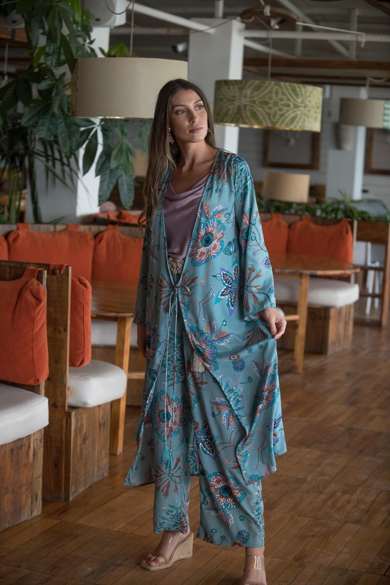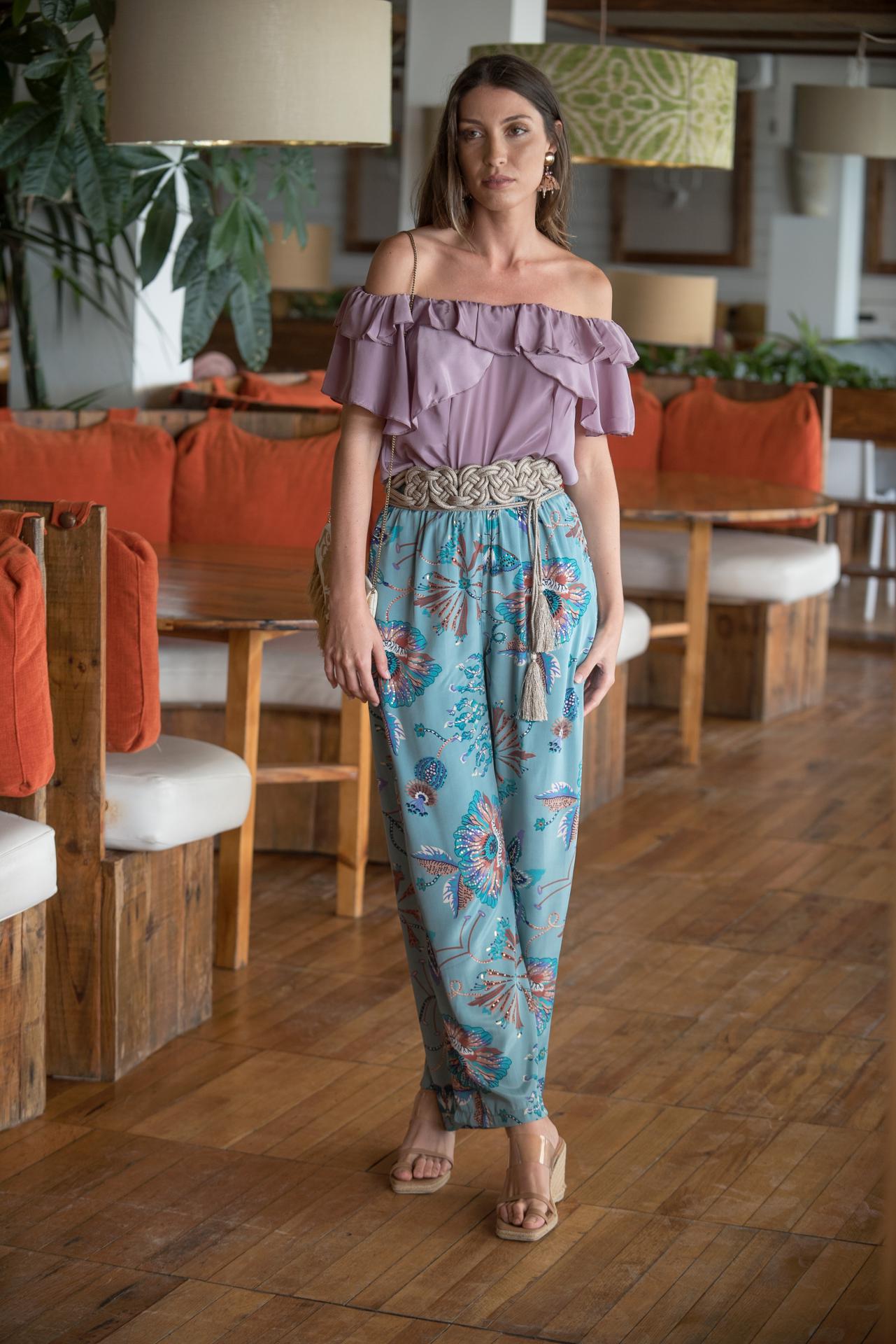 Pantalón fruncido cintura estampado celeste flores malvas