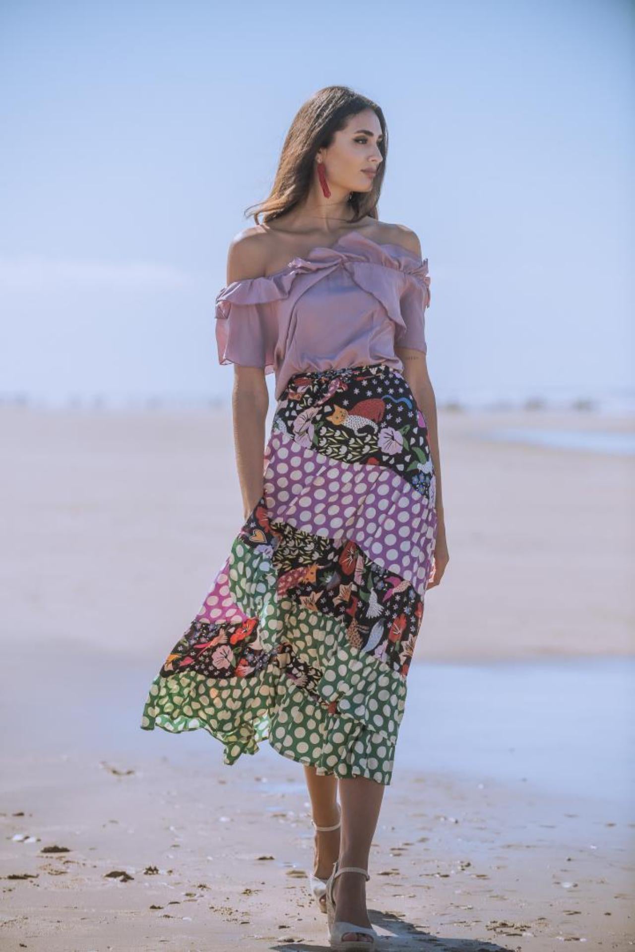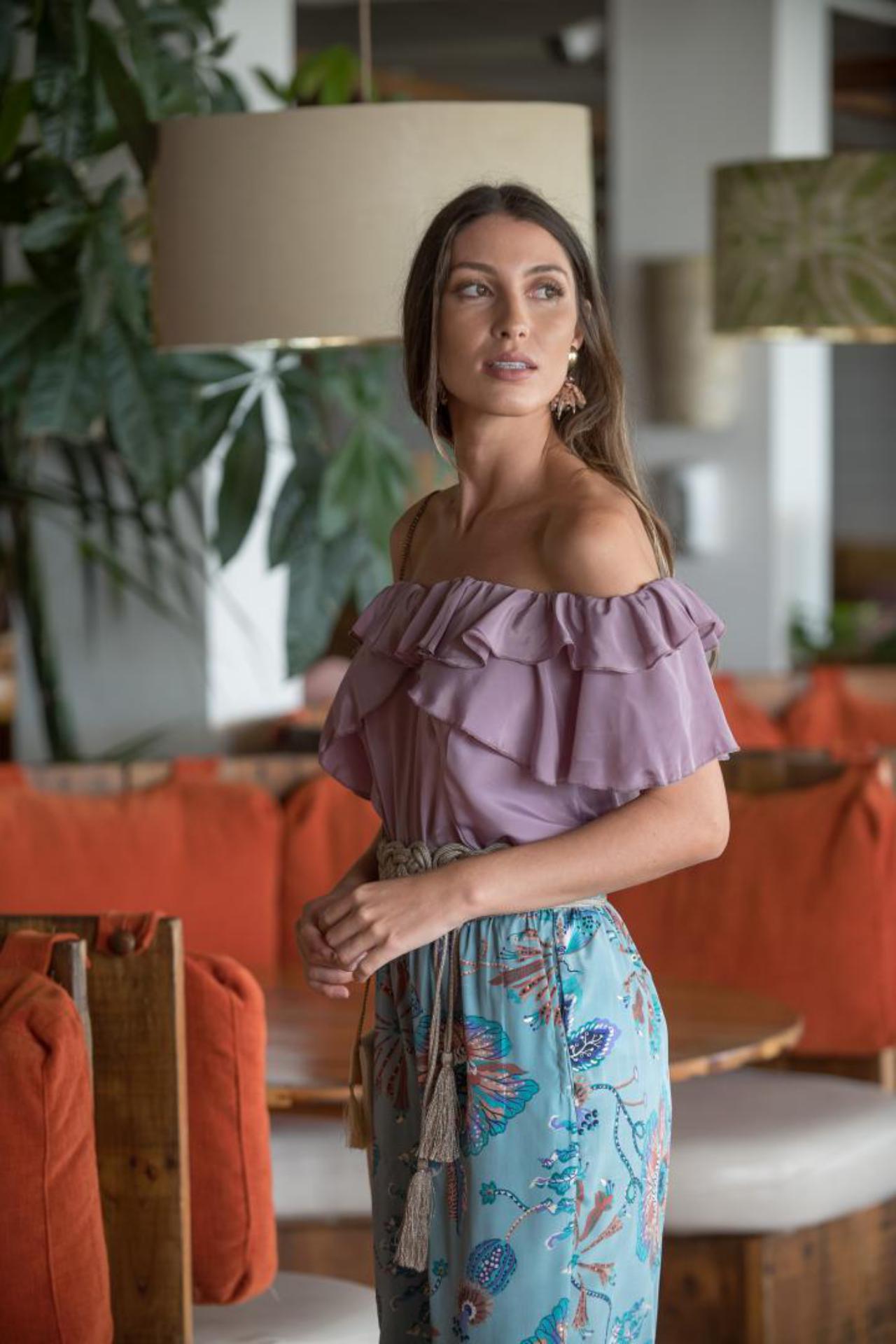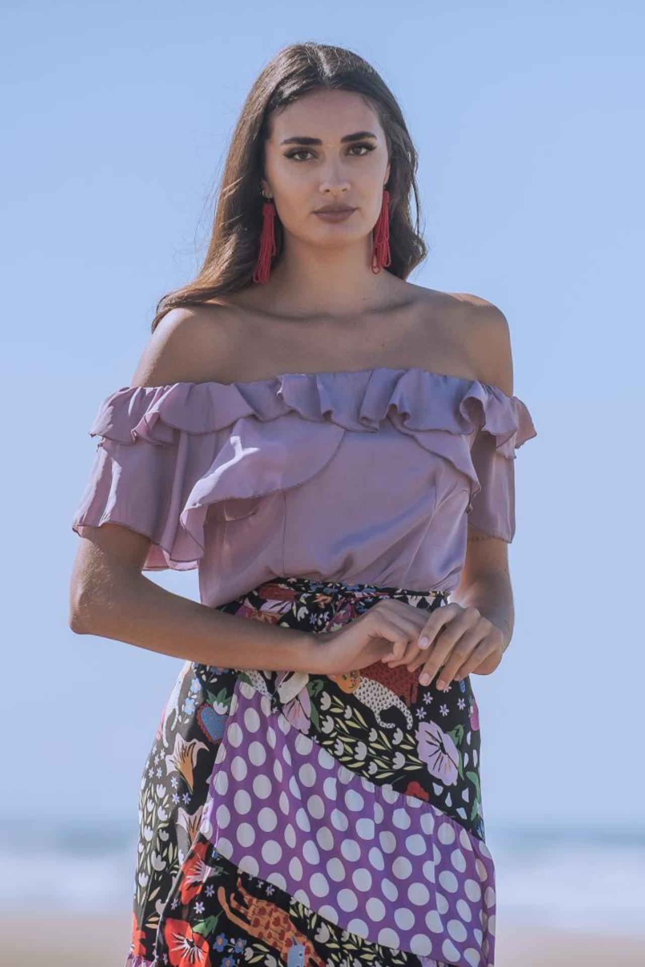 Top escote barco lila sin mangas con doble volante adornando el escote y formando la manga