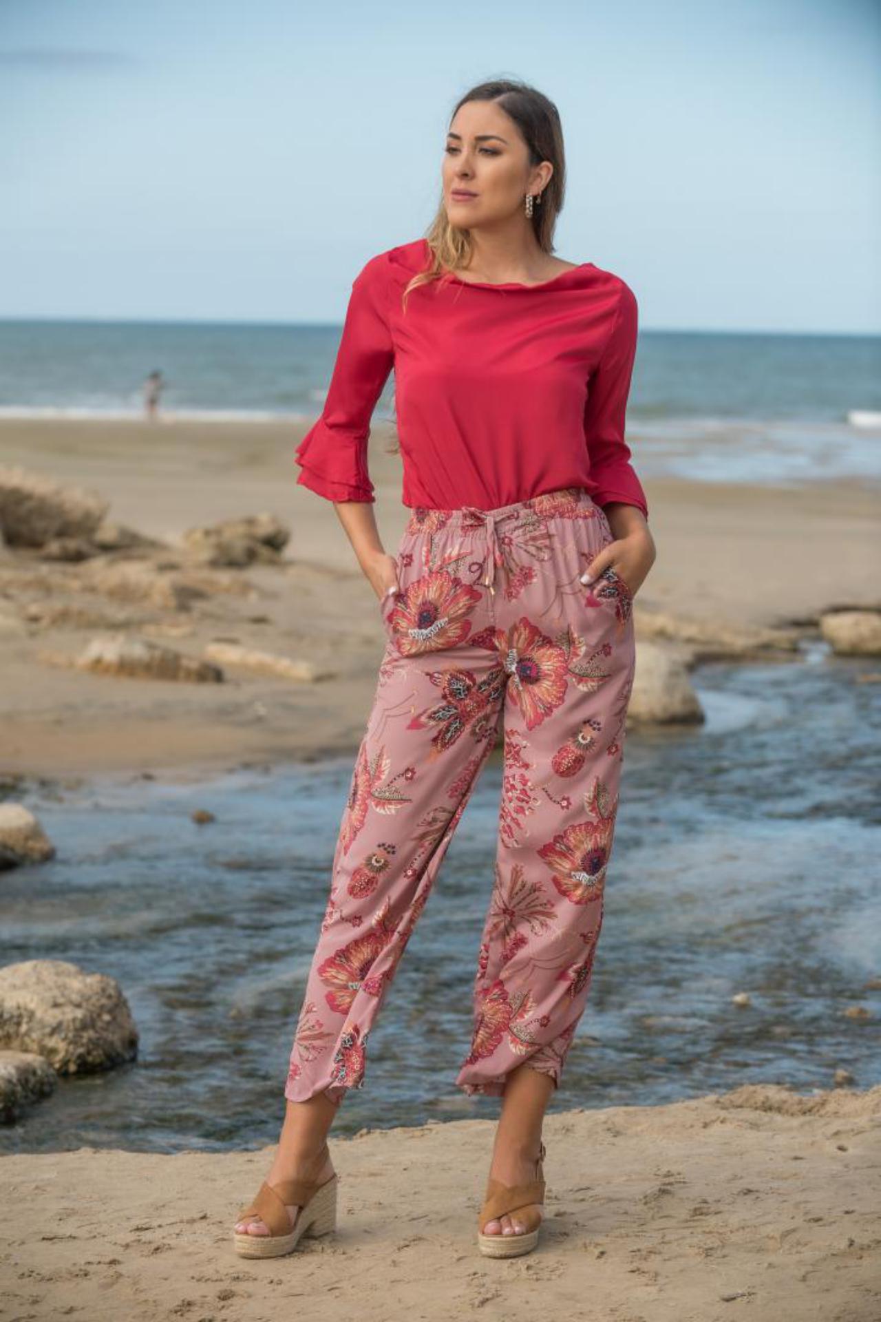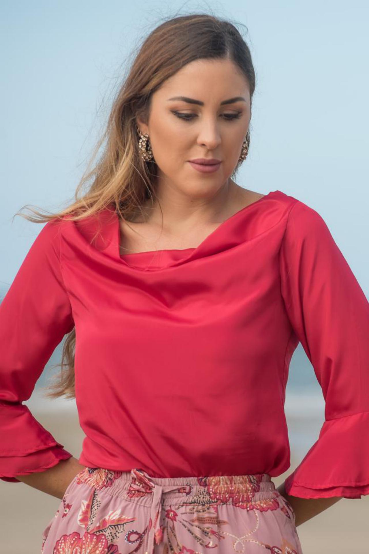 Top en color fresa de media manga con doble volante capa y cuello drapeado columpio