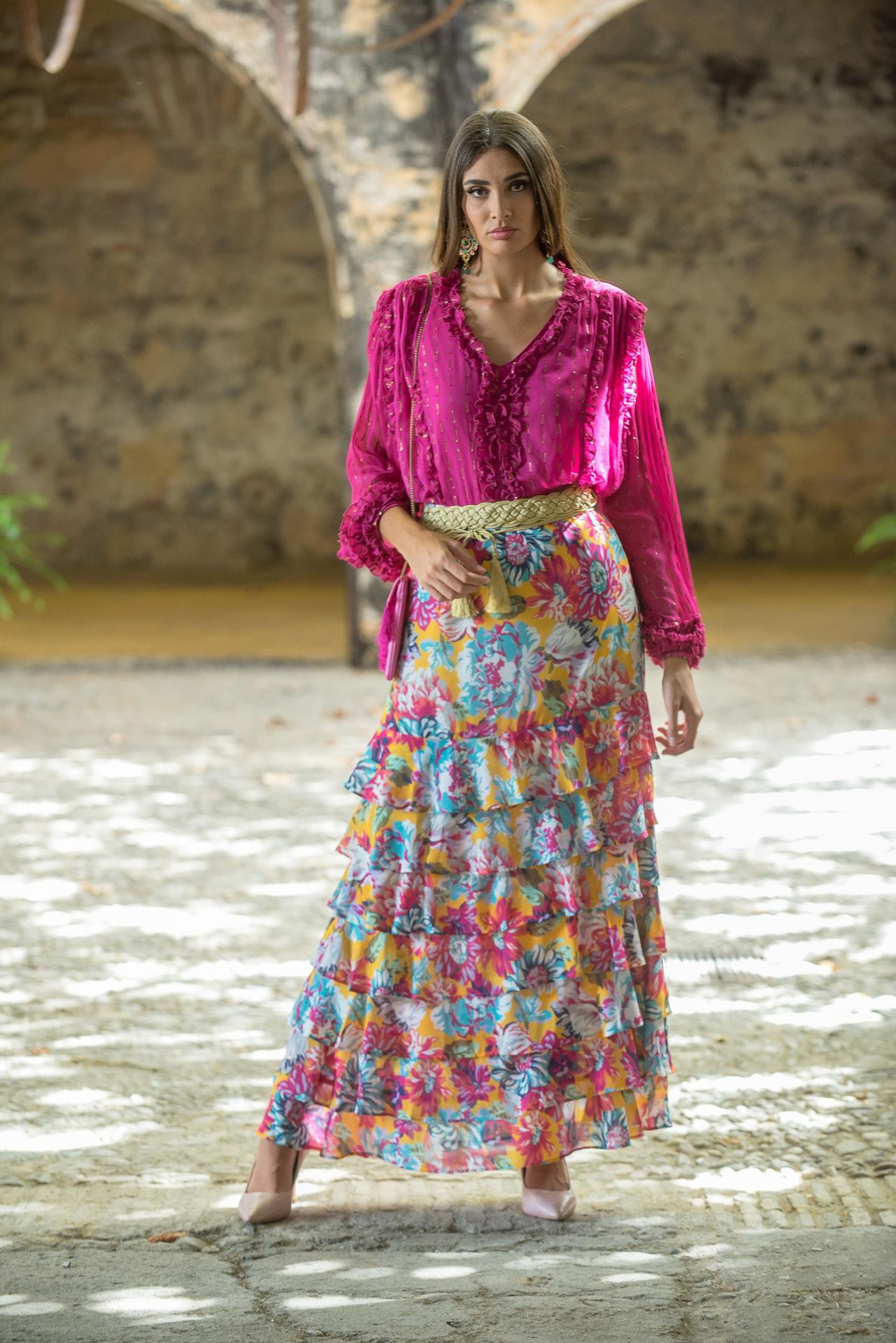 Top de gasa verde agua con fantasía bronce, de manga larga abullonada y adornado con garruchas en ganga y escote