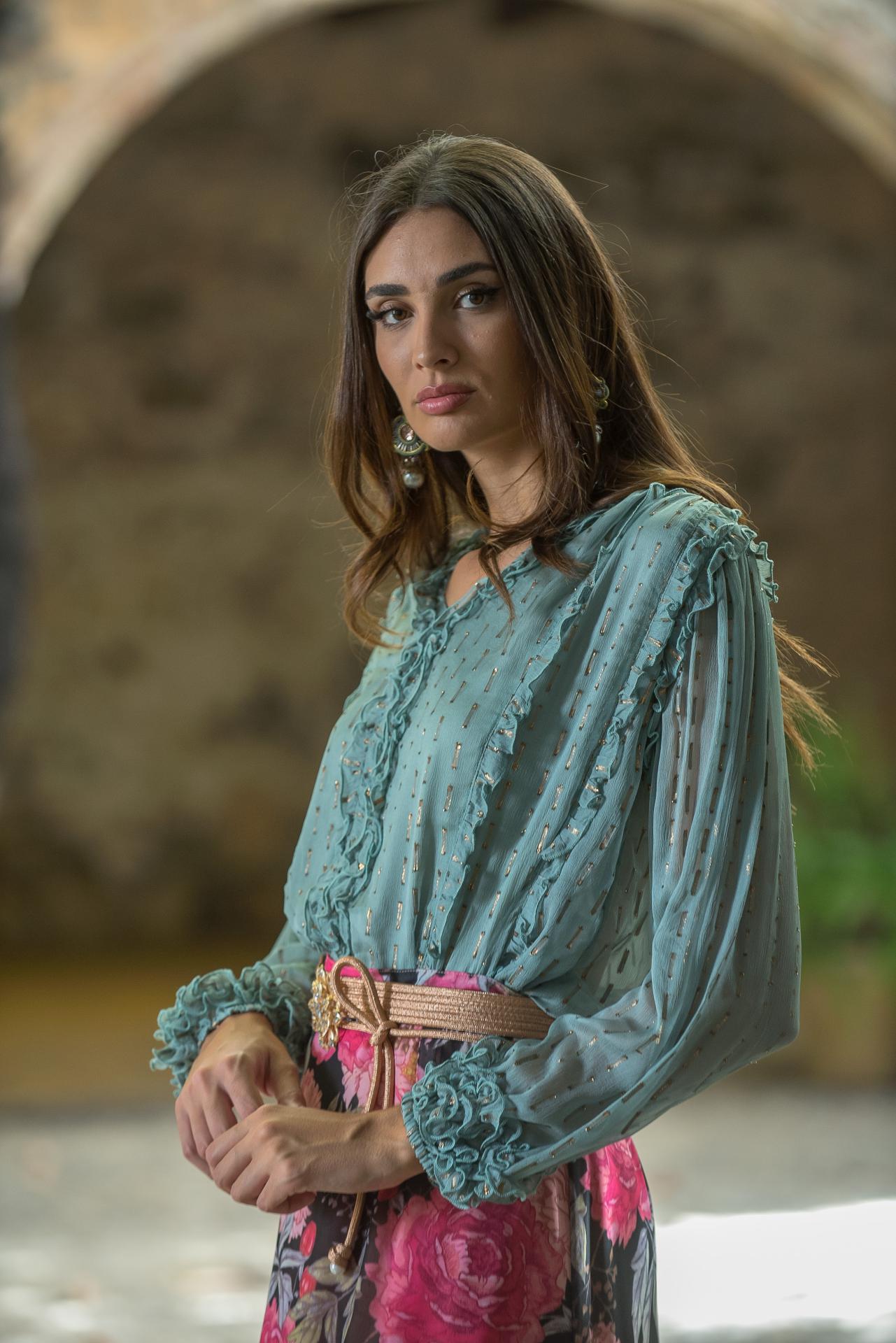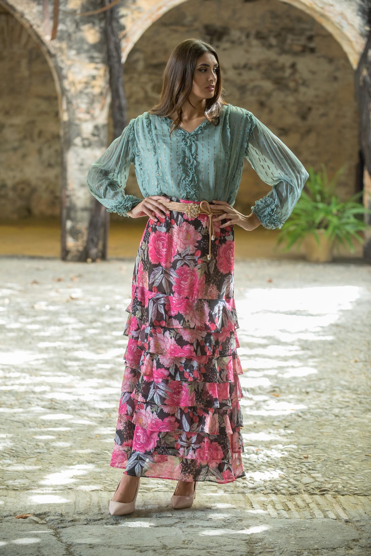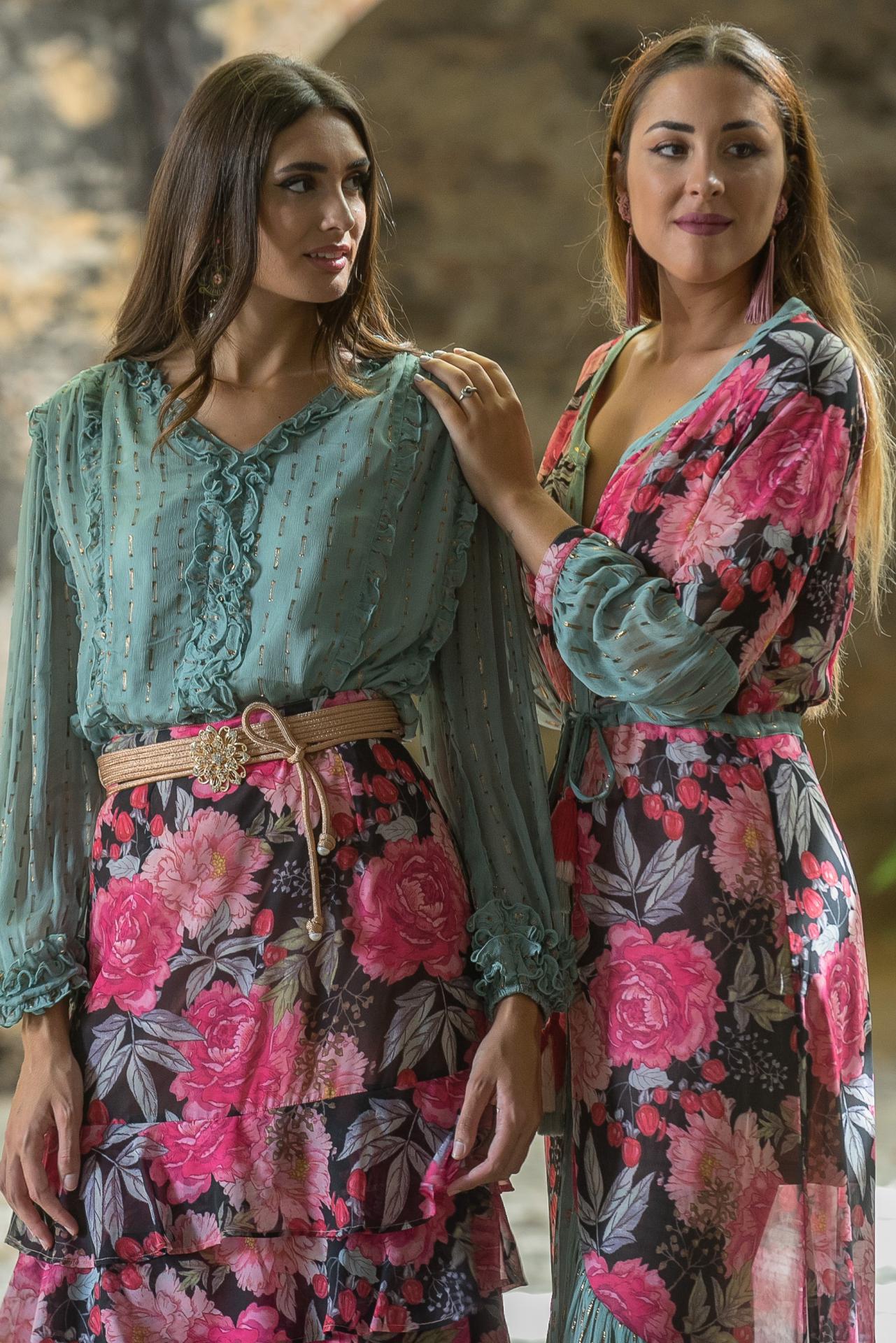 Top de gasa fucsia con fantasía bronce, de manga larga abullonada y adornado con garruchas en ganga y escote