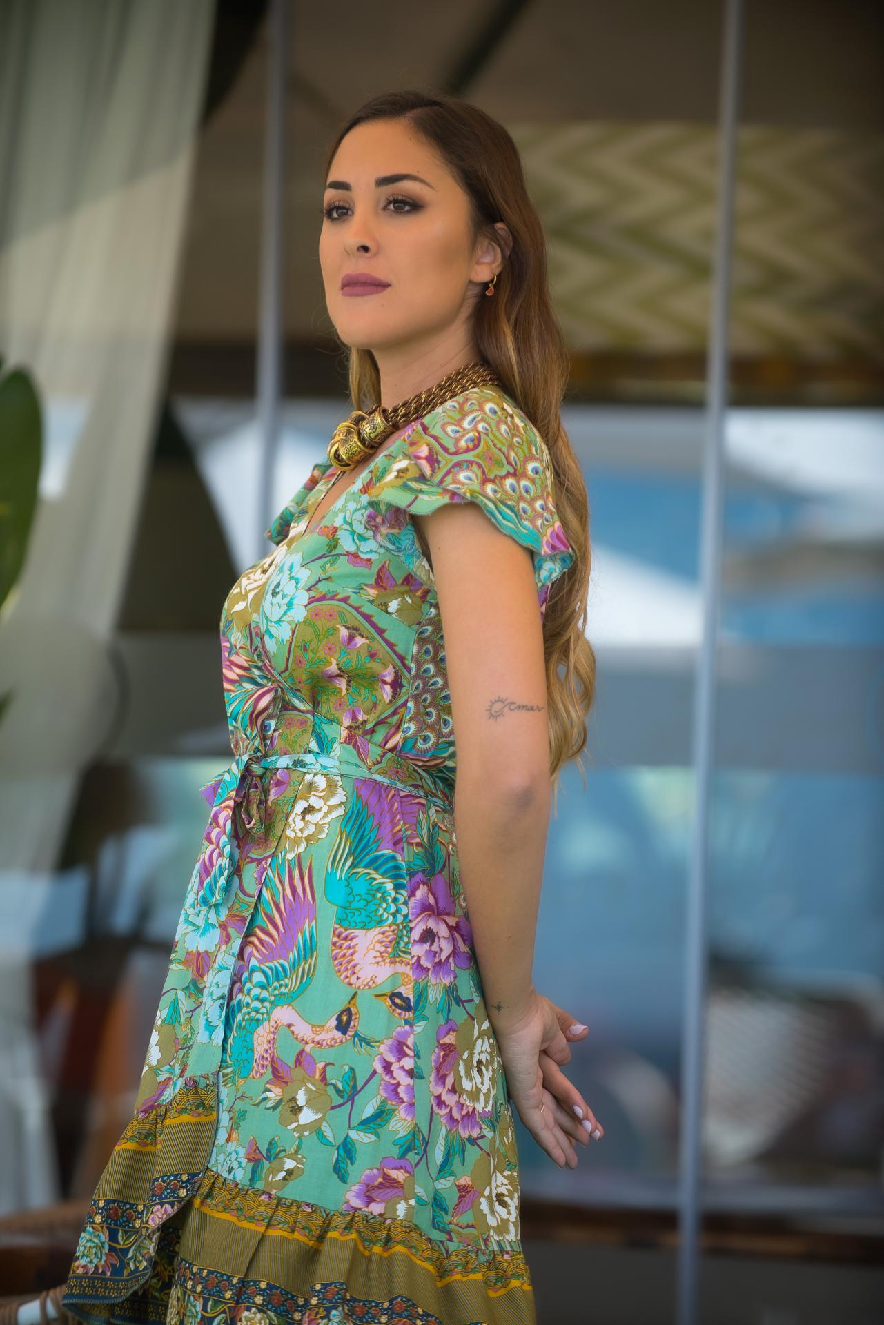 Vestido corto estampado Jardín Japo verde, cruzado terminado en volantito, cuello pico, volantitos en mangas y atado en cintura con lazo
