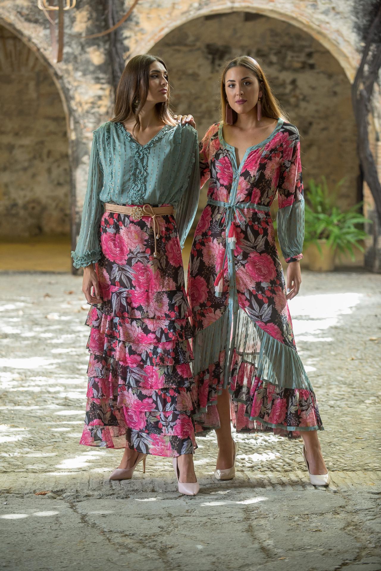 Vestido largo camisero de gasa en estampado flores con manga globo y corte sirena terminado en volantes canasteros combinado en turquesa anudado en la cintura con cordón terminado en borlón de hilo