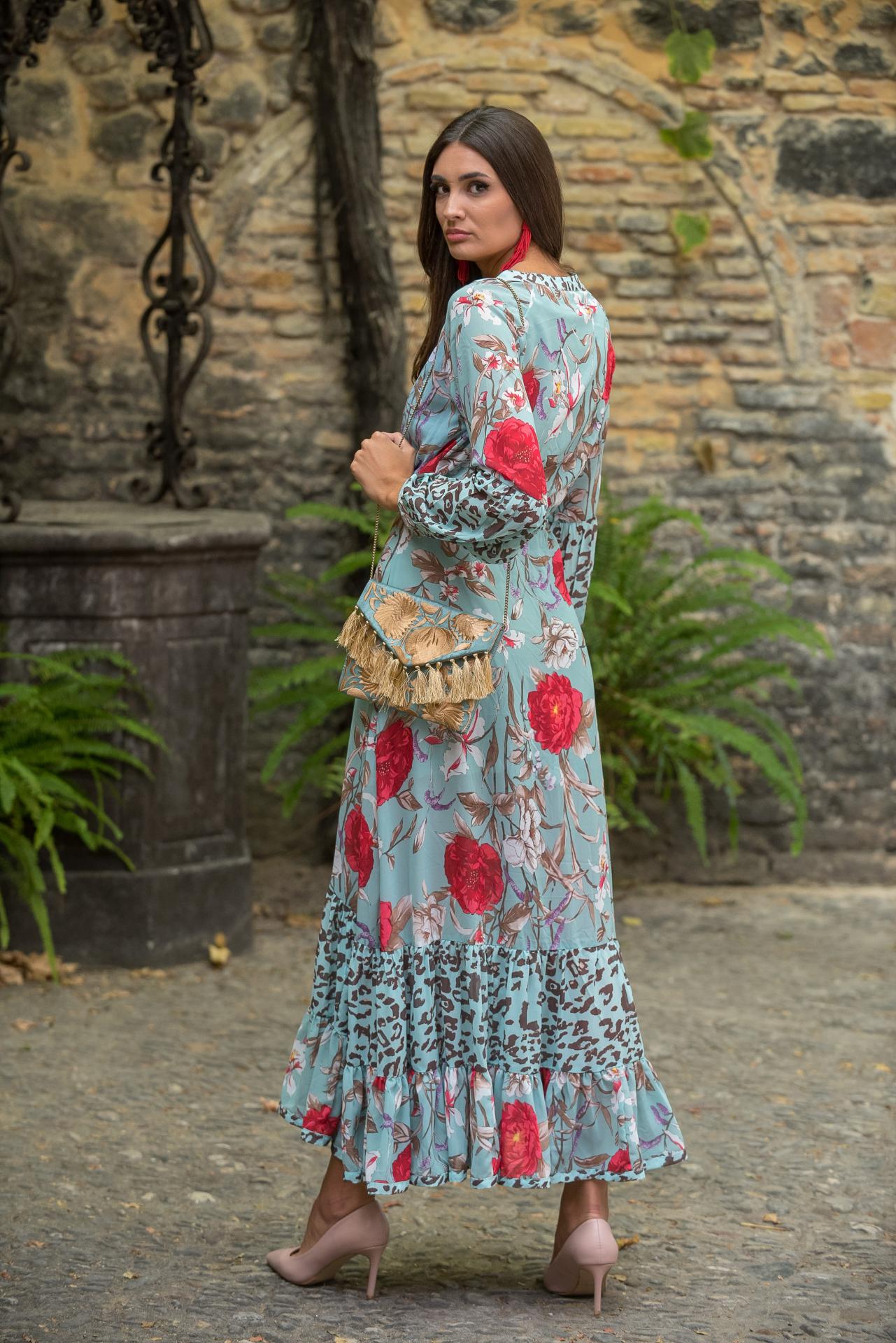 Vestido largo camisero de gasa en estampado turquesa con manga globo y corte sirena terminado en volantes canasteros combinado en animal print de leopardo turquesa anudado en la cintura con cordón terminado en borlón de hilo