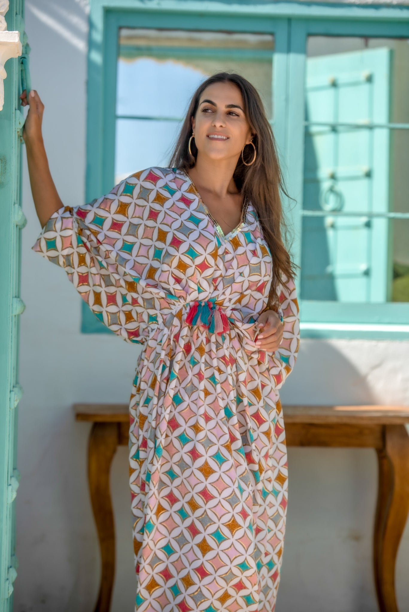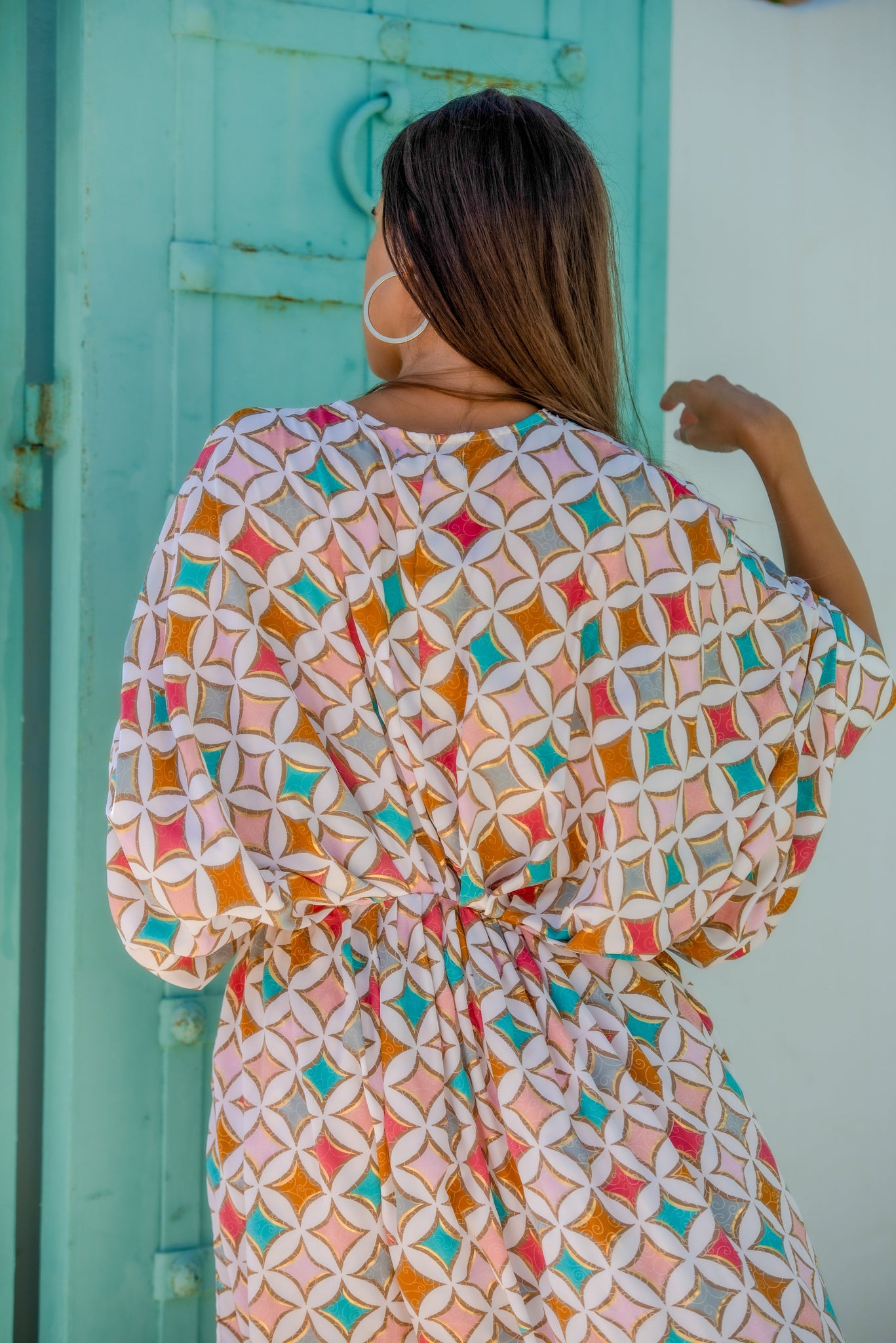 Vestido sigri tunica de polysilk estampado crudo con rombos en corales y verde agua. Manga murciélago aplique de lentejuelas en el escote v y borlones de hilo al los tonos en la cintura.