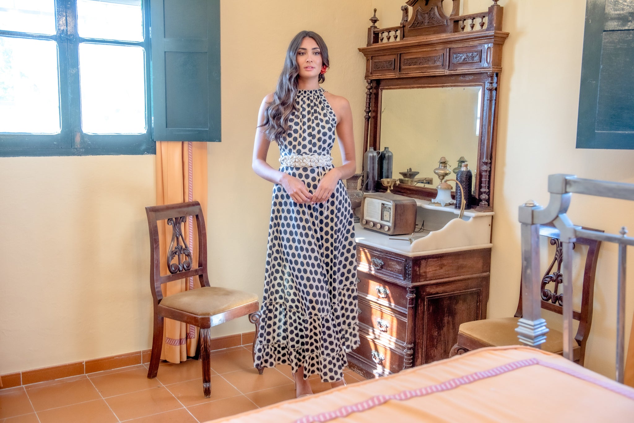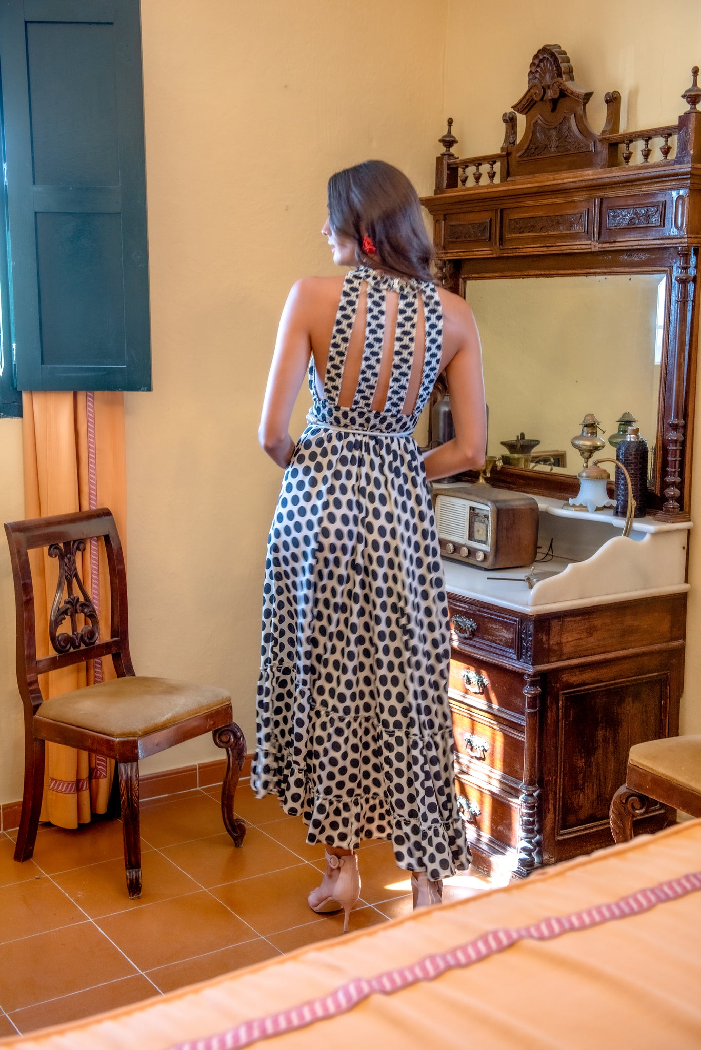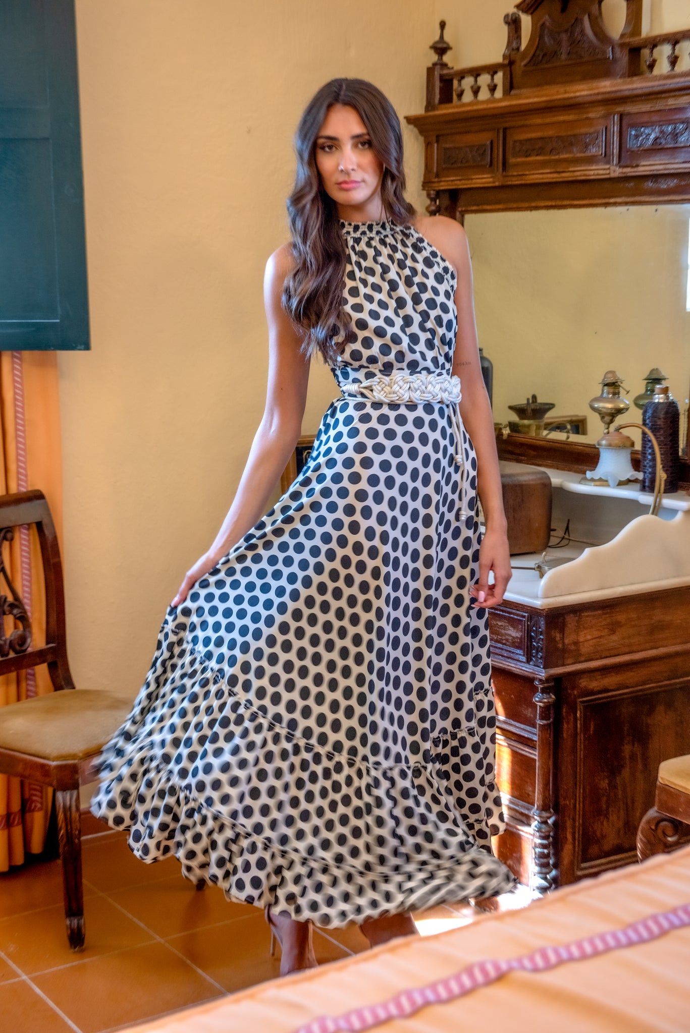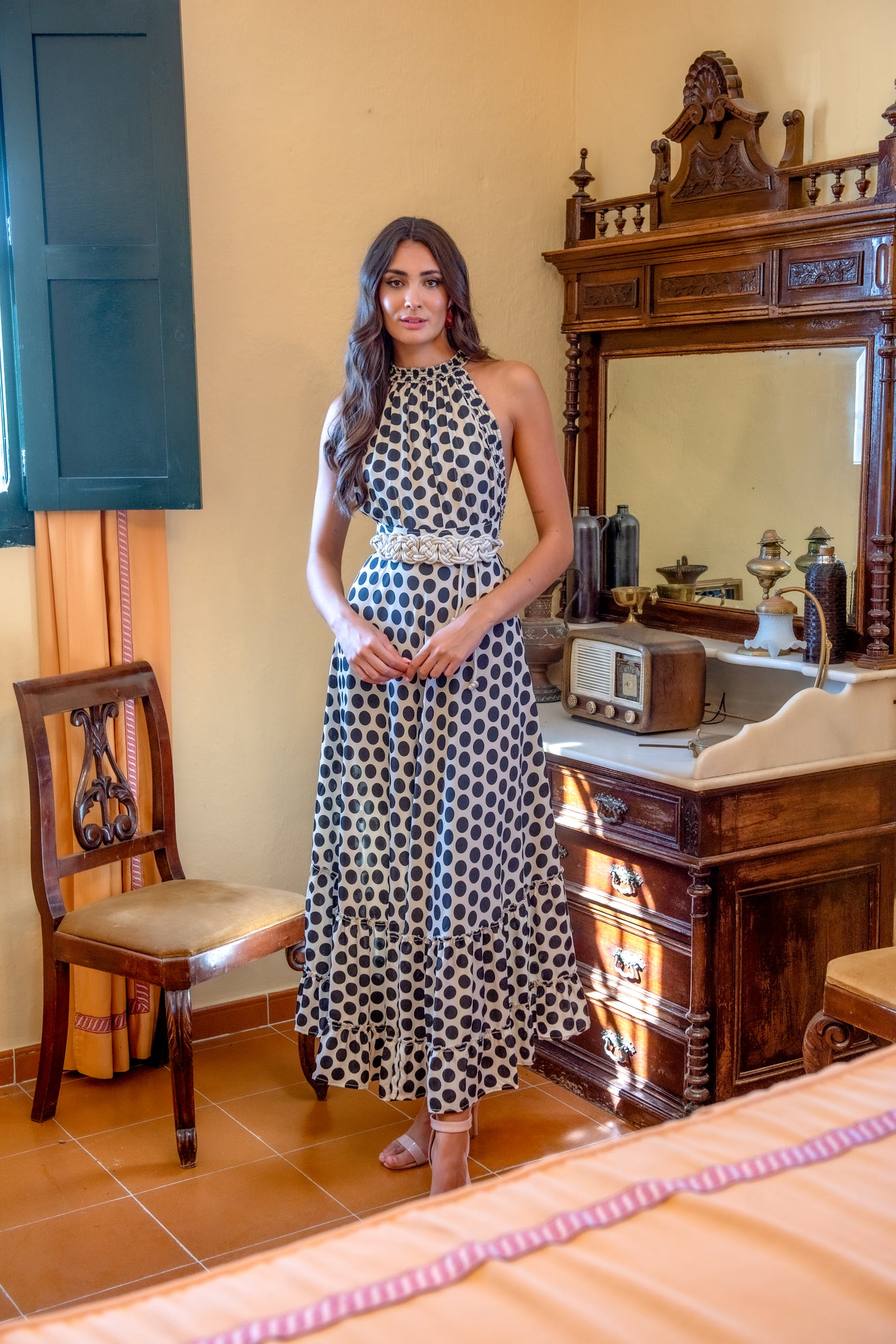 Vestido solera de polysilk fondo crudo y lunares negros espalda descubierta con tiras fruncidas y cuello halter.